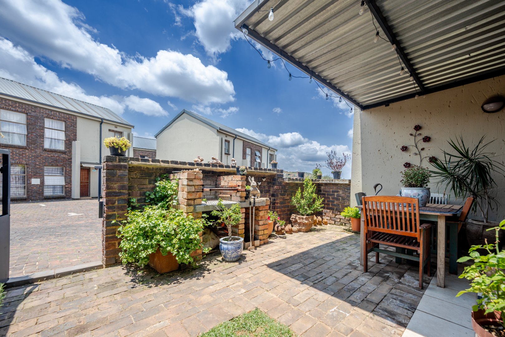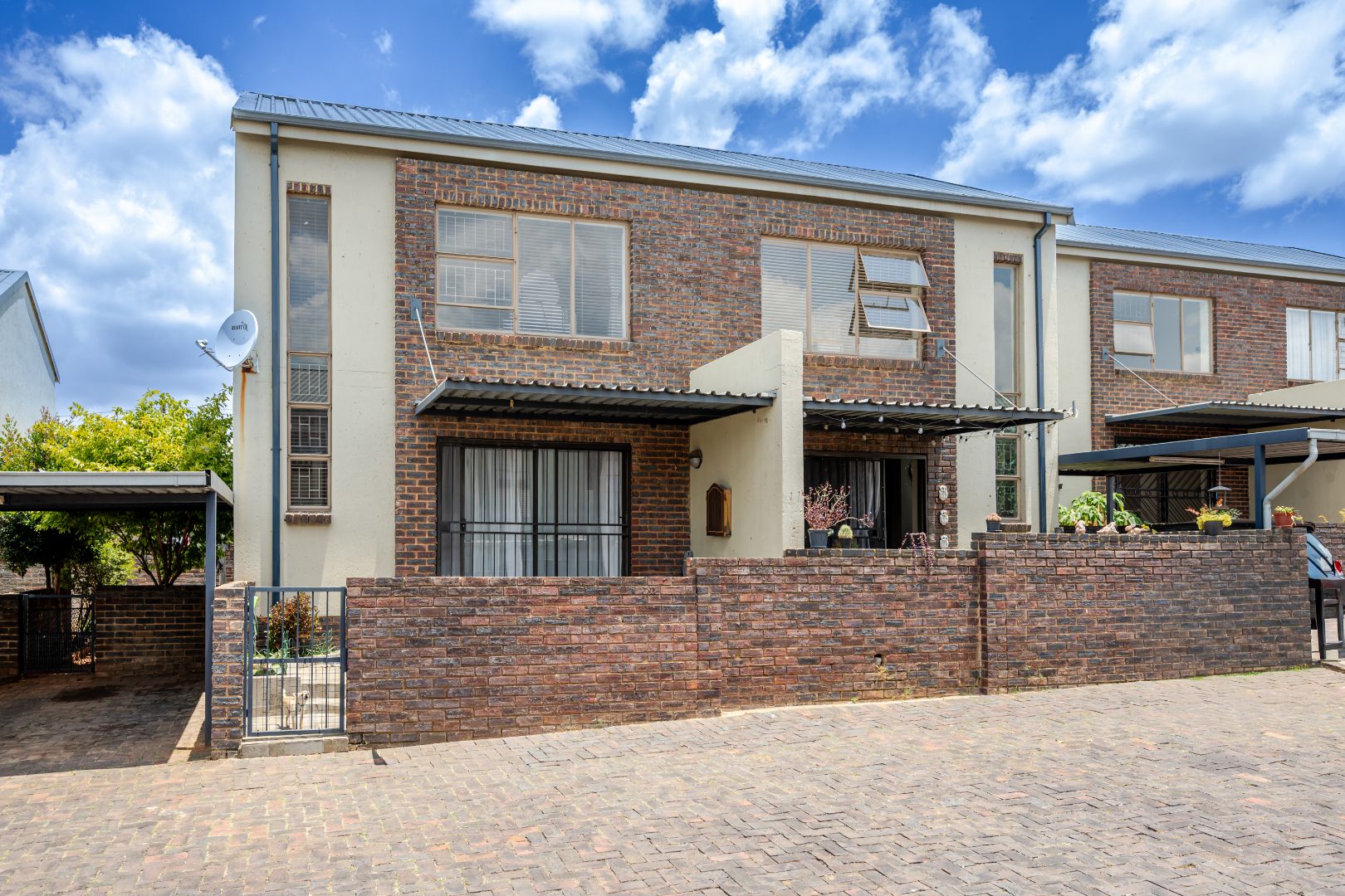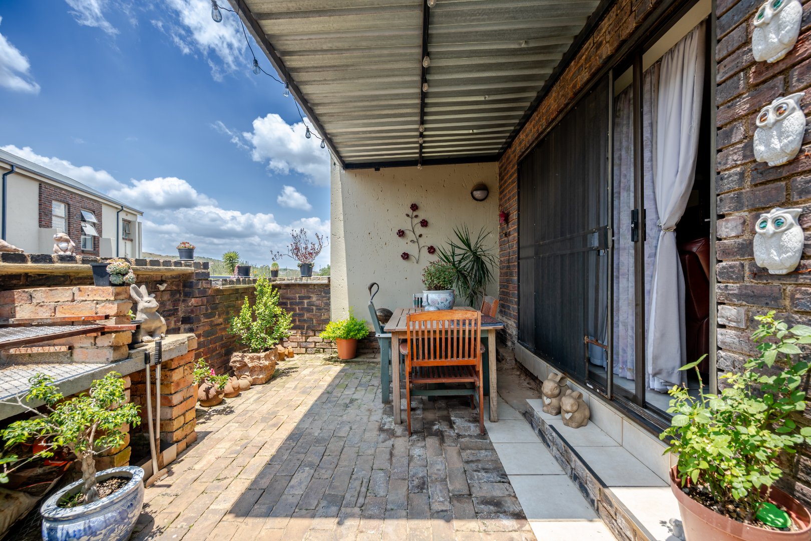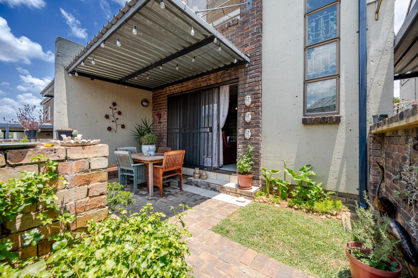 Discover this charming 74 sqm townhouse, ideally situated in a well-maintained complex within a quiet cul-de-sac in Noordheuwel, Krugersdorp. This multi-level residence offers a practical and comfortable living environment, perfect for individuals or small families seeking a secure and convenient lifestyle. The exterior features a durable brick and stucco facade, complemented by covered entrance areas and carports, providing sheltered parking for two vehicles. Step inside to an inviting open-plan living space, where tiled flooring flows seamlessly throughout, ensuring easy maintenance. The functional kitchen boasts modern white cabinetry, a built-in oven, hob, and extractor fan, catering to your culinary needs. A decorative wooden slat room divider subtly separates the dining area from the spacious living room, which benefits from ample natural light and direct access to the outdoor patio through a large sliding glass door. The home comprises two comfortable bedrooms and a single well-appointed bathroom. One of the standout features of this property is the private outdoor entertainment area. This spacious, paved patio includes a covered section with ambient string lights, a built-in braai, and plenty of room for outdoor dining. It's an ideal spot for relaxation and entertaining, offering views of the surrounding hills. The property also includes a small, low-maintenance garden. Security is a priority, with the complex featuring a security post, access gate, electric fencing, and 24-hour security. For added peace of mind, the unit is equipped with security bars on ground-level windows and doors, and a security gate on the patio's sliding door. Furthermore, the inclusion of a battery inverter system provides essential backup power, enhancing the home's sustainability and convenience. Pets are allowed, making this a welcoming space for your furry companions. Key Features: * 2 Bedrooms, 1 Bathroom * 74 sqm Floor Size * 2 Covered Parking Bays * Private Paved Patio with Built-in Braai * Battery Inverter System * 24-Hour Security Complex * Open-Plan Living Area * Pet-Friendly * Located in a Cul-de-Sac