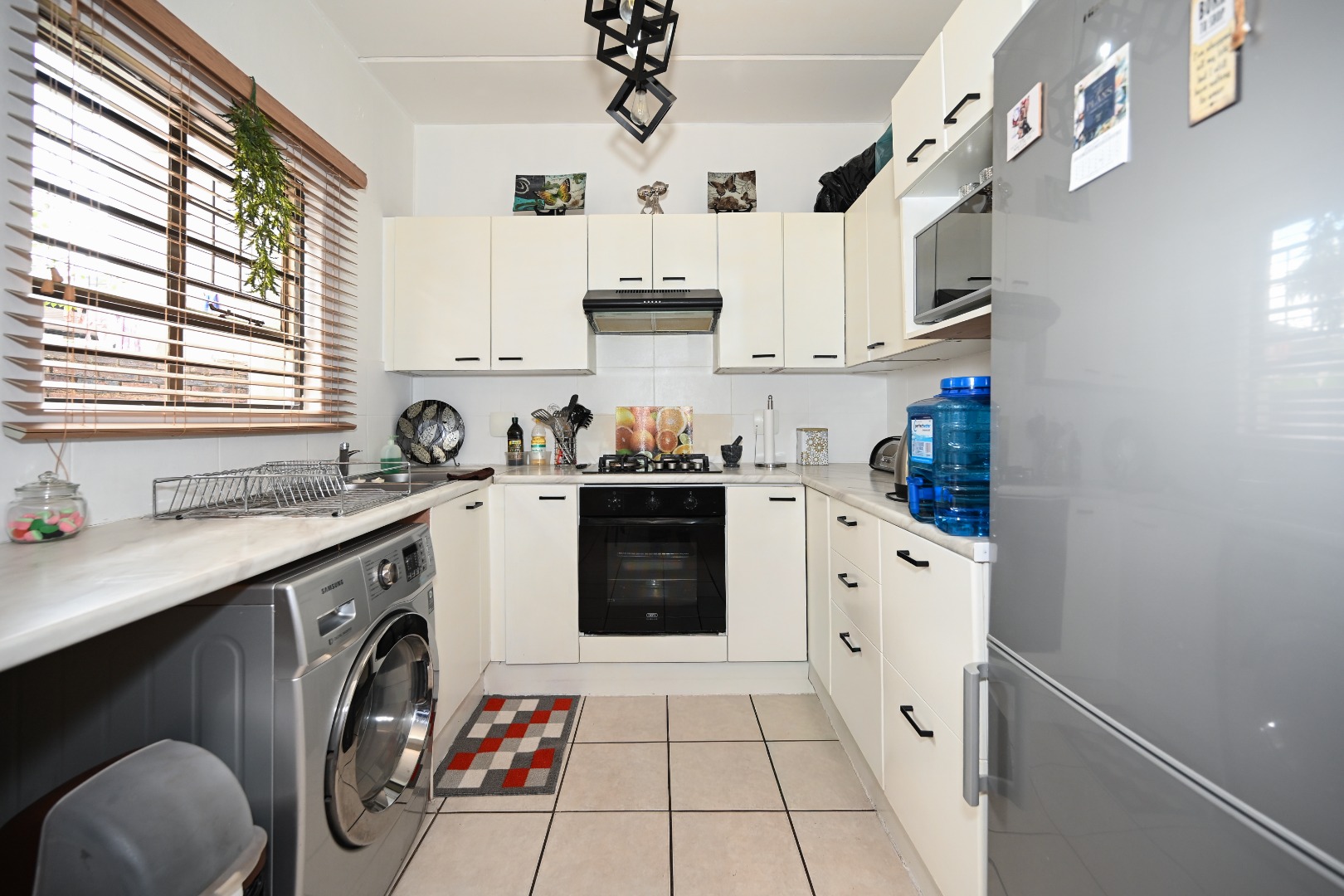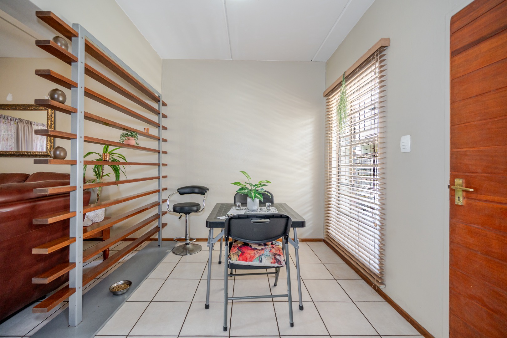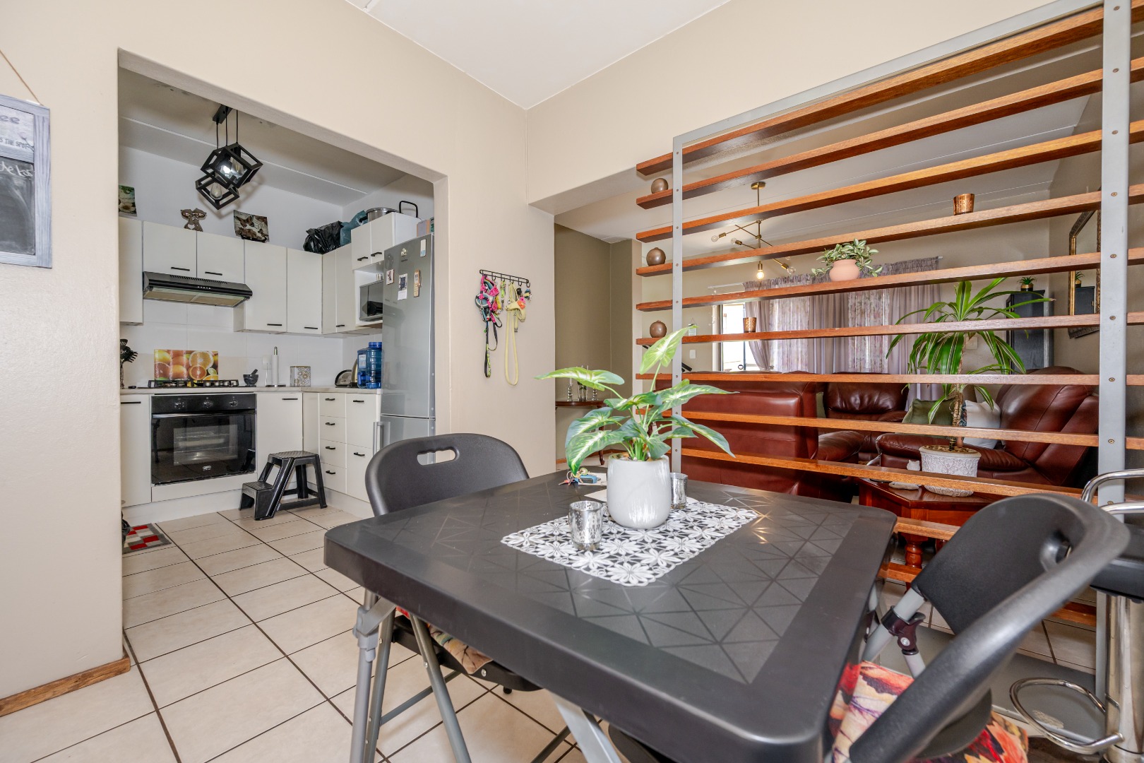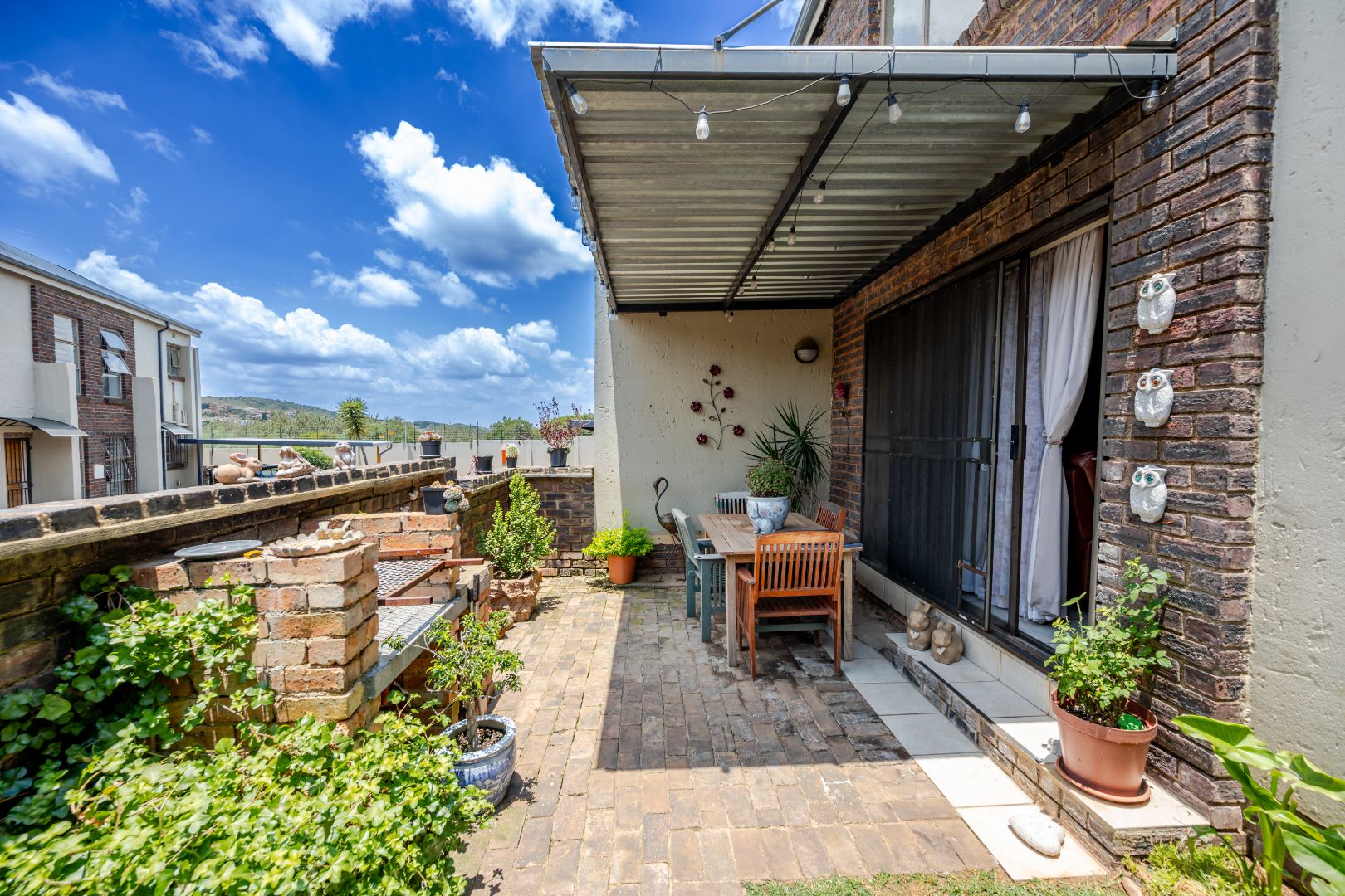 Discover this charming 74 sqm townhouse, ideally situated in a well-maintained complex within a quiet cul-de-sac in Noordheuwel, Krugersdorp. This multi-level residence offers a practical and comfortable living environment, perfect for individuals or small families seeking a secure and convenient lifestyle. The exterior features a durable brick and stucco facade, complemented by covered entrance areas and carports, providing sheltered parking for two vehicles. Step inside to an inviting open-plan living space, where tiled flooring flows seamlessly throughout, ensuring easy maintenance. The functional kitchen boasts modern white cabinetry, a built-in oven, hob, and extractor fan, catering to your culinary needs. A decorative wooden slat room divider subtly separates the dining area from the spacious living room, which benefits from ample natural light and direct access to the outdoor patio through a large sliding glass door. The home comprises two comfortable bedrooms and a single well-appointed bathroom. One of the standout features of this property is the private outdoor entertainment area. This spacious, paved patio includes a covered section with ambient string lights, a built-in braai, and plenty of room for outdoor dining. It's an ideal spot for relaxation and entertaining, offering views of the surrounding hills. The property also includes a small, low-maintenance garden. Security is a priority, with the complex featuring a security post, access gate, electric fencing, and 24-hour security. For added peace of mind, the unit is equipped with security bars on ground-level windows and doors, and a security gate on the patio's sliding door. Furthermore, the inclusion of a battery inverter system provides essential backup power, enhancing the home's sustainability and convenience. Pets are allowed, making this a welcoming space for your furry companions. Key Features: * 2 Bedrooms, 1 Bathroom * 74 sqm Floor Size * 2 Covered Parking Bays * Private Paved Patio with Built-in Braai * Battery Inverter System * 24-Hour Security Complex * Open-Plan Living Area * Pet-Friendly * Located in a Cul-de-Sac