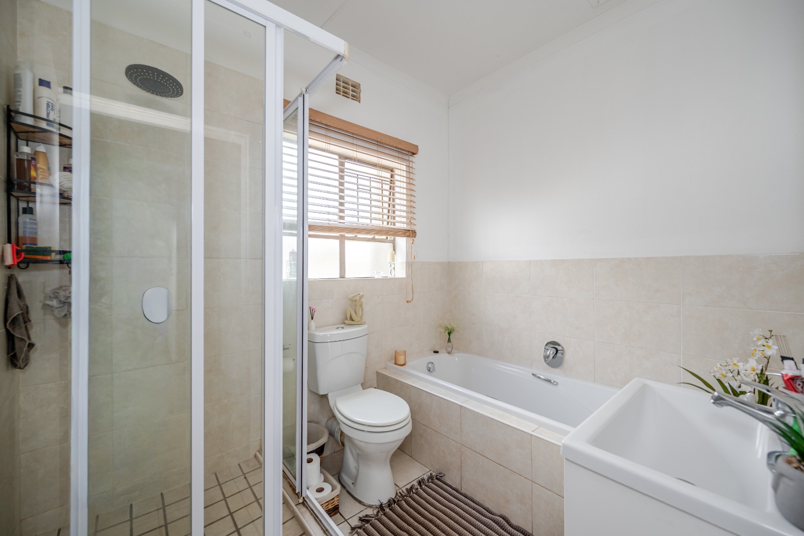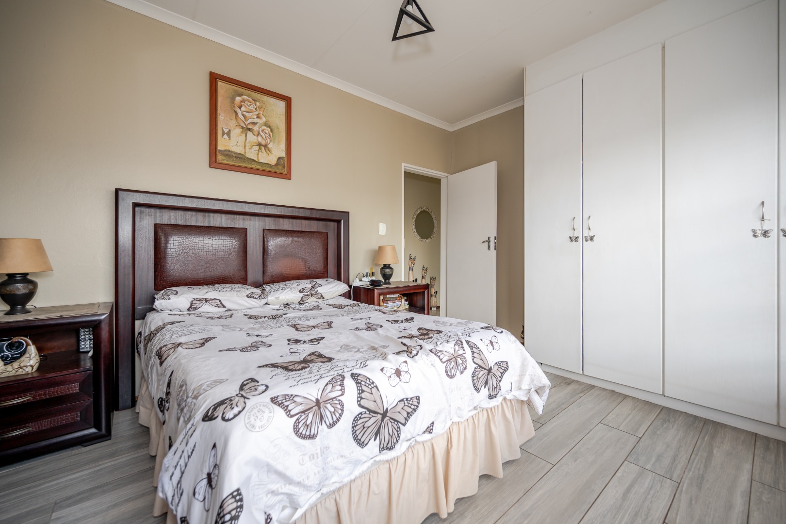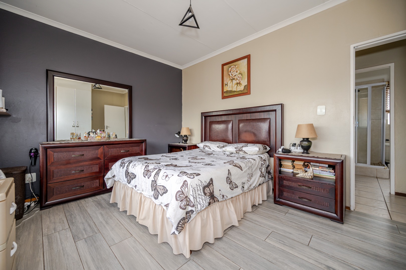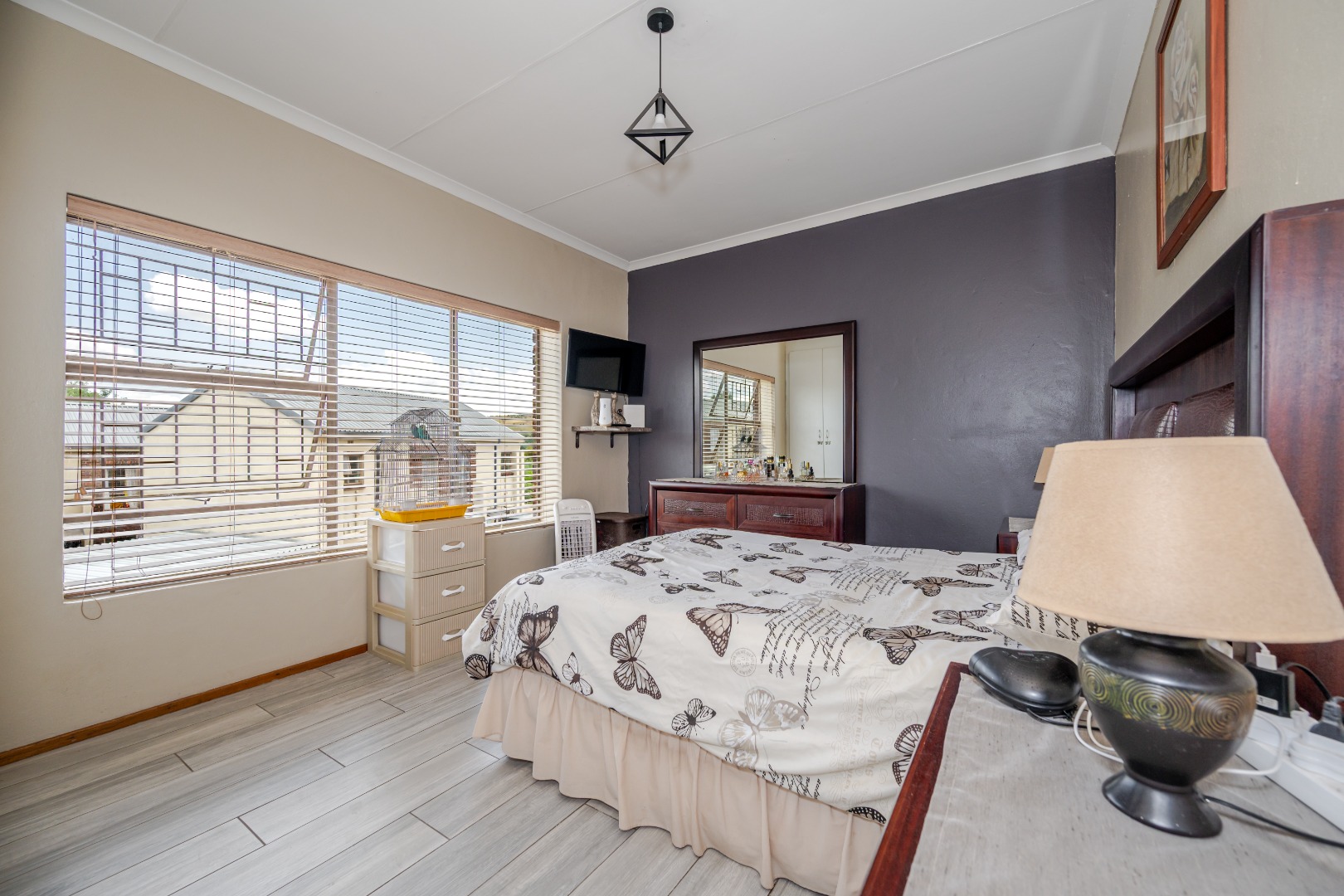 Discover this charming 74 sqm townhouse, ideally situated in a well-maintained complex within a quiet cul-de-sac in Noordheuwel, Krugersdorp. This multi-level residence offers a practical and comfortable living environment, perfect for individuals or small families seeking a secure and convenient lifestyle. The exterior features a durable brick and stucco facade, complemented by covered entrance areas and carports, providing sheltered parking for two vehicles. Step inside to an inviting open-plan living space, where tiled flooring flows seamlessly throughout, ensuring easy maintenance. The functional kitchen boasts modern white cabinetry, a built-in oven, hob, and extractor fan, catering to your culinary needs. A decorative wooden slat room divider subtly separates the dining area from the spacious living room, which benefits from ample natural light and direct access to the outdoor patio through a large sliding glass door. The home comprises two comfortable bedrooms and a single well-appointed bathroom. One of the standout features of this property is the private outdoor entertainment area. This spacious, paved patio includes a covered section with ambient string lights, a built-in braai, and plenty of room for outdoor dining. It's an ideal spot for relaxation and entertaining, offering views of the surrounding hills. The property also includes a small, low-maintenance garden. Security is a priority, with the complex featuring a security post, access gate, electric fencing, and 24-hour security. For added peace of mind, the unit is equipped with security bars on ground-level windows and doors, and a security gate on the patio's sliding door. Furthermore, the inclusion of a battery inverter system provides essential backup power, enhancing the home's sustainability and convenience. Pets are allowed, making this a welcoming space for your furry companions. Key Features: * 2 Bedrooms, 1 Bathroom * 74 sqm Floor Size * 2 Covered Parking Bays * Private Paved Patio with Built-in Braai * Battery Inverter System * 24-Hour Security Complex * Open-Plan Living Area * Pet-Friendly * Located in a Cul-de-Sac
