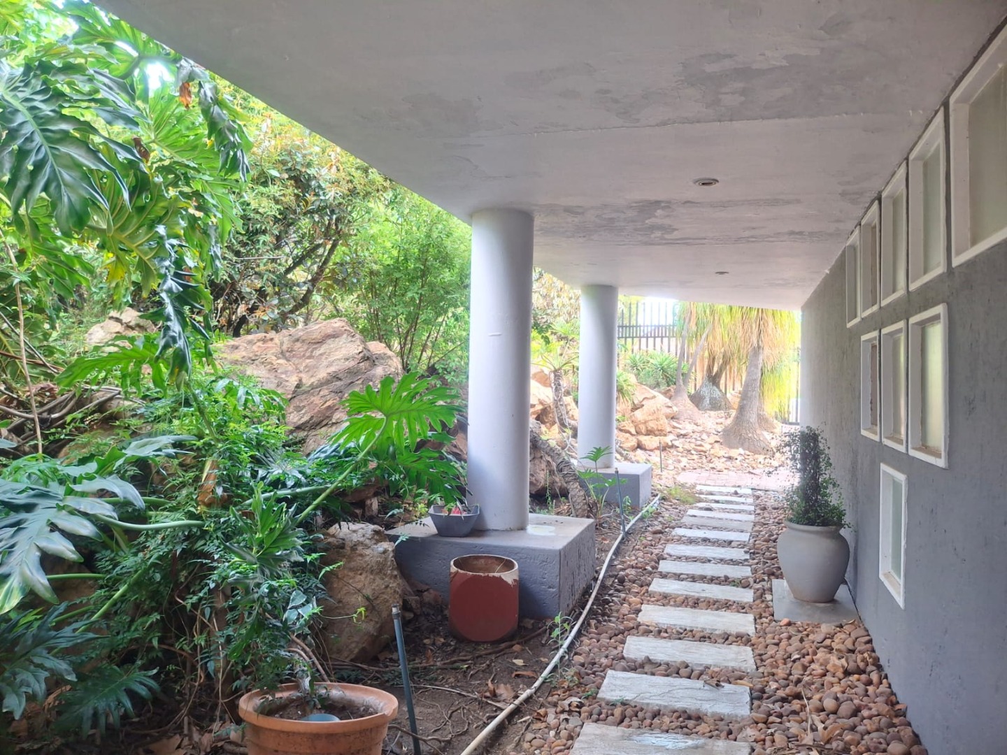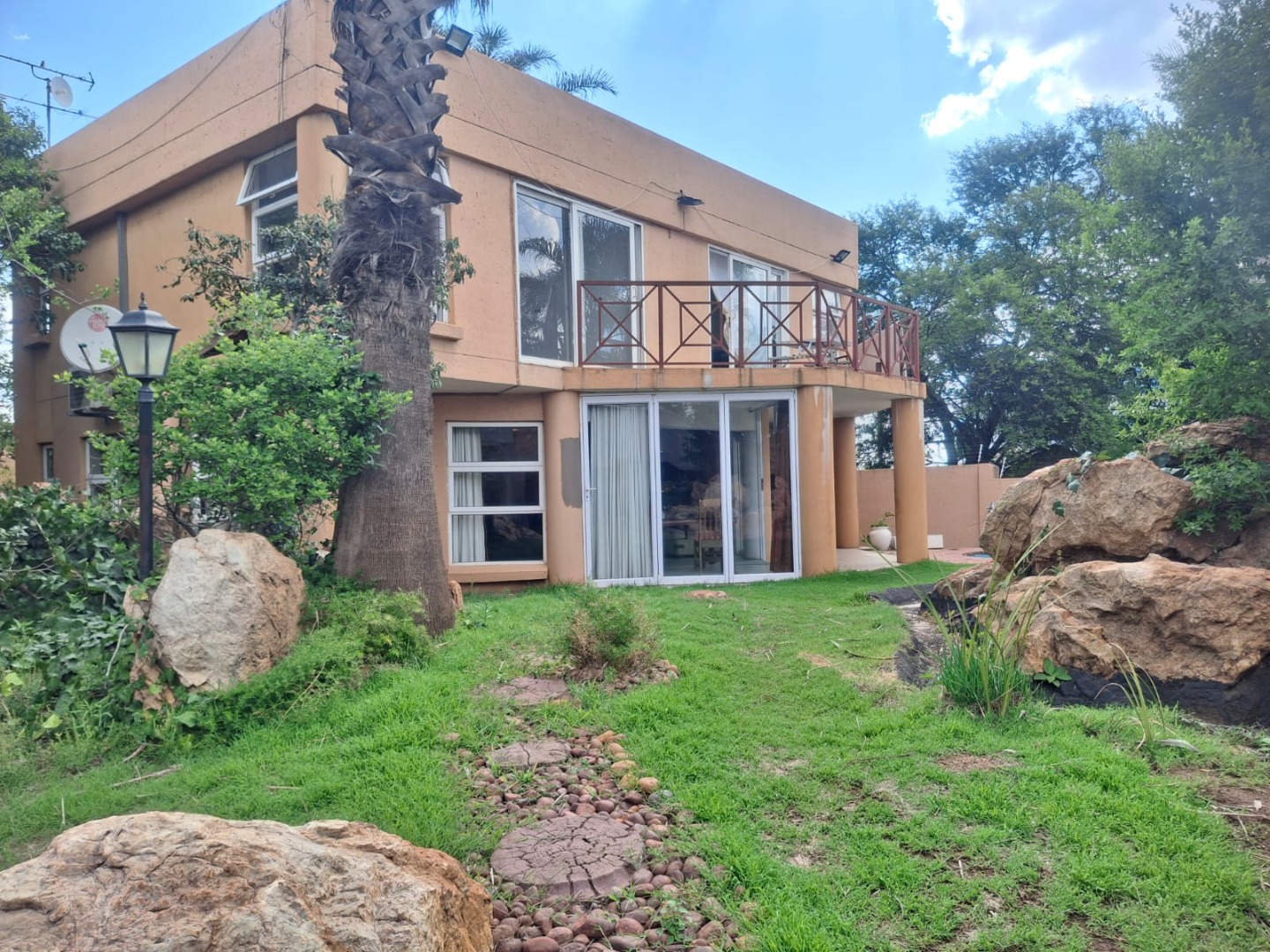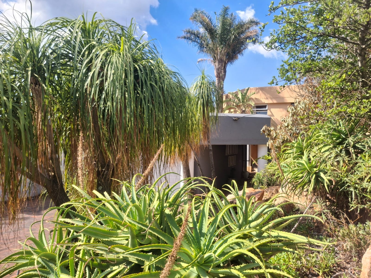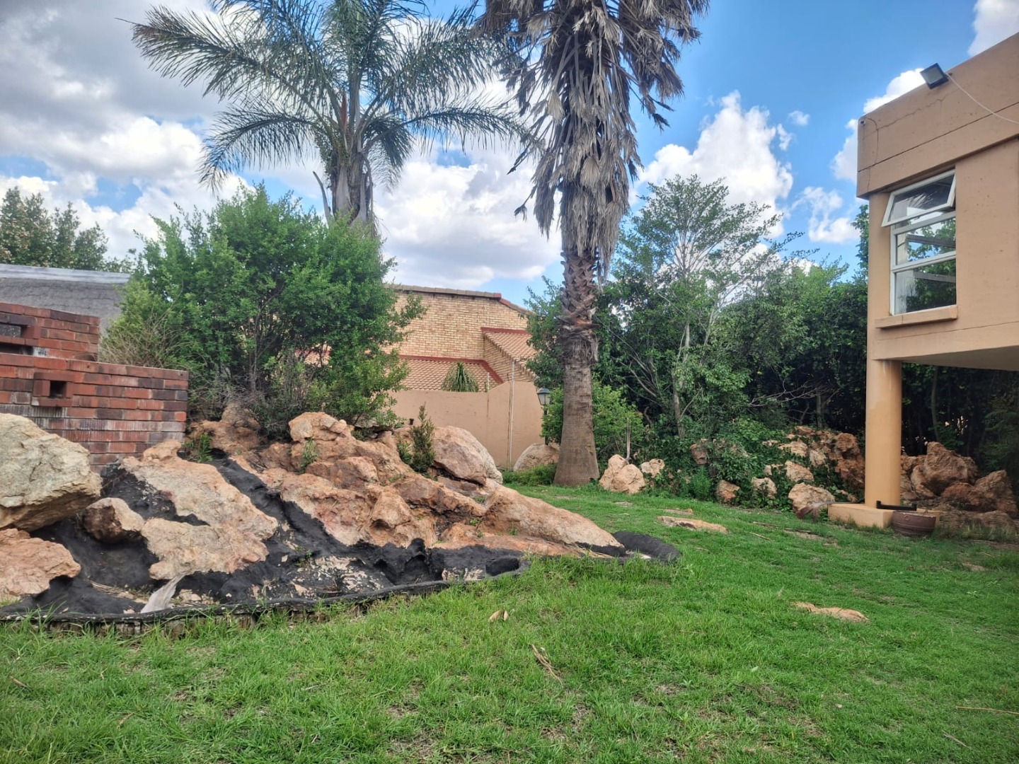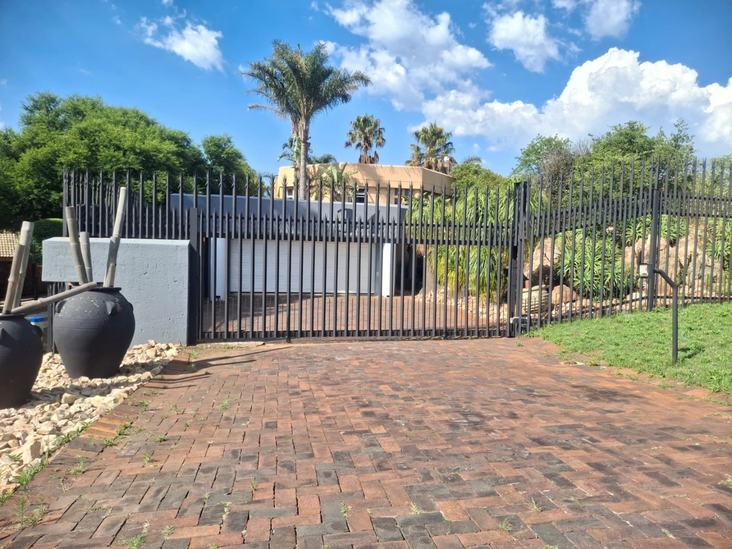 Discover this inviting family residence in the established suburb of Noordheuwel, Krugersdorp. The property features a secure metal access gate and paved brick driveway, leading to a private entrance. Lush, mature landscaping, including palm trees and a rock garden, frames the approach, complementing the modern two-tone facade.