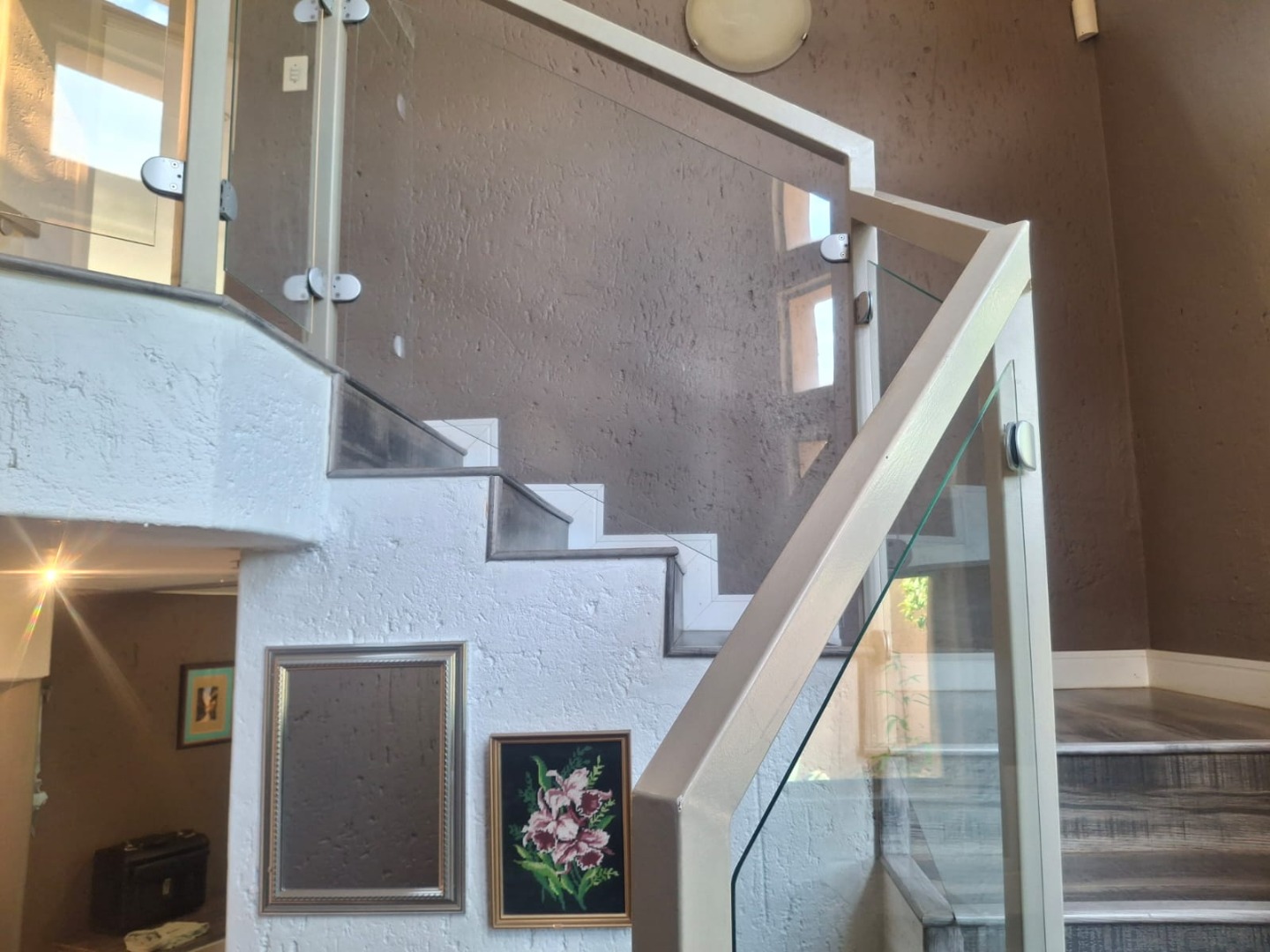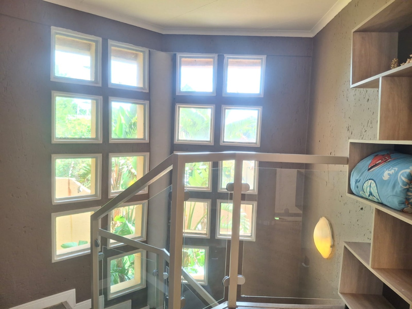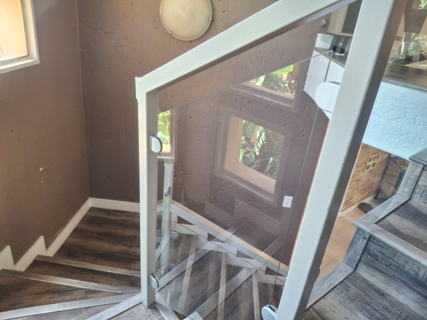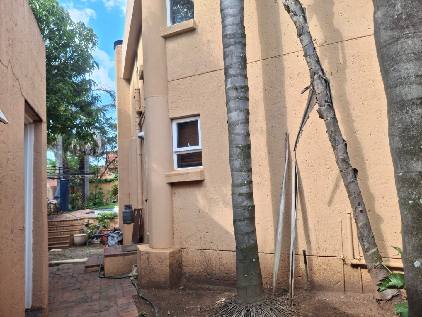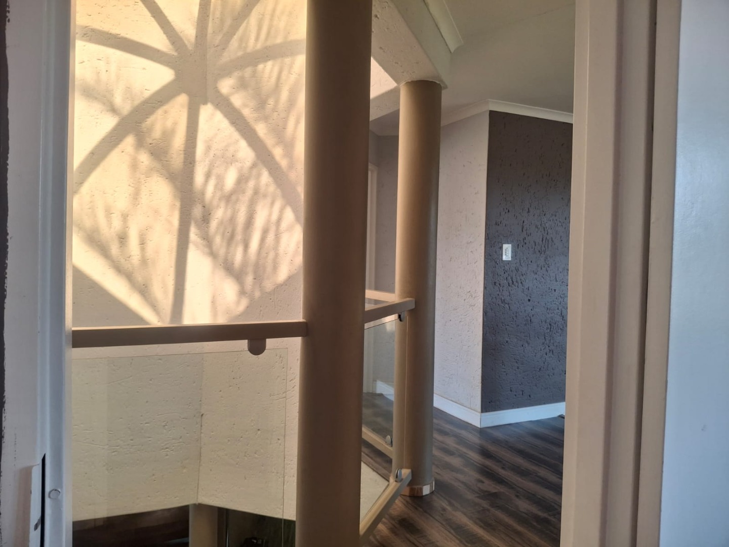 Discover this inviting family residence in the established suburb of Noordheuwel, Krugersdorp. The property features a secure metal access gate and paved brick driveway, leading to a private entrance. Lush, mature landscaping, including palm trees and a rock garden, frames the approach, complementing the modern two-tone facade.