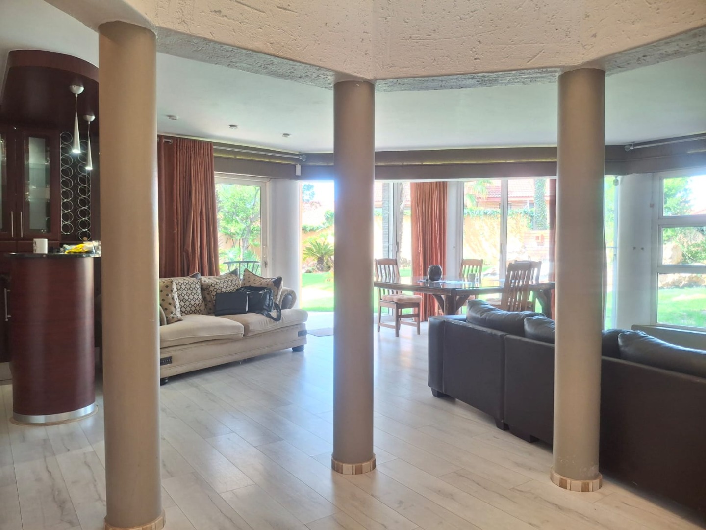 Step inside to an open-plan living area, designed for comfort and versatility. Light wood-look flooring flows throughout, connecting the spacious lounge, dining room, and a dedicated family TV room. Unique architectural elements, including decorative columns and a stone accent wall, add character. Large sliding glass doors invite abundant natural light and offer seamless outdoor access. The well-appointed kitchen features a pantry, built-in wine rack, and bar seating, perfect for entertaining, alongside a convenient home office nook.