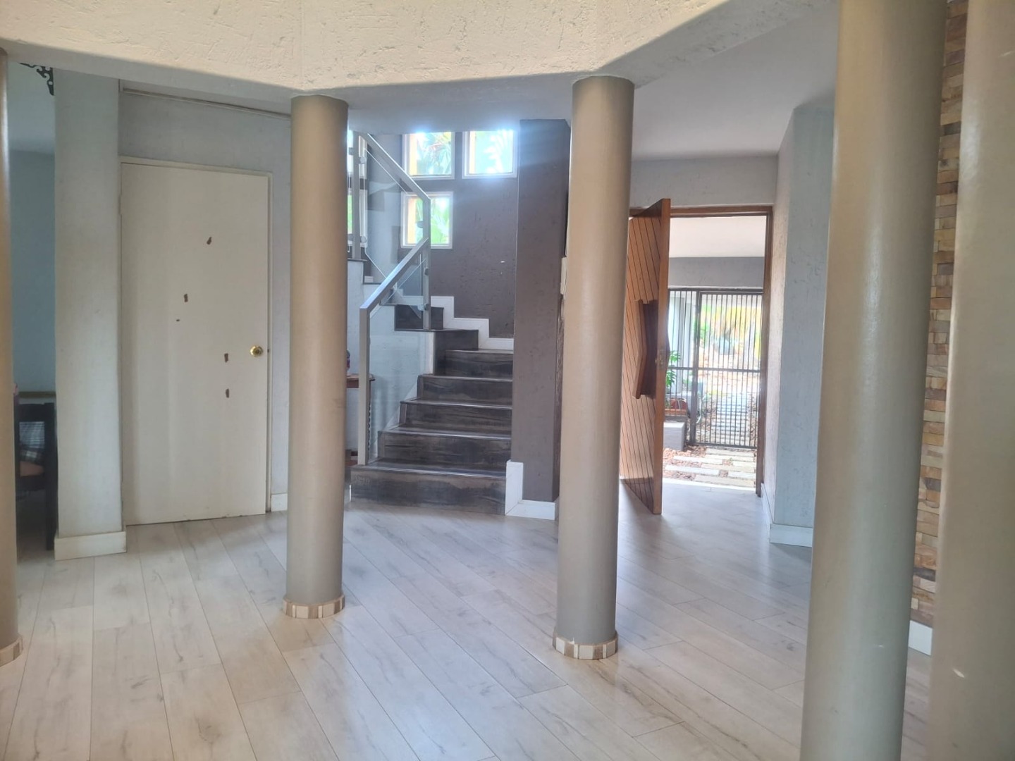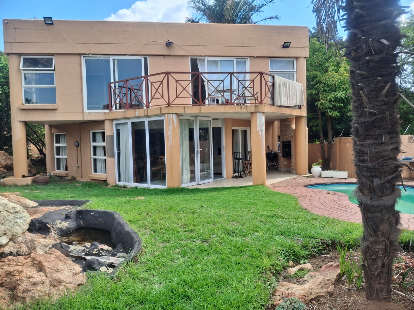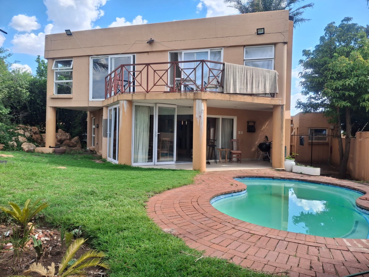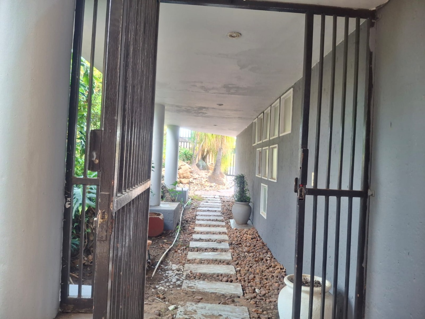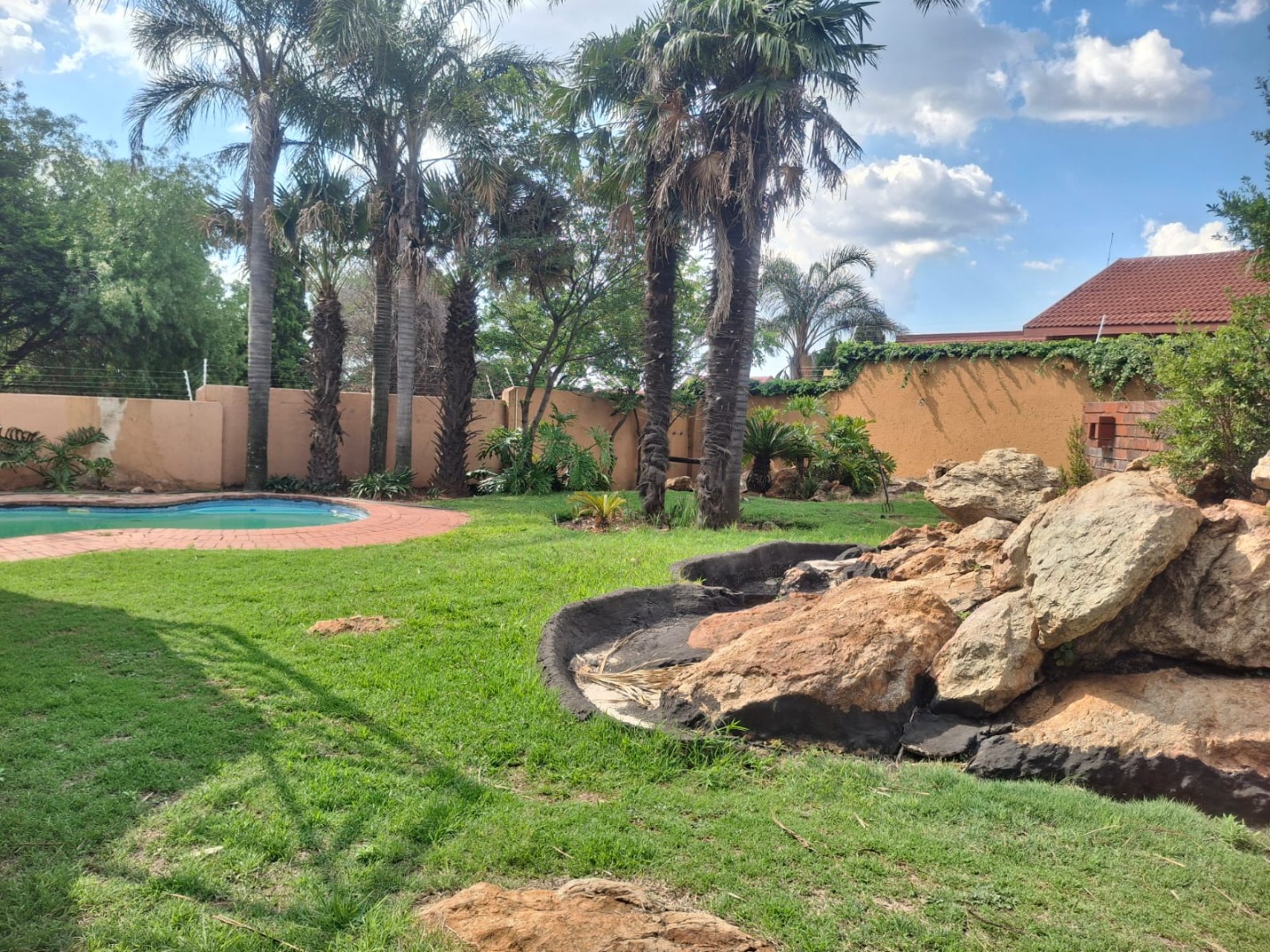 Discover this inviting family residence in the established suburb of Noordheuwel, Krugersdorp. The property features a secure metal access gate and paved brick driveway, leading to a private entrance. Lush, mature landscaping, including palm trees and a rock garden, frames the approach, complementing the modern two-tone facade.