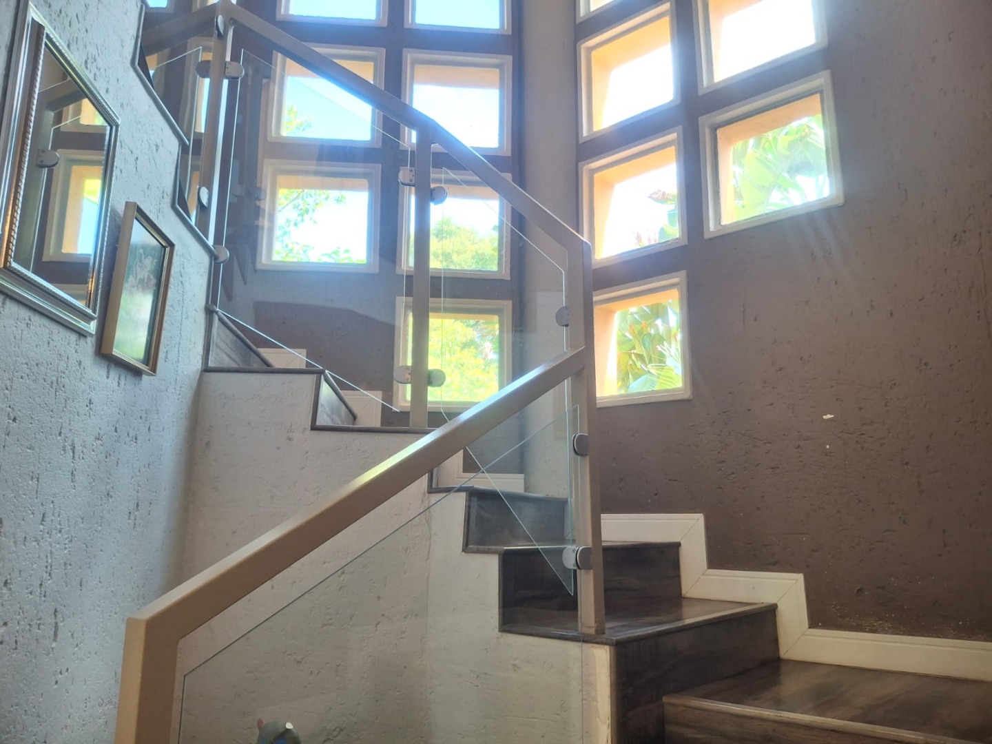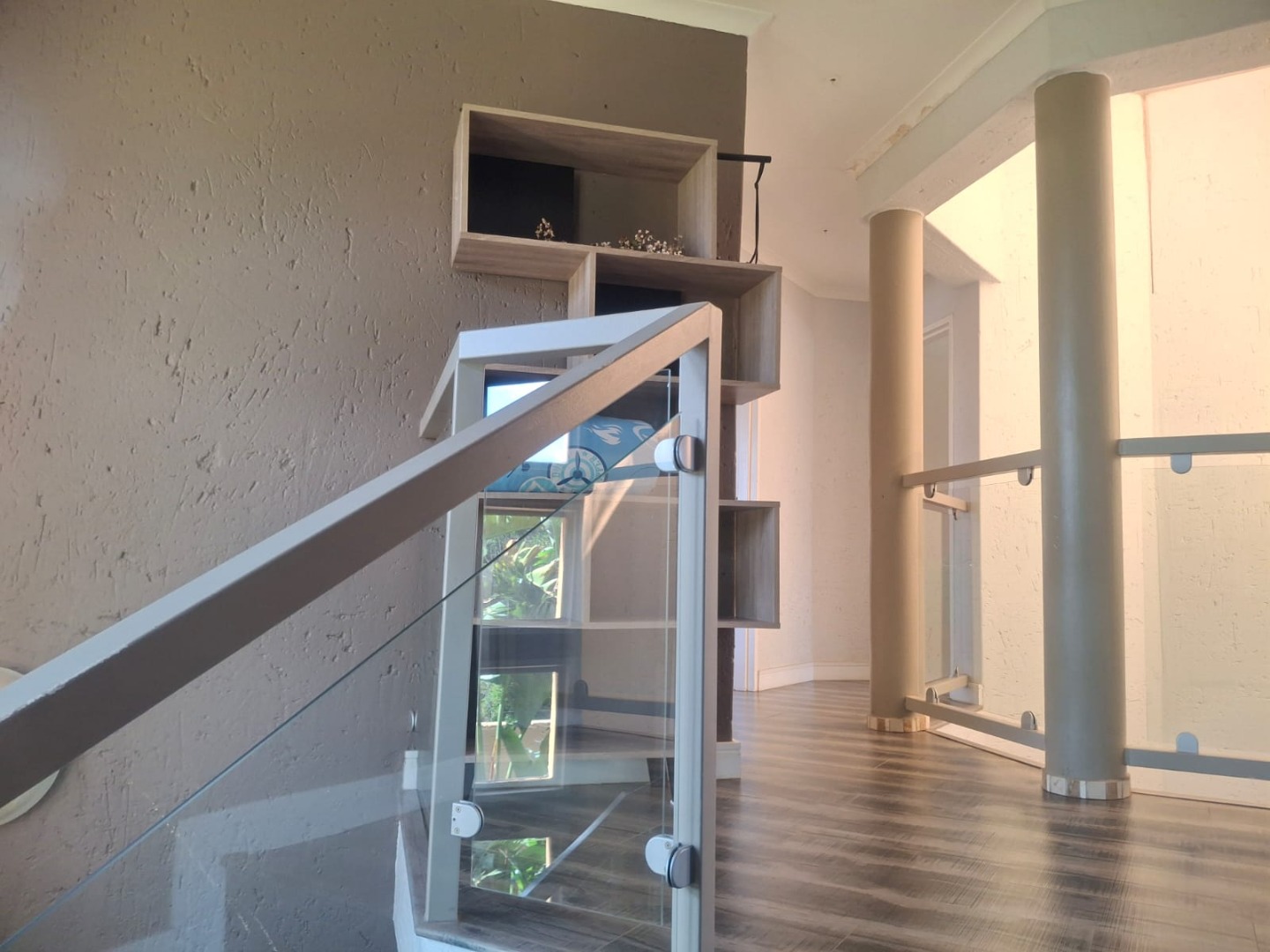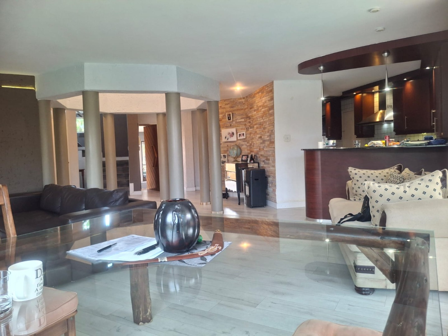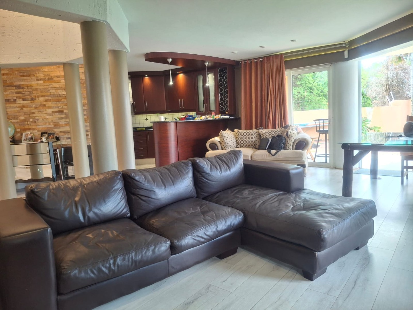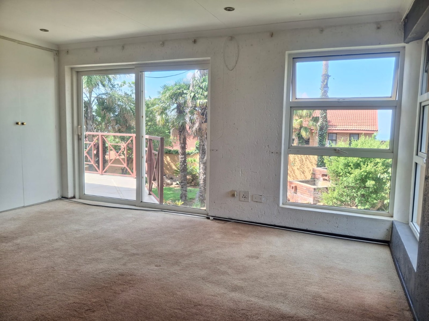 Discover this inviting family residence in the established suburb of Noordheuwel, Krugersdorp. The property features a secure metal access gate and paved brick driveway, leading to a private entrance. Lush, mature landscaping, including palm trees and a rock garden, frames the approach, complementing the modern two-tone facade.