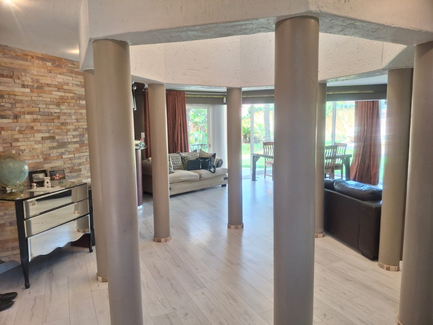 Step inside to an open-plan living area, designed for comfort and versatility. Light wood-look flooring flows throughout, connecting the spacious lounge, dining room, and a dedicated family TV room. Unique architectural elements, including decorative columns and a stone accent wall, add character. Large sliding glass doors invite abundant natural light and offer seamless outdoor access. The well-appointed kitchen features a pantry, built-in wine rack, and bar seating, perfect for entertaining, alongside a convenient home office nook.