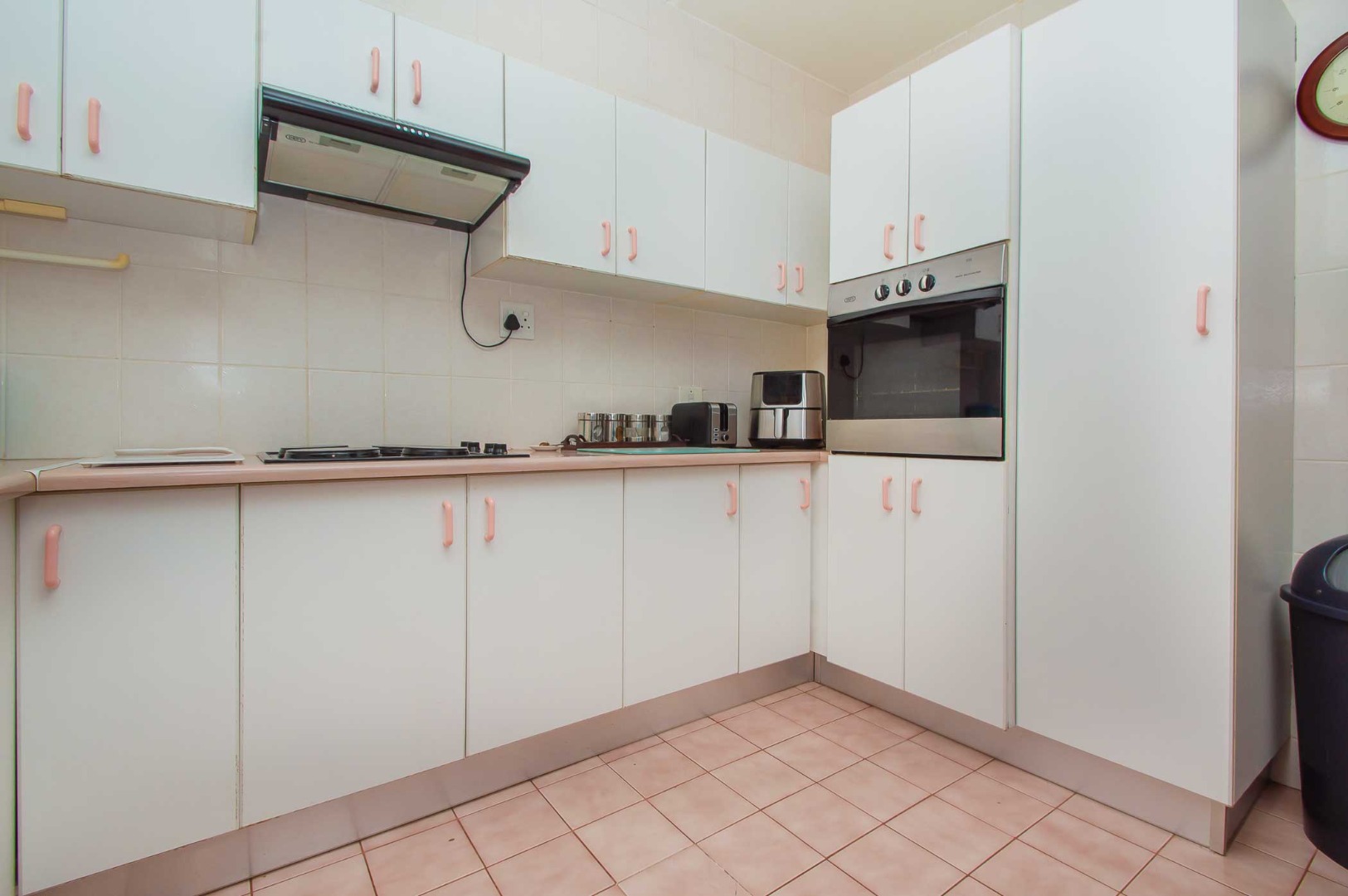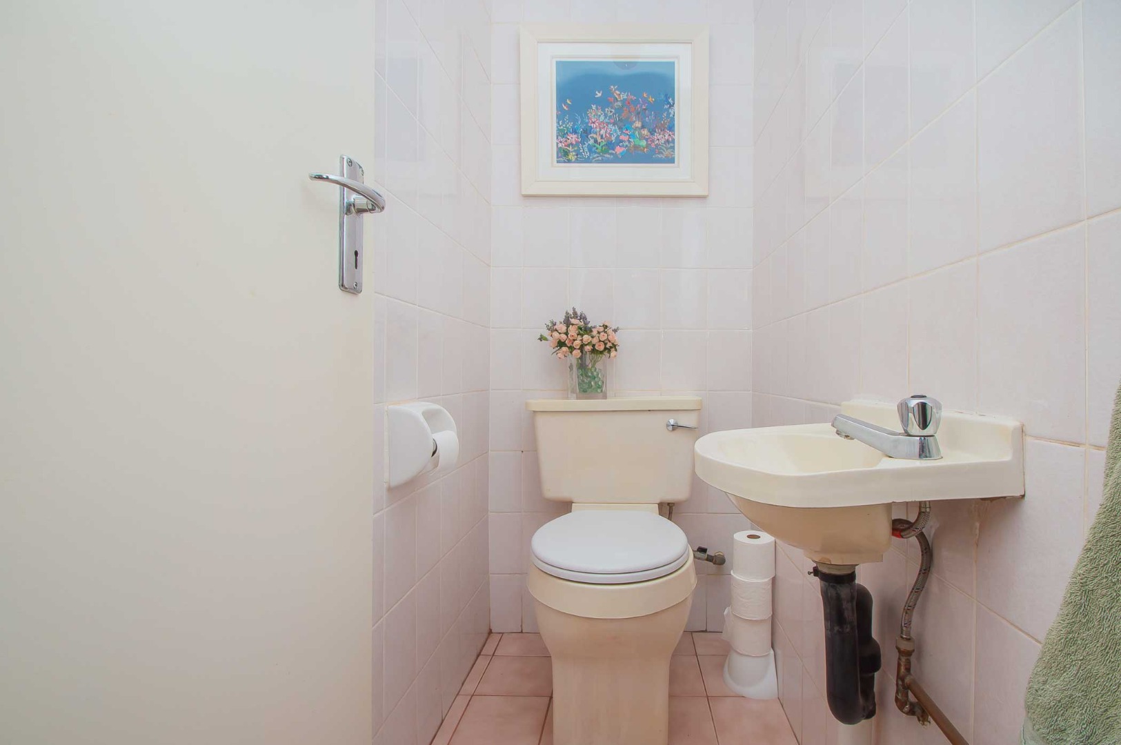 The kitchen is super functional, featuring ample white cabinetry, plenty of counter space, a built-in oven, hob, and extractor fan. It's fully tiled, so keeping it tidy is a breeze. Upstairs, you'll find three comfortable bedrooms which have laminated flooring and two bathrooms, while a convenient guest toilet is located downstairs.