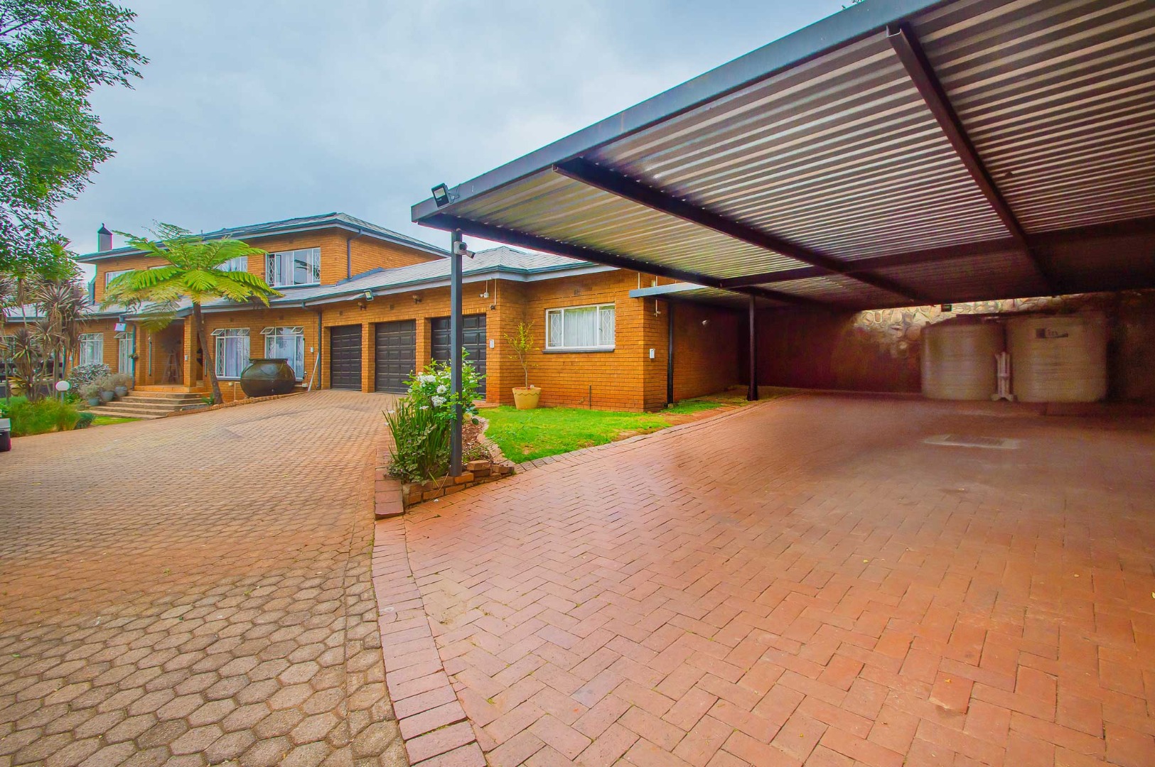 Three garages plus carport accommodating at least three vehicles