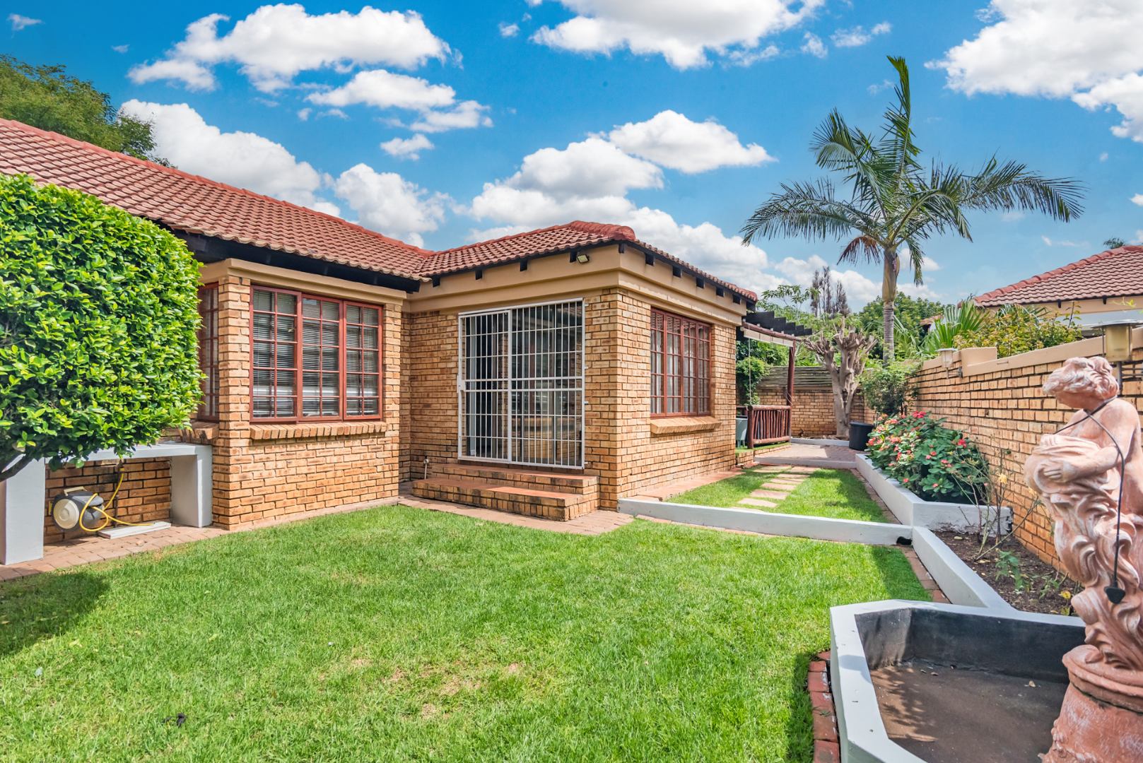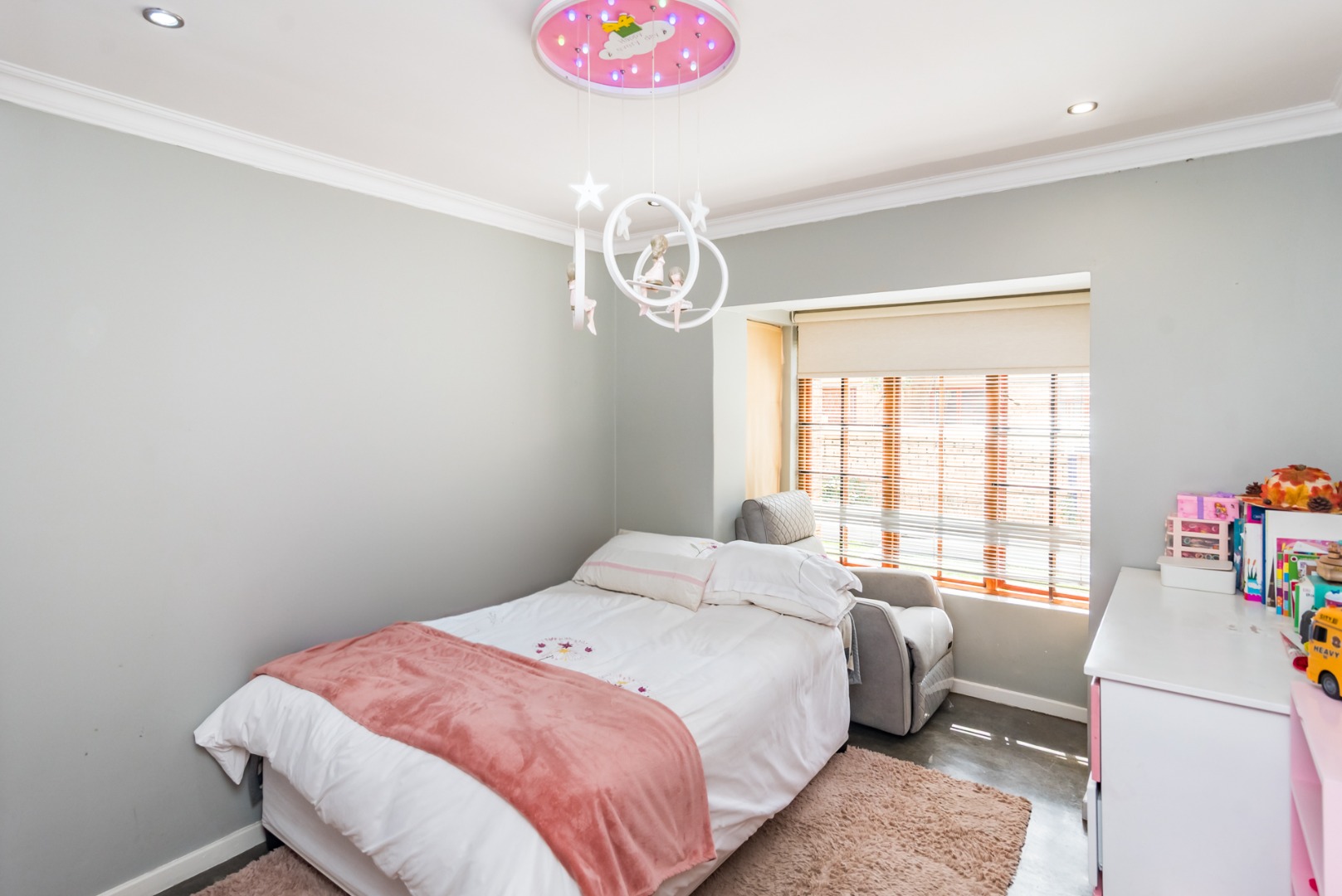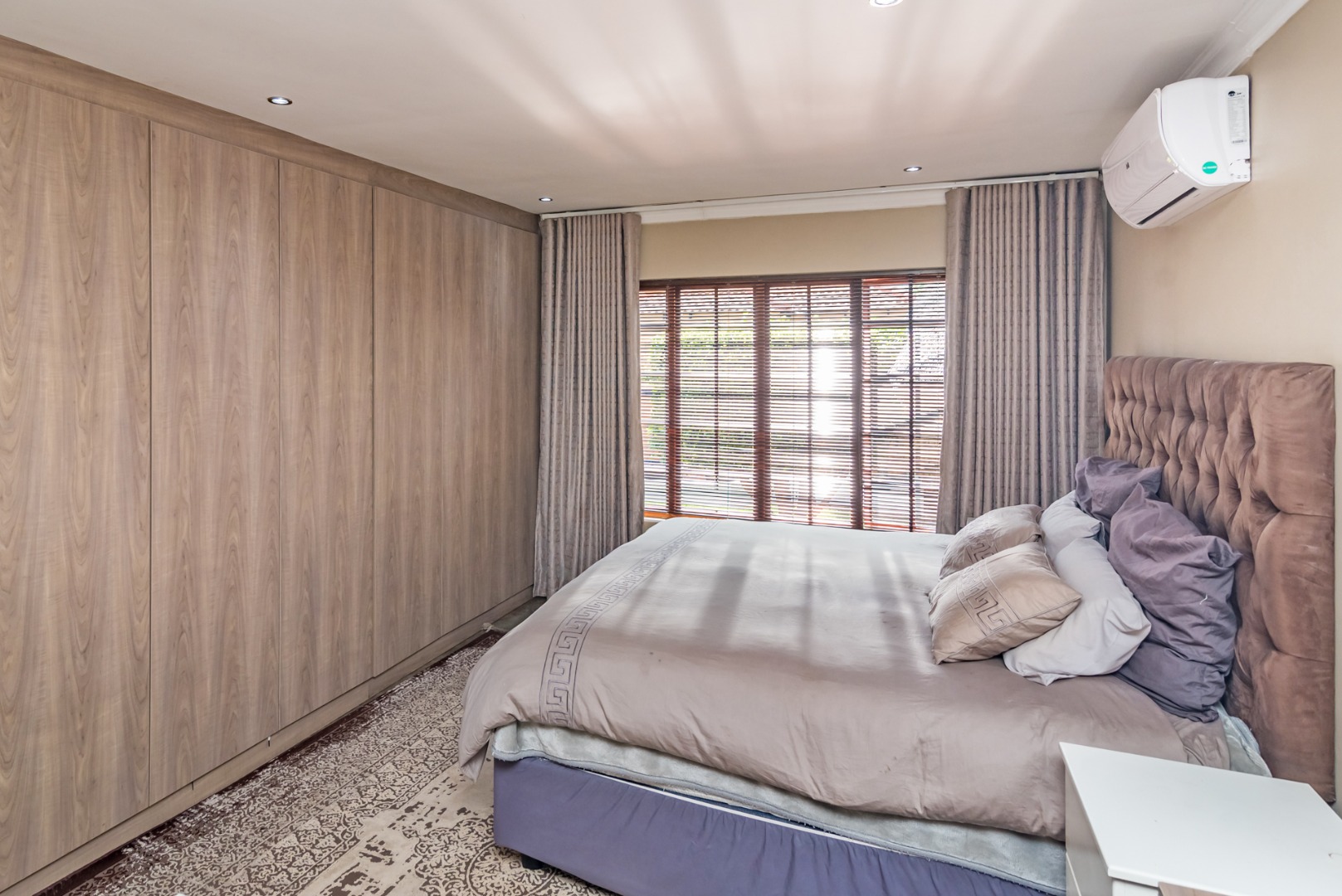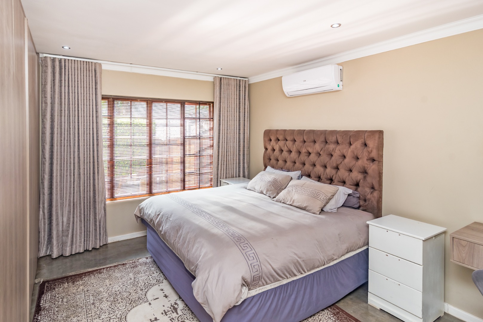 The home offers three well-appointed bedrooms and two bathrooms. Two bedrooms feature built-in cupboards and share a guest bathroom with a shower, basin, and toilet. The main bedroom is a peaceful retreat, complete with ample built-in cupboards, a dressing table, air-conditioning, and an en-suite bathroom with a double basin, bath, and toilet.