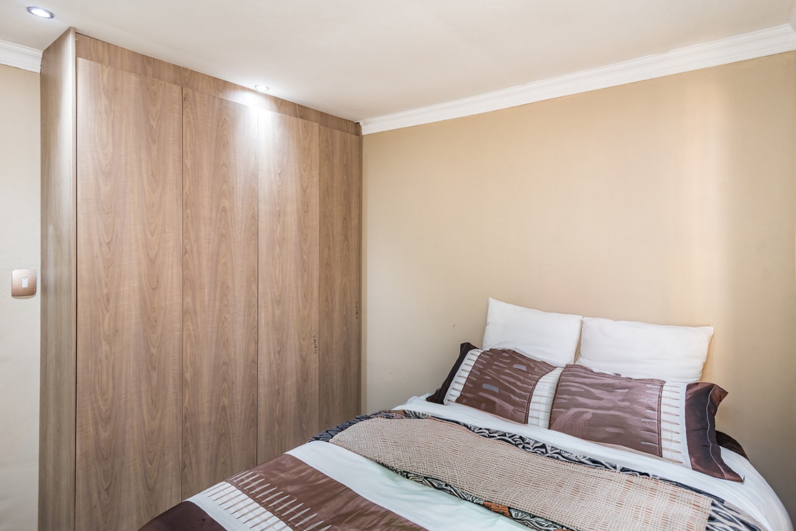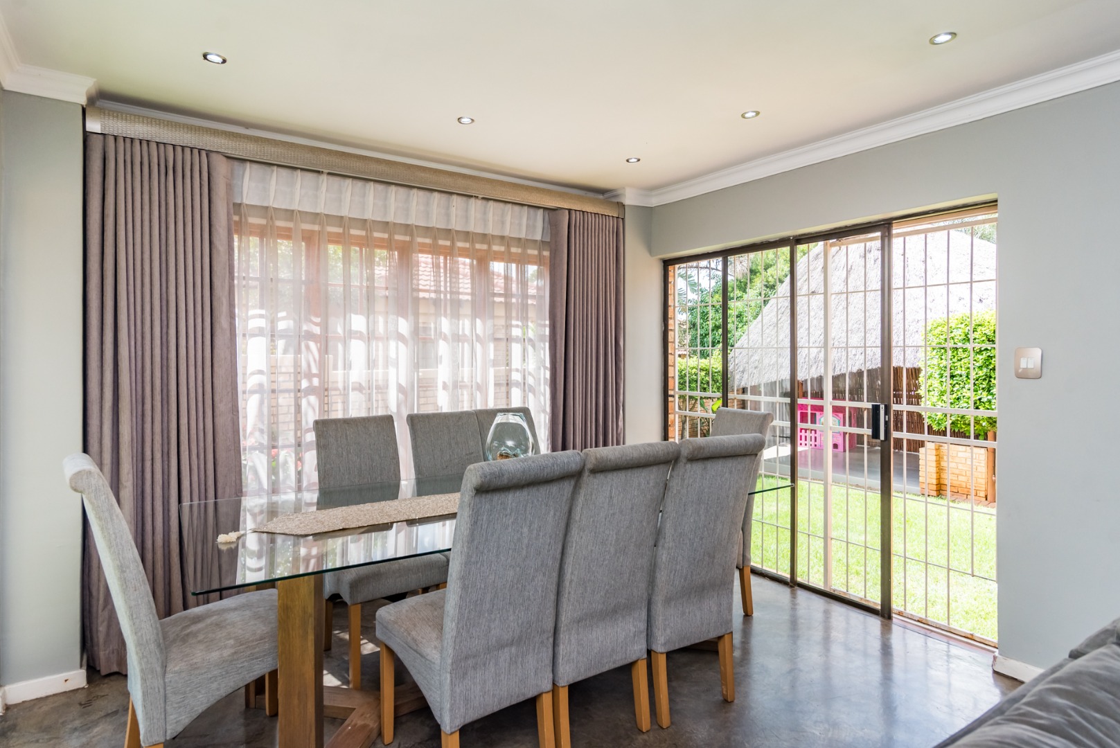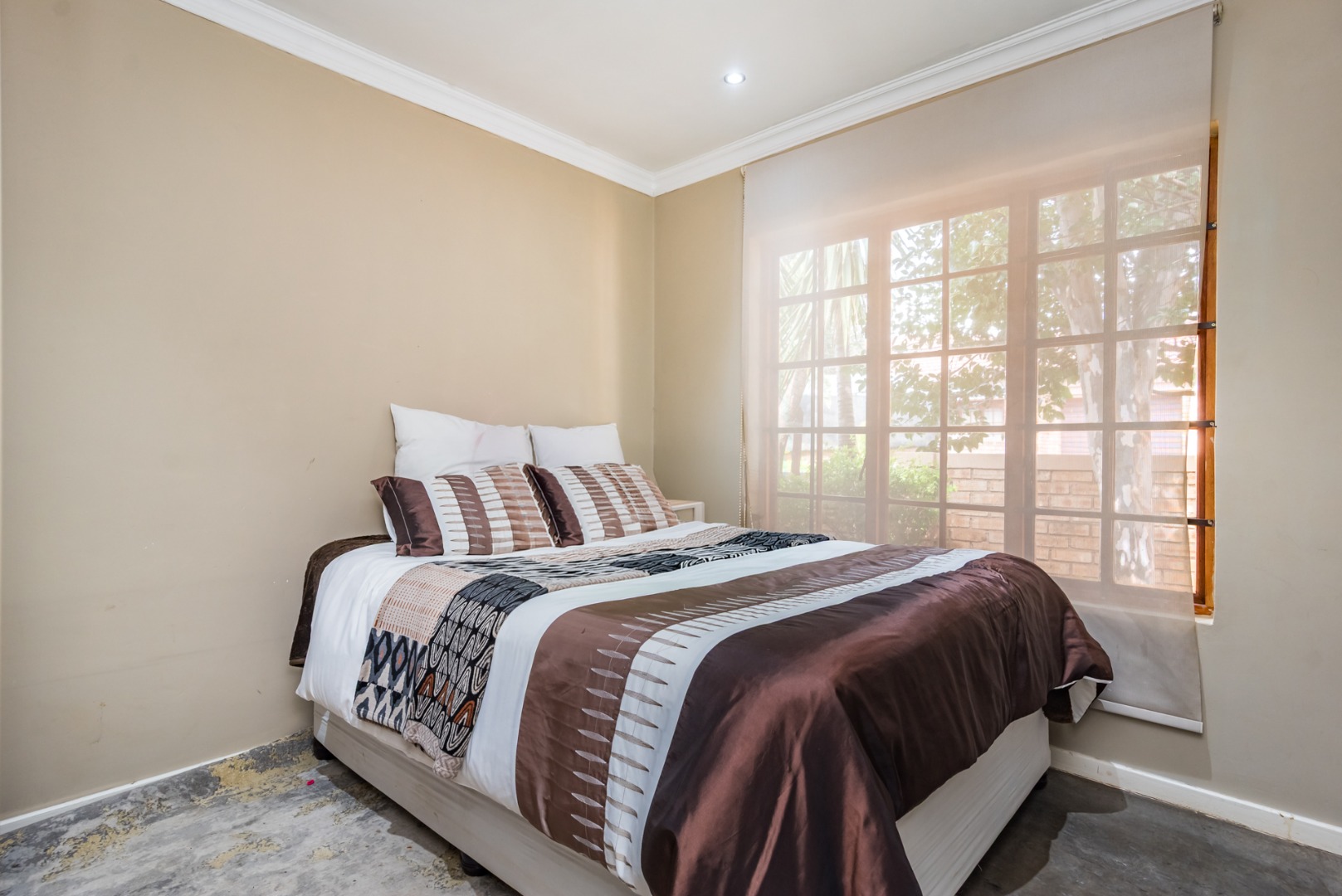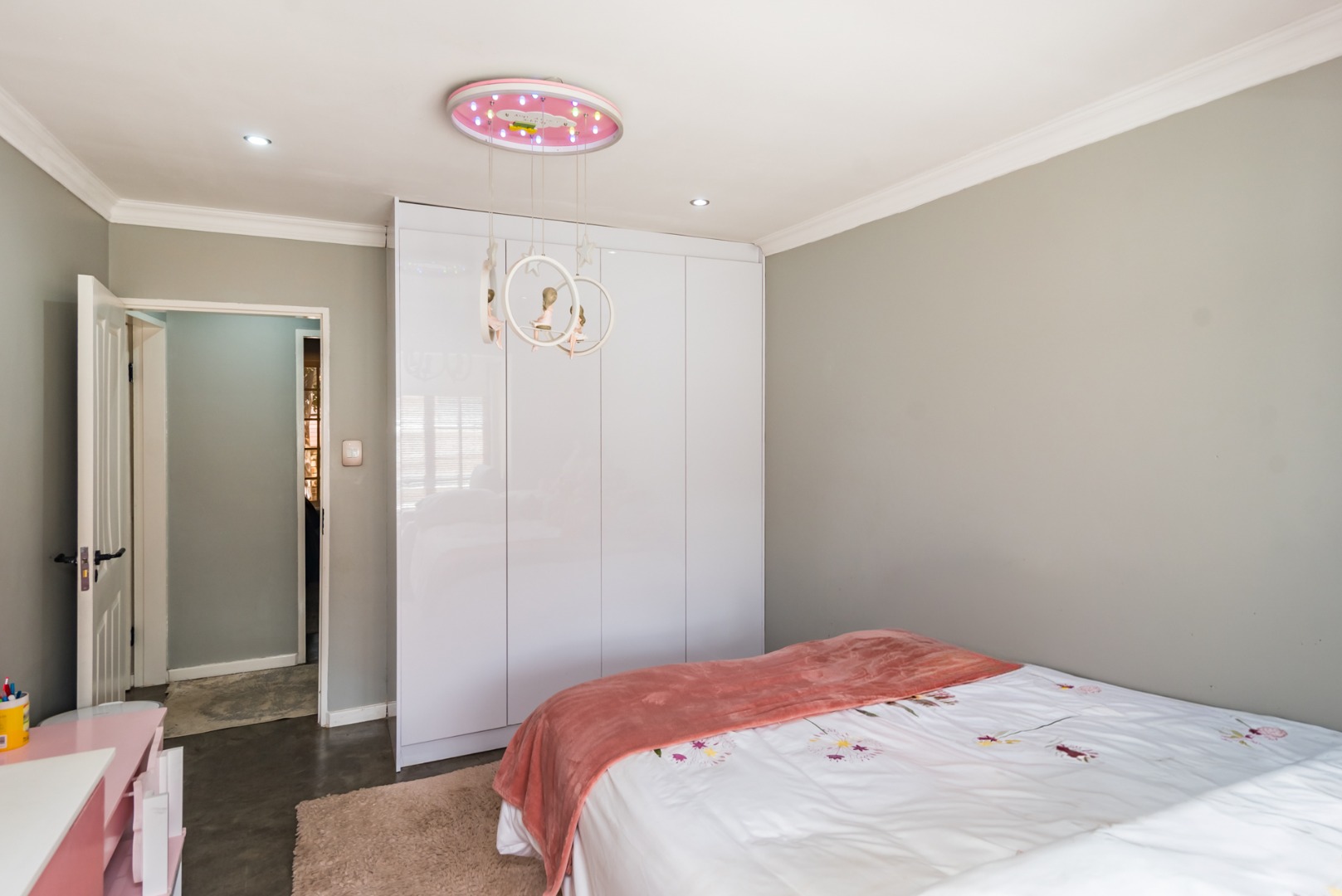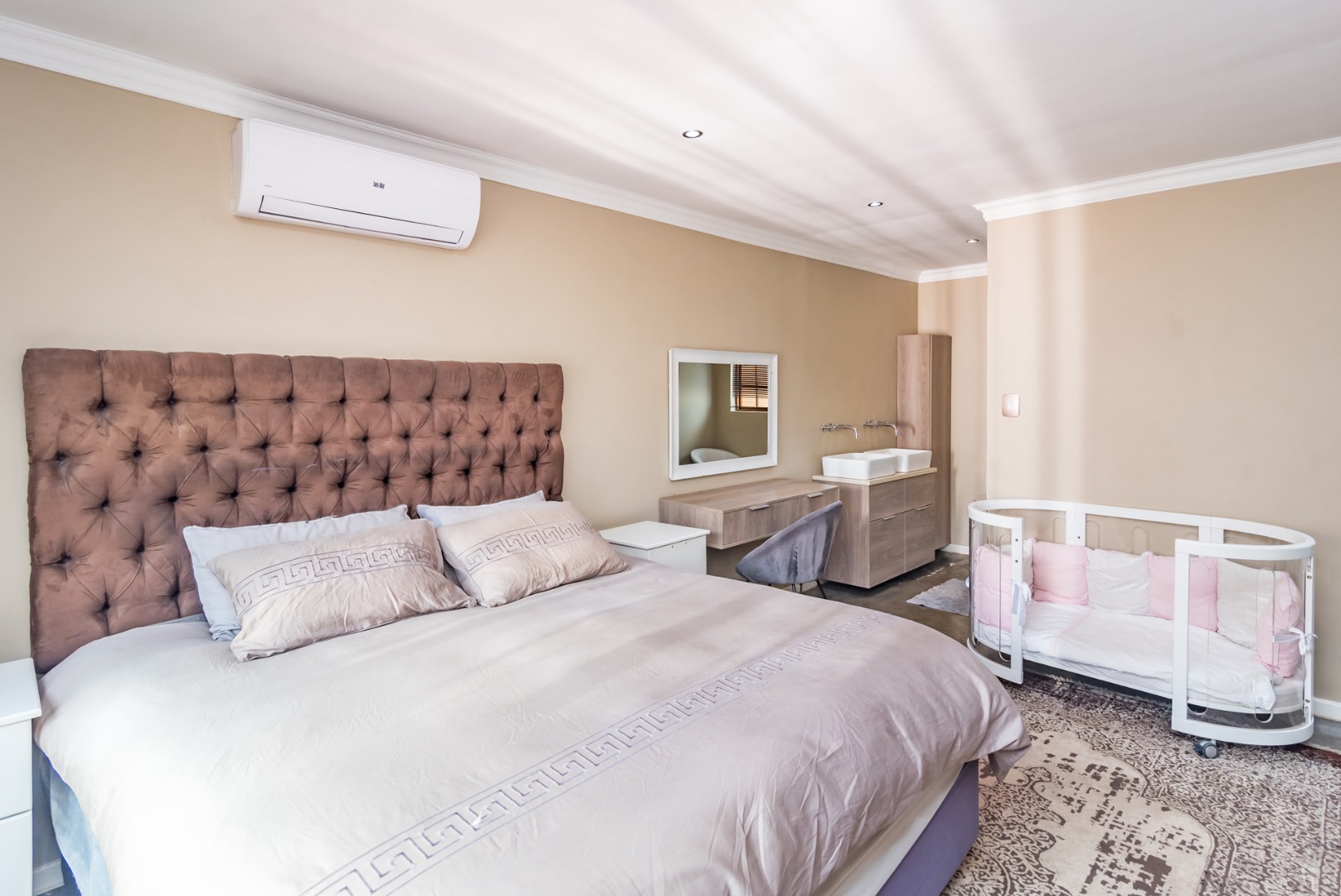 The home offers three well-appointed bedrooms and two bathrooms. Two bedrooms feature built-in cupboards and share a guest bathroom with a shower, basin, and toilet. The main bedroom is a peaceful retreat, complete with ample built-in cupboards, a dressing table, air-conditioning, and an en-suite bathroom with a double basin, bath, and toilet.