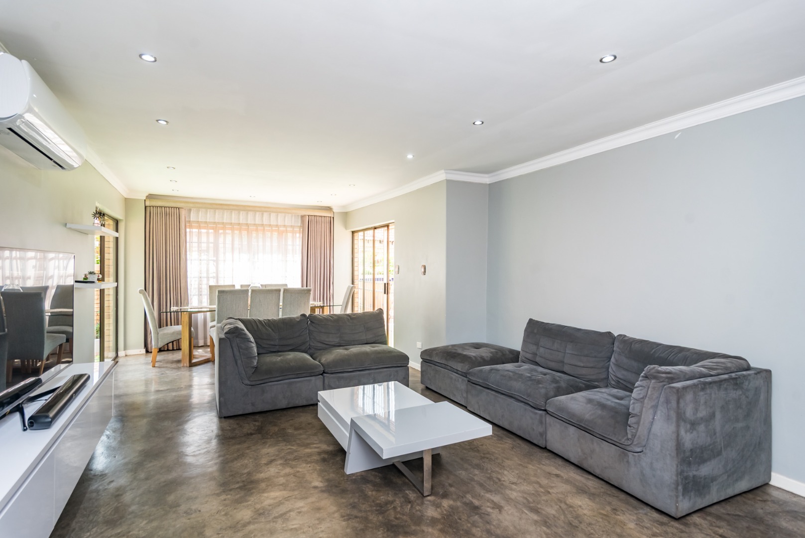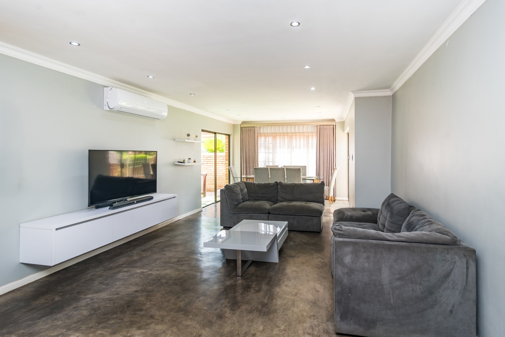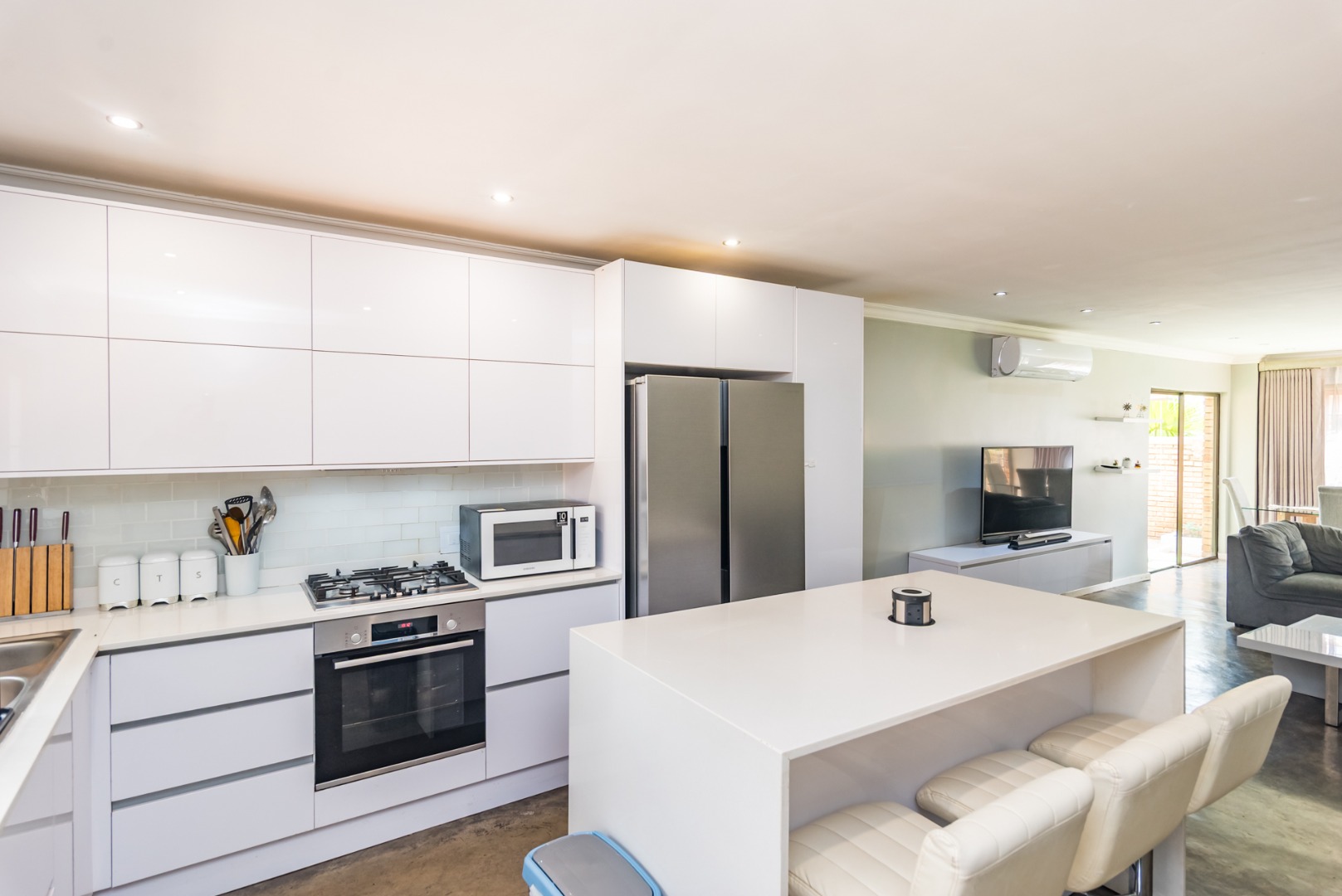 The heart of the home is a light-filled, open-plan living area that seamlessly connects the kitchen, lounge, and dining space, perfect for entertaining guests or enjoying quality time with family. The sleek, contemporary kitchen boasts crisp white cabinetry, a gas stove and oven for easy cooking, and a stylish centre island. Air-conditioning keeps the space comfortable year-round, while two sliding doors open out to a private garden, creating a seamless indoor-outdoor flow.