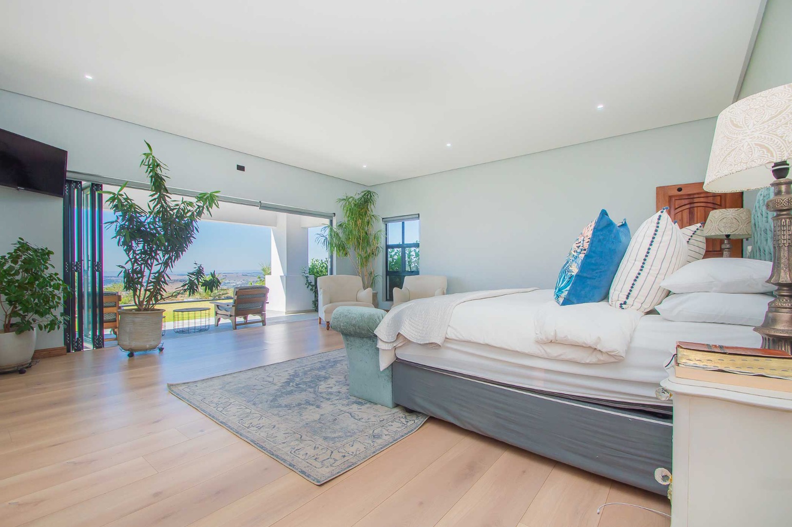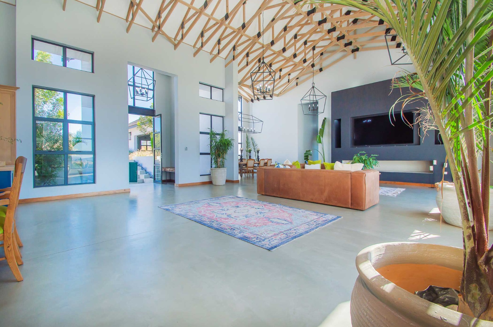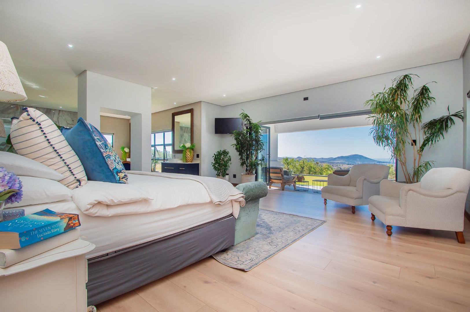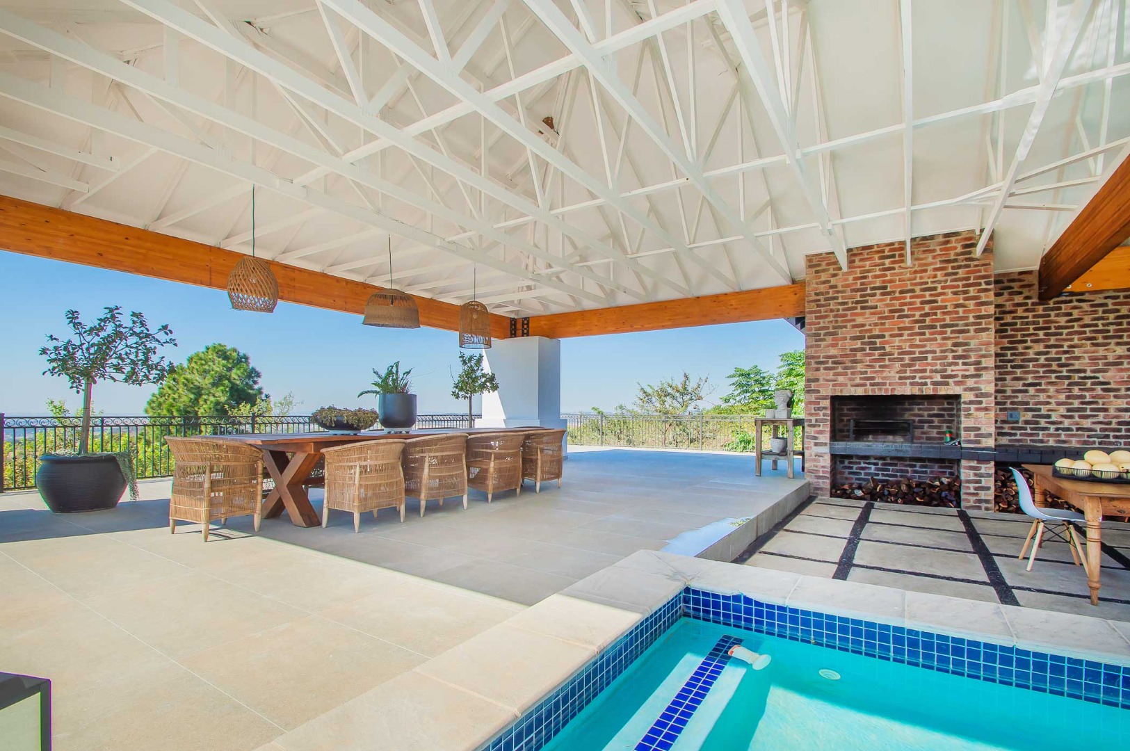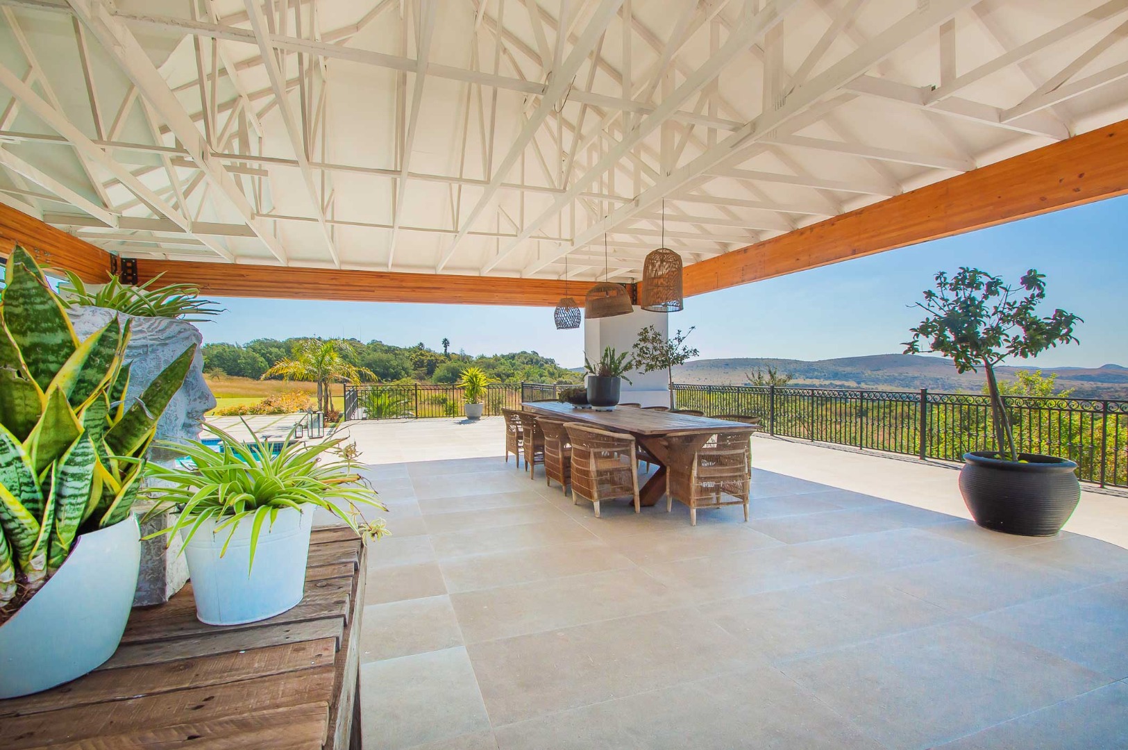 The main house includes 4 spacious bedrooms, all with stacking glass doors that seamlessly blend indoor comfort with outdoor splendor. A large office for a Director working from home. The luxurious main suite boasts a biofuel fireplace, a private pajama lounge, a walk-in closet room, and a Santincrete-finished Ensuite bathroom. A separate guest suite with a private entrance and an additional flatlet with its own bathroom offer versatile living options for extended family. Domestic accommodation and two storerooms add to the property's practicality.