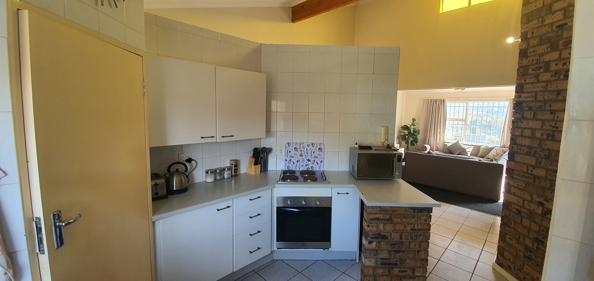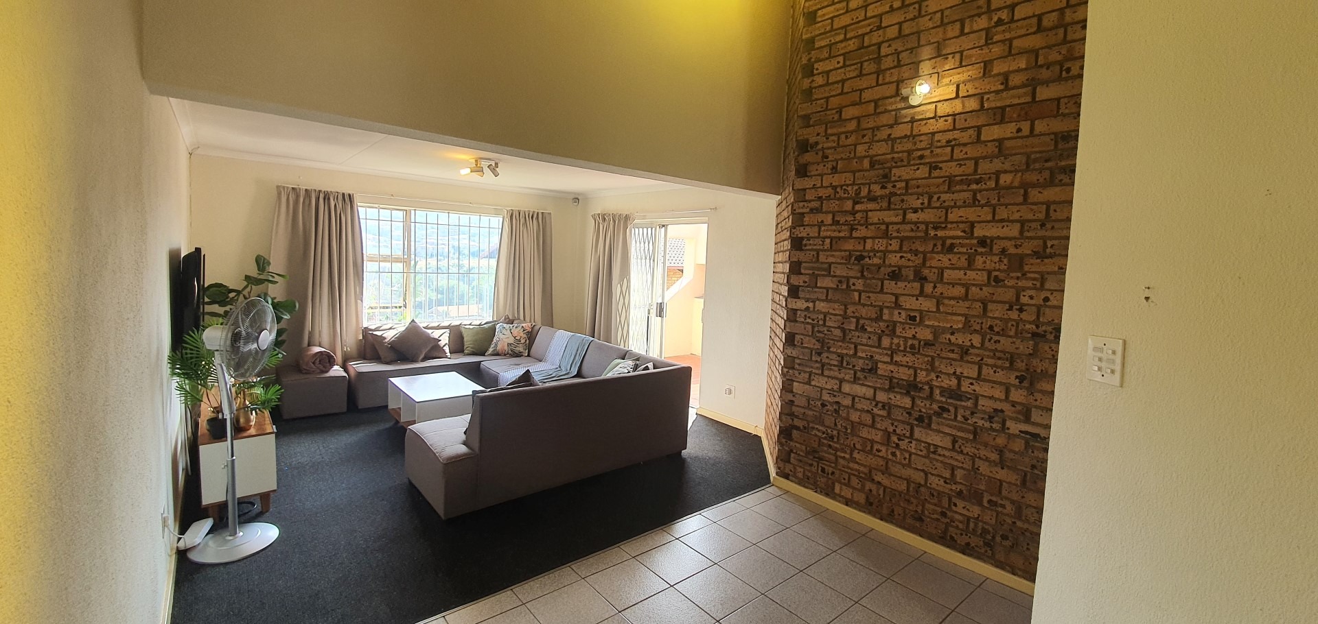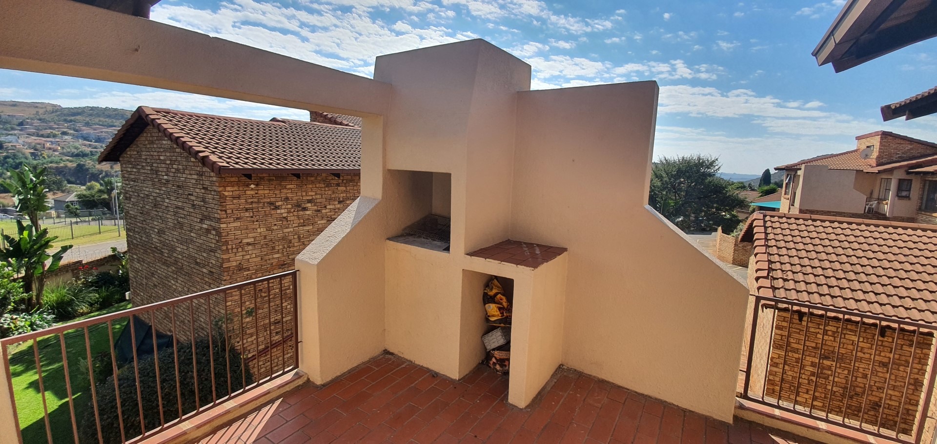 The home features an intelligently designed open-plan layout that flows effortlessly between the kitchen, dining, and living areas. A spacious lounge with a unique layout creates a sense of separation and depth, while the striking exposed face brick feature wall adds warmth and texture to the interior. Large windows and sliding doors allow for excellent natural light and lead out onto a private balcony complete with a built-in braai, ideal for relaxed entertaining while enjoying the surrounding views. The kitchen is functional and well-appointed with ample cupboard space, practical countertops, and room for appliances, making it perfectly suited for everyday living.