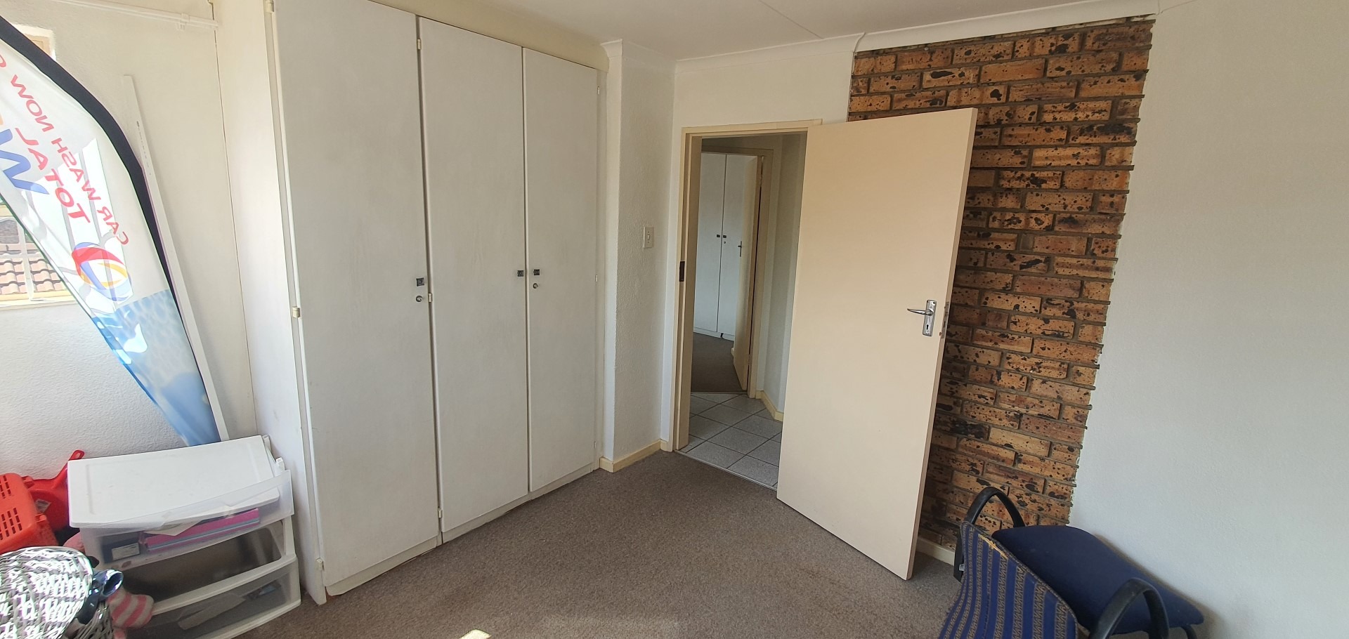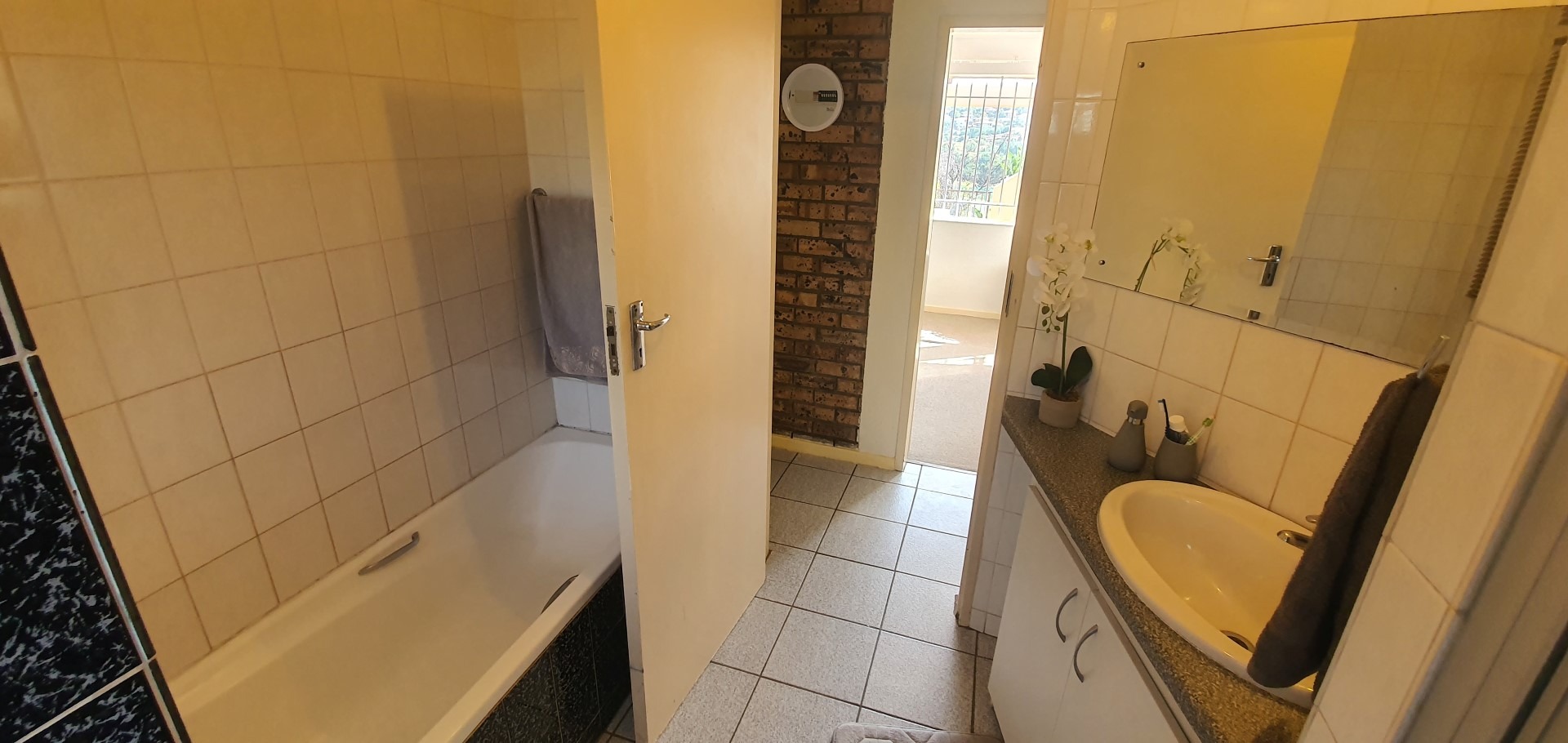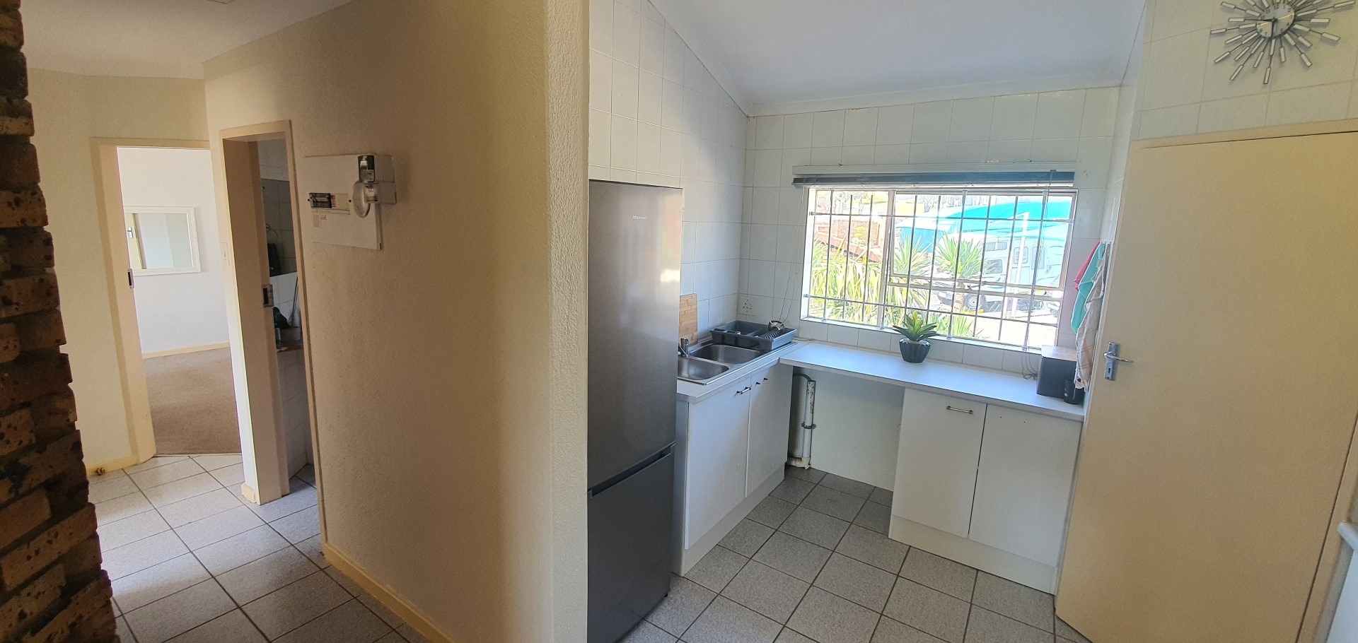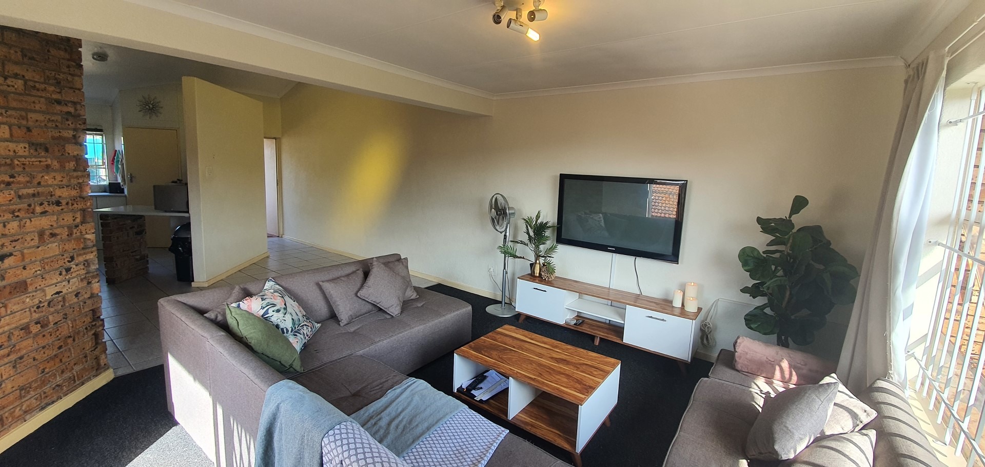 The home features an intelligently designed open-plan layout that flows effortlessly between the kitchen, dining, and living areas. A spacious lounge with a unique layout creates a sense of separation and depth, while the striking exposed face brick feature wall adds warmth and texture to the interior. Large windows and sliding doors allow for excellent natural light and lead out onto a private balcony complete with a built-in braai, ideal for relaxed entertaining while enjoying the surrounding views. The kitchen is functional and well-appointed with ample cupboard space, practical countertops, and room for appliances, making it perfectly suited for everyday living.