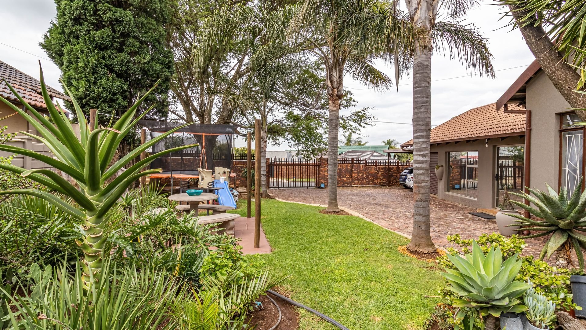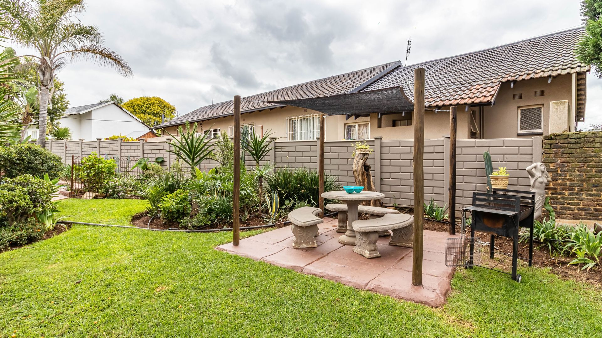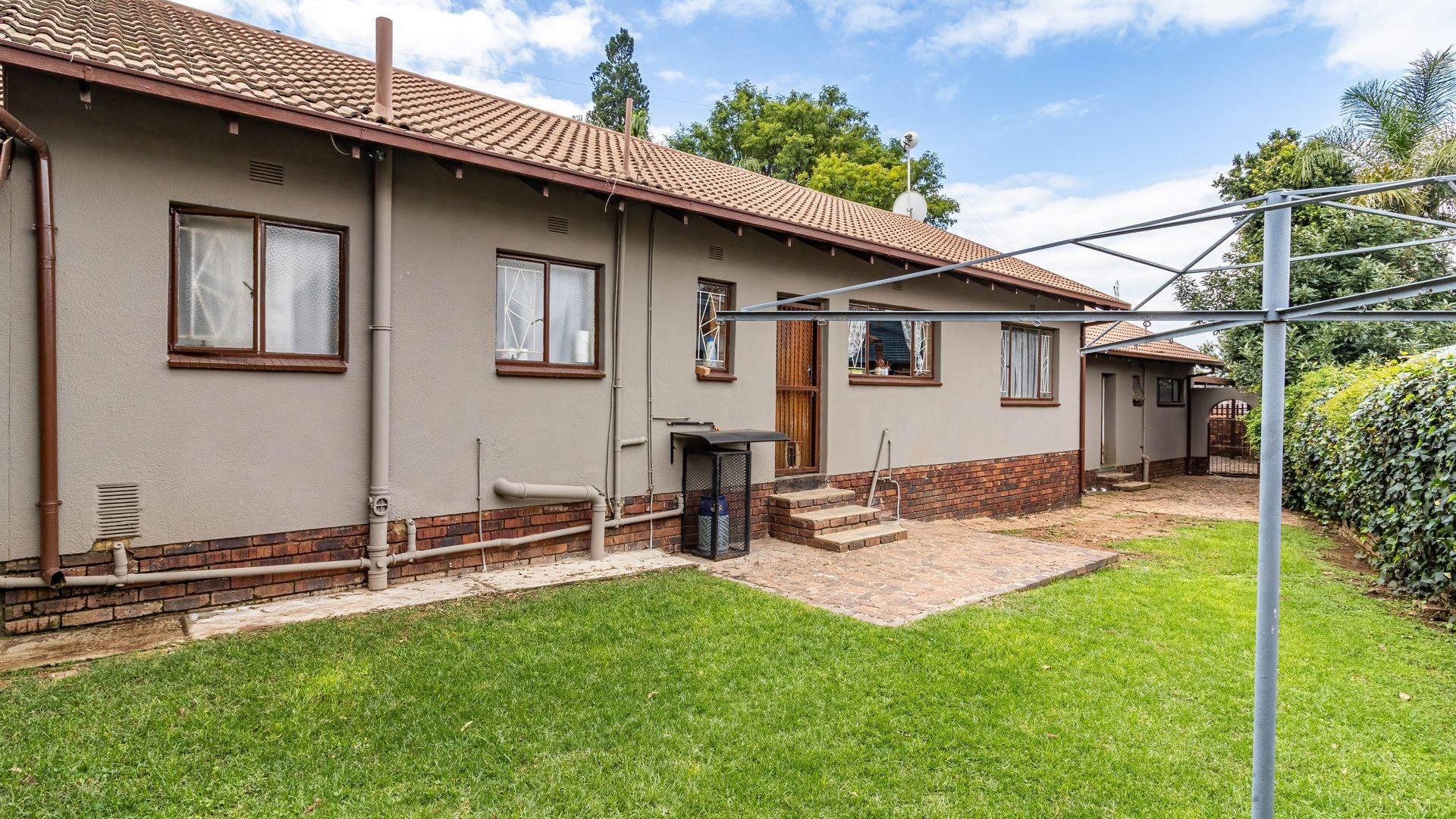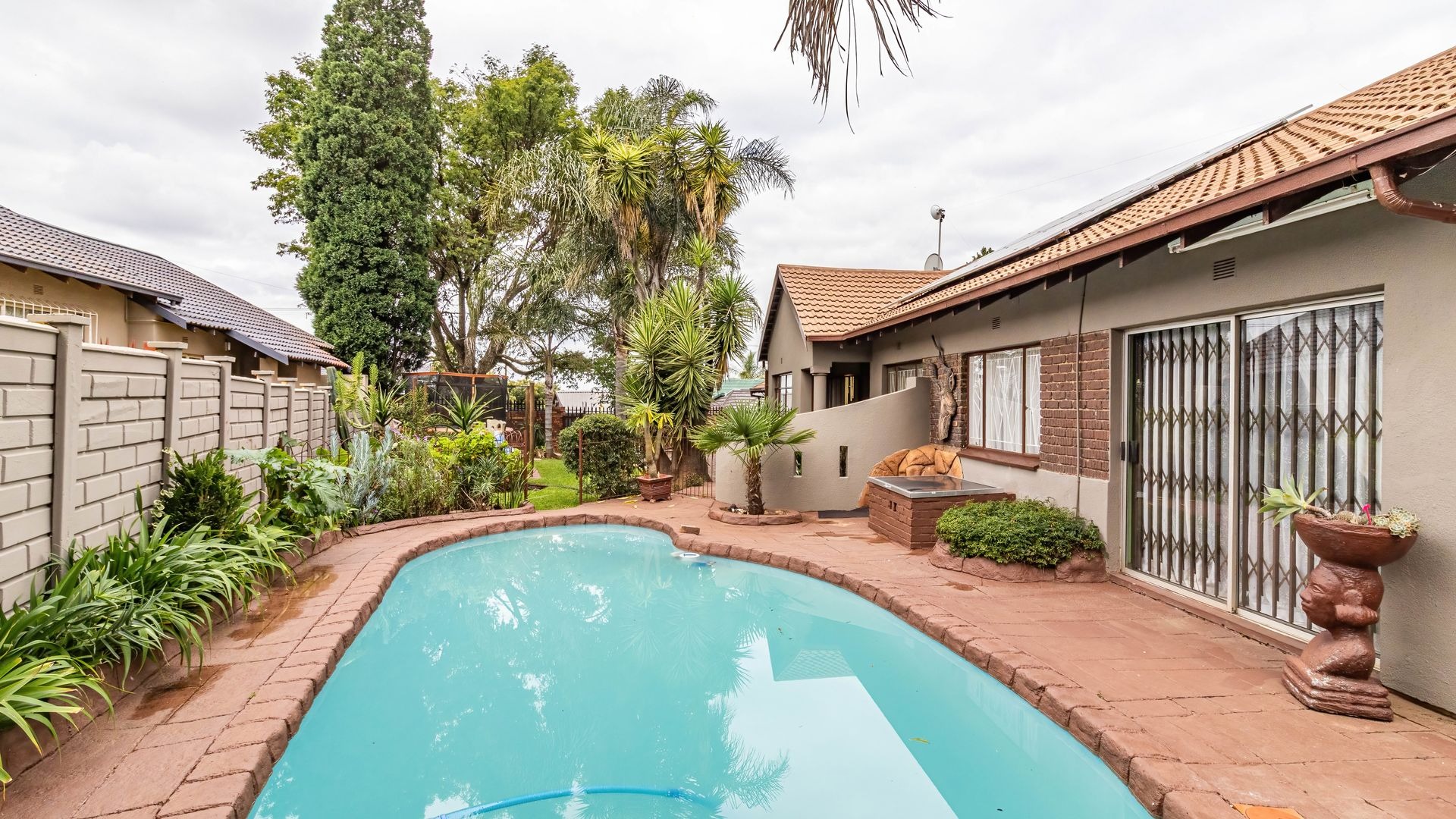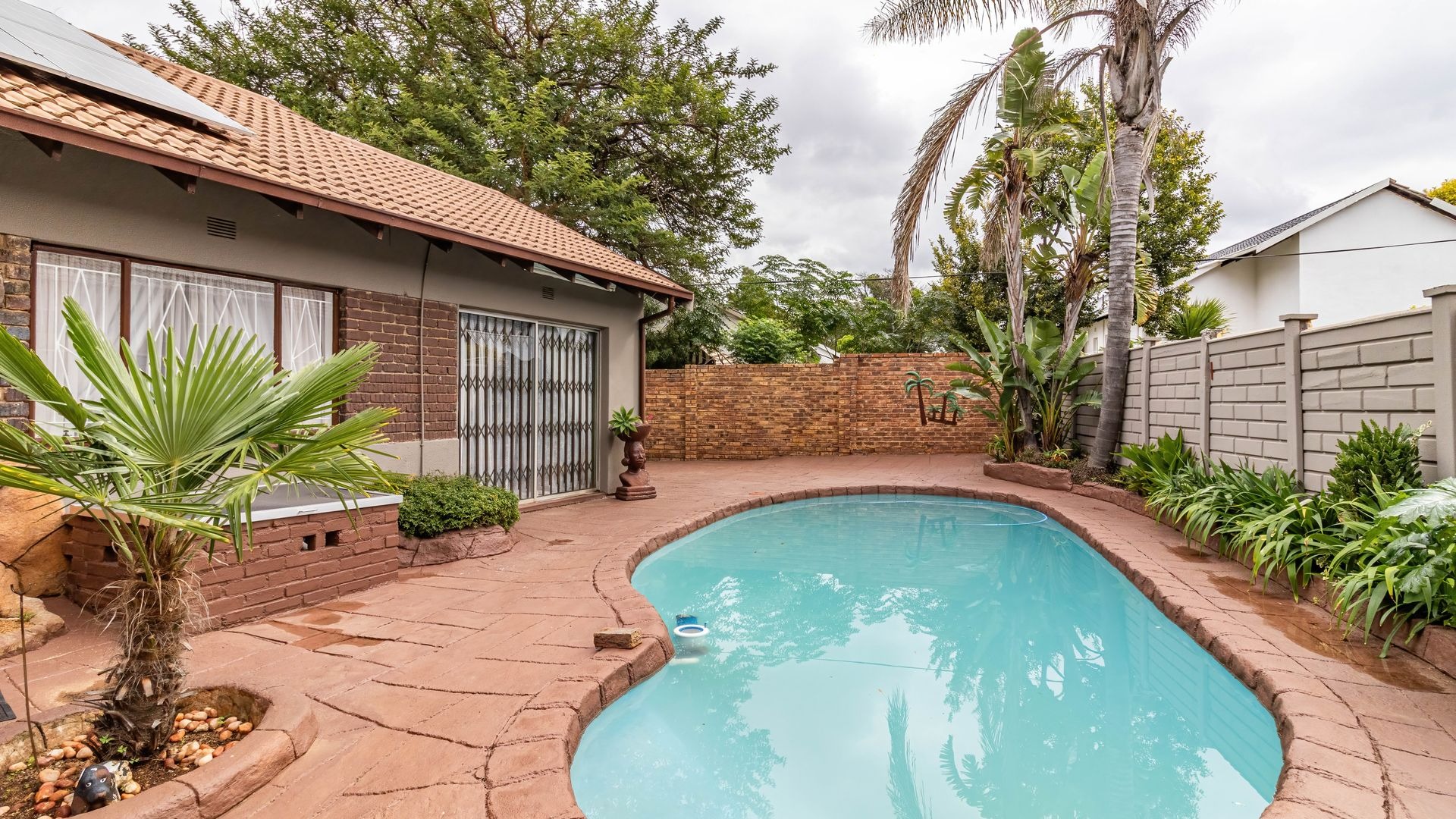 The outdoor area is a true highlight, featuring a private swimming pool and a spacious garden on a 792 square metre erf, ideal for leisure and outdoor activities. Zozo hut, outside furniture and pergola to stay. Practical elements such as a single garage, two additional covered parking spaces, and outside toilets add to the convenience. Security is enhanced with burglar bars, a fence, and an intercom system. Furthermore, the property is wheelchair-friendly and allows pets, accommodating diverse lifestyle needs.
