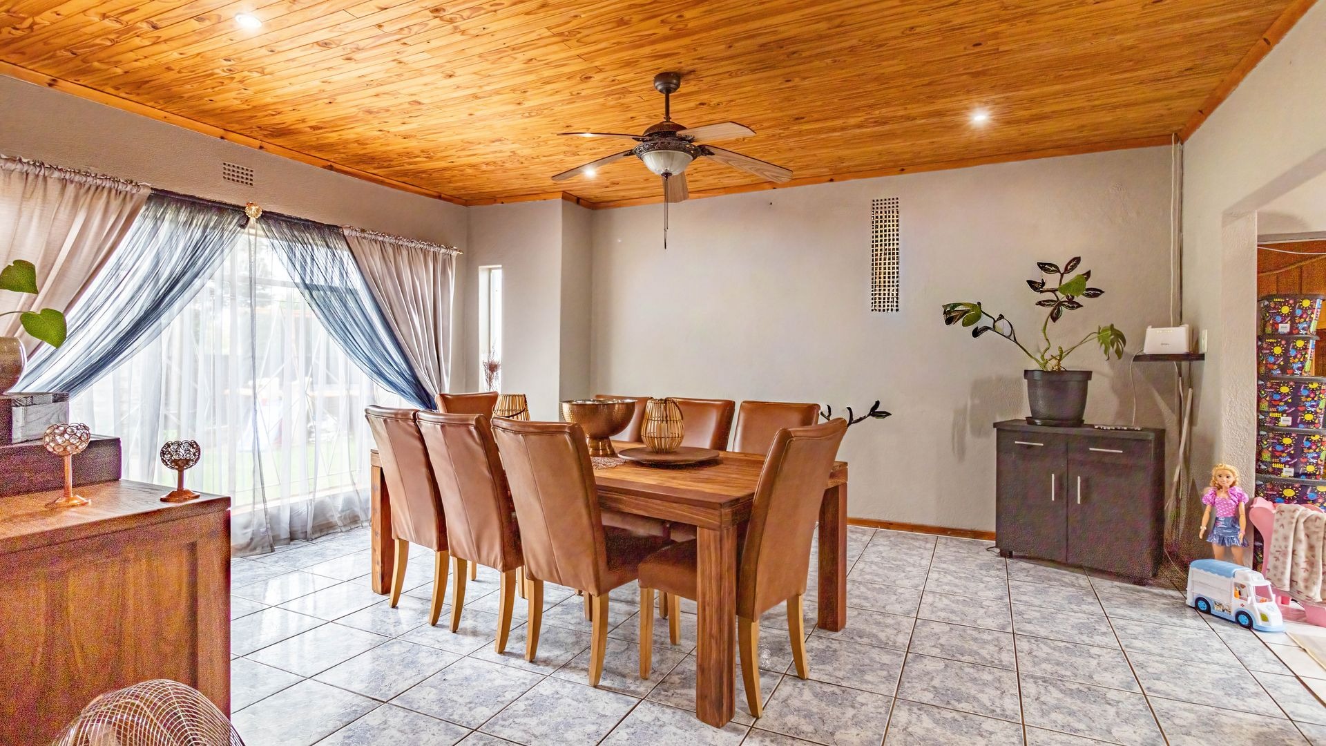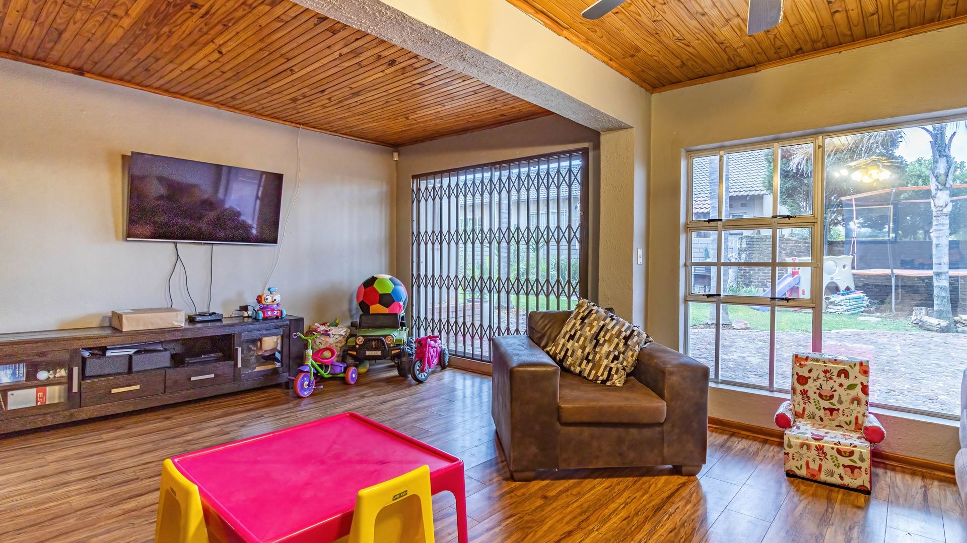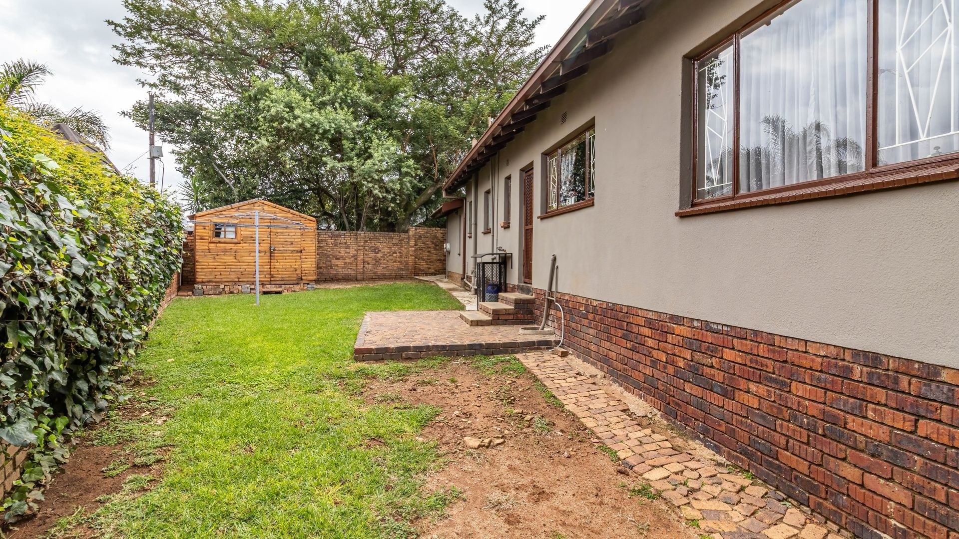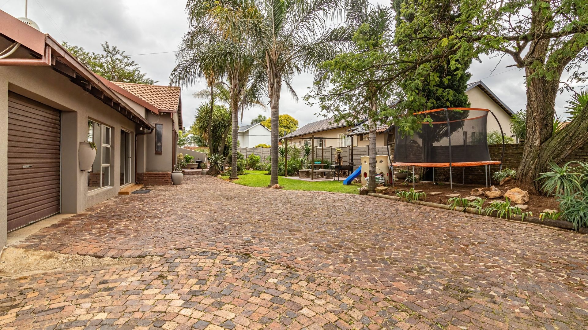 The outdoor area is a true highlight, featuring a private swimming pool and a spacious garden on a 792 square metre erf, ideal for leisure and outdoor activities. Zozo hut, outside furniture and pergola to stay. Practical elements such as a single garage, two additional covered parking spaces, and outside toilets add to the convenience. Security is enhanced with burglar bars, a fence, and an intercom system. Furthermore, the property is wheelchair-friendly and allows pets, accommodating diverse lifestyle needs.