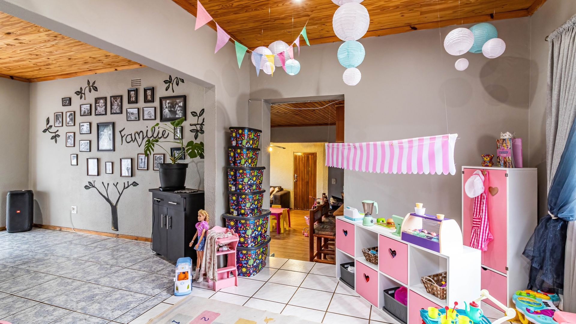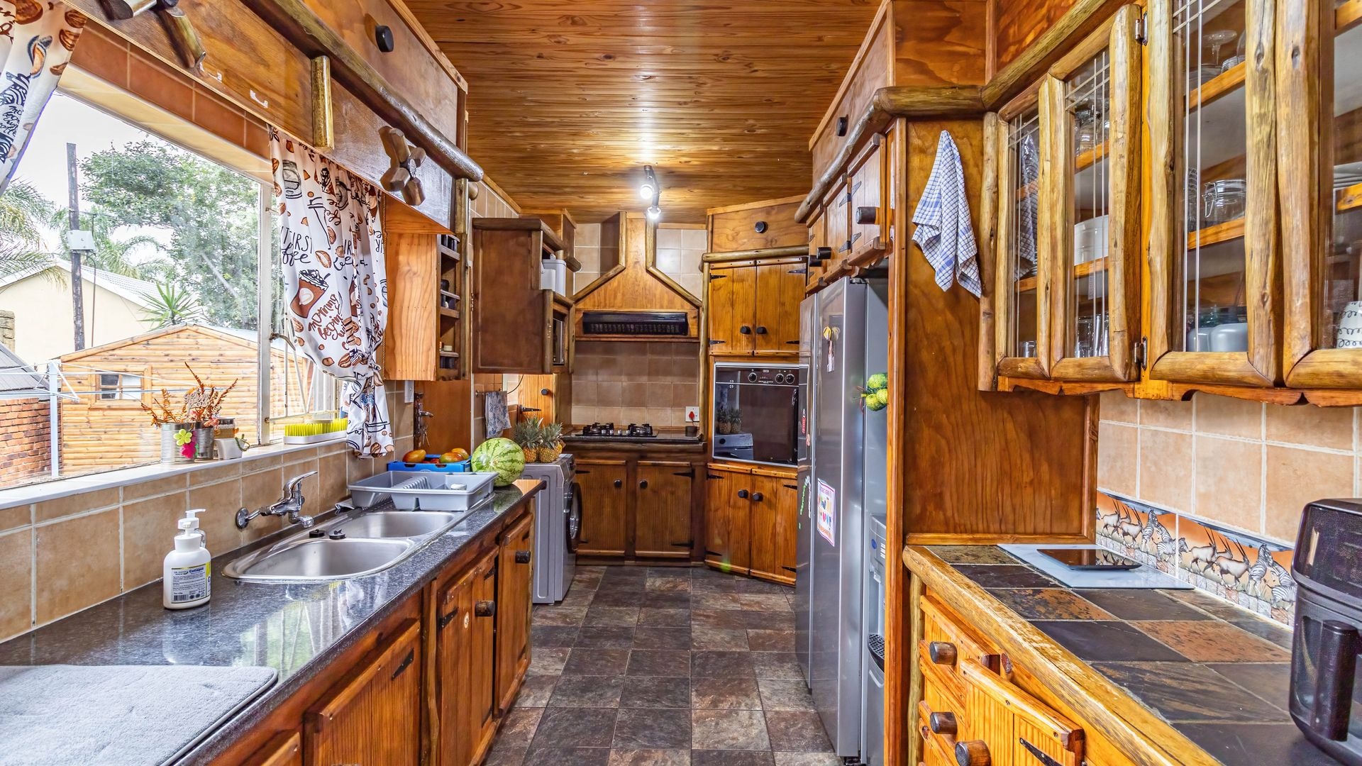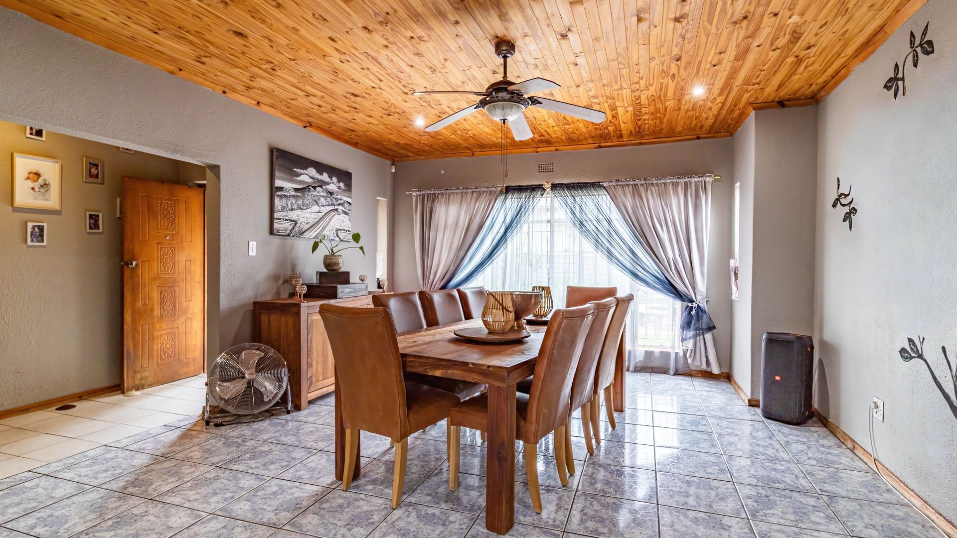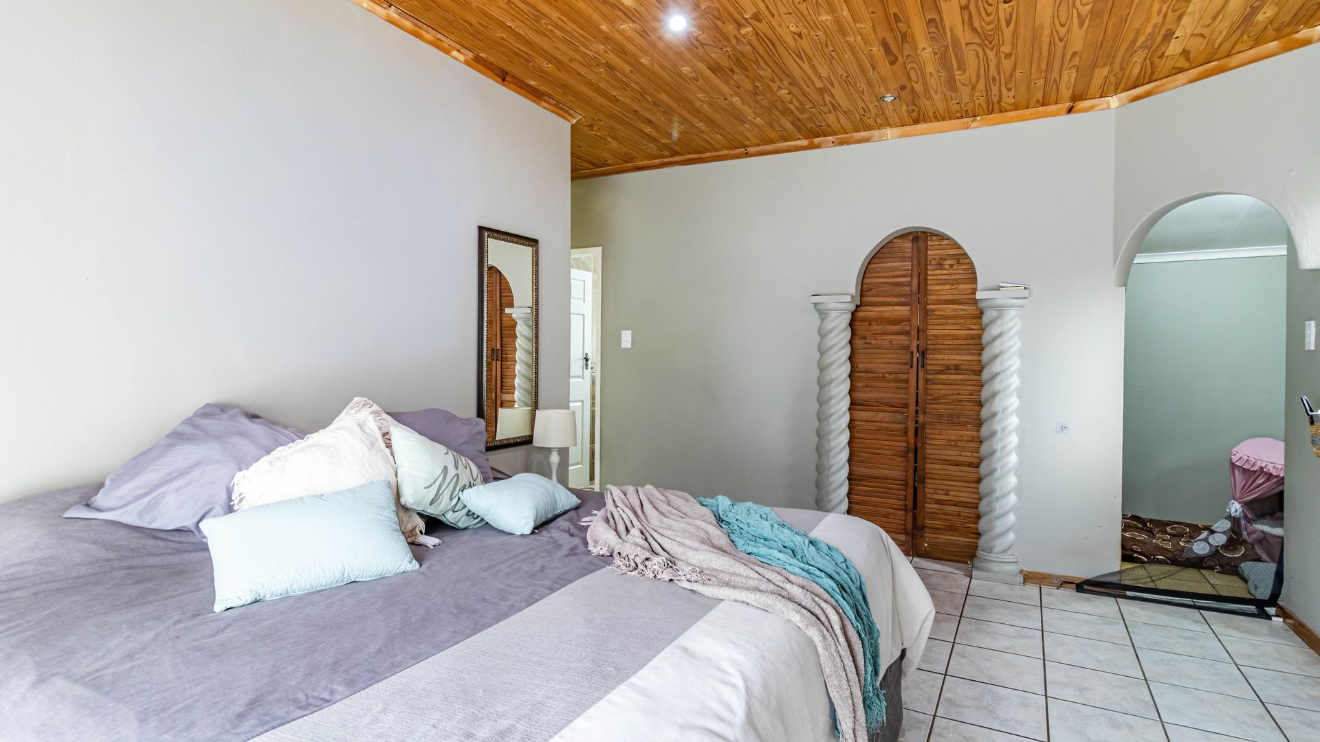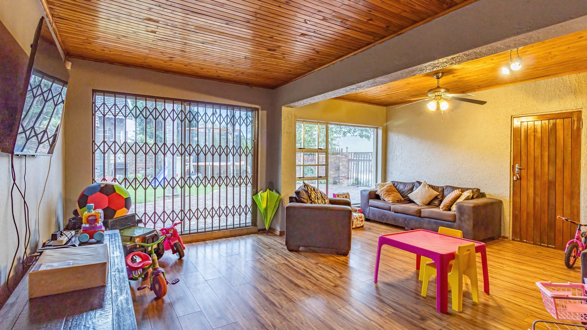 The outdoor area is a true highlight, featuring a private swimming pool and a spacious garden on a 792 square metre erf, ideal for leisure and outdoor activities. Zozo hut, outside furniture and pergola to stay. Practical elements such as a single garage, two additional covered parking spaces, and outside toilets add to the convenience. Security is enhanced with burglar bars, a fence, and an intercom system. Furthermore, the property is wheelchair-friendly and allows pets, accommodating diverse lifestyle needs.