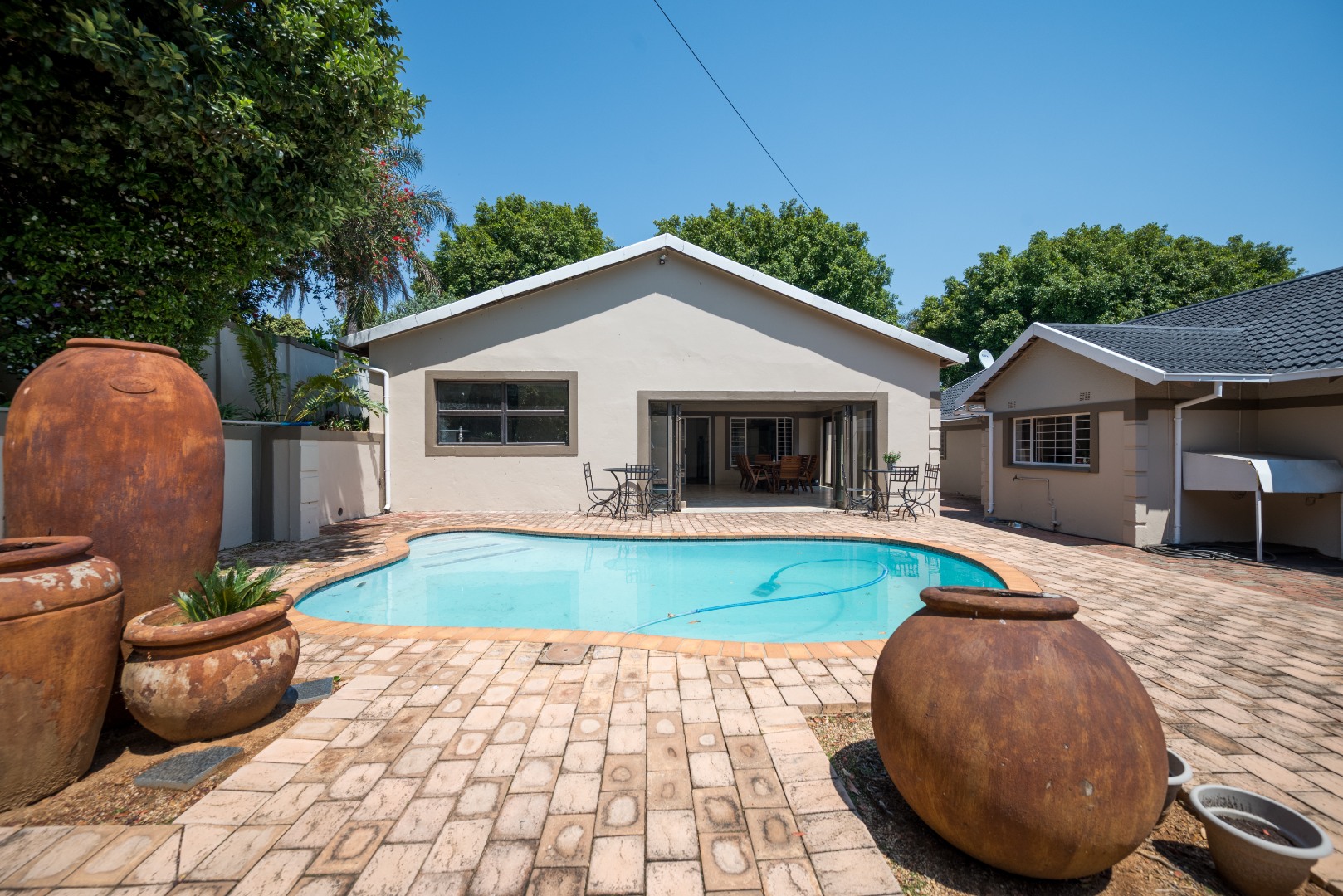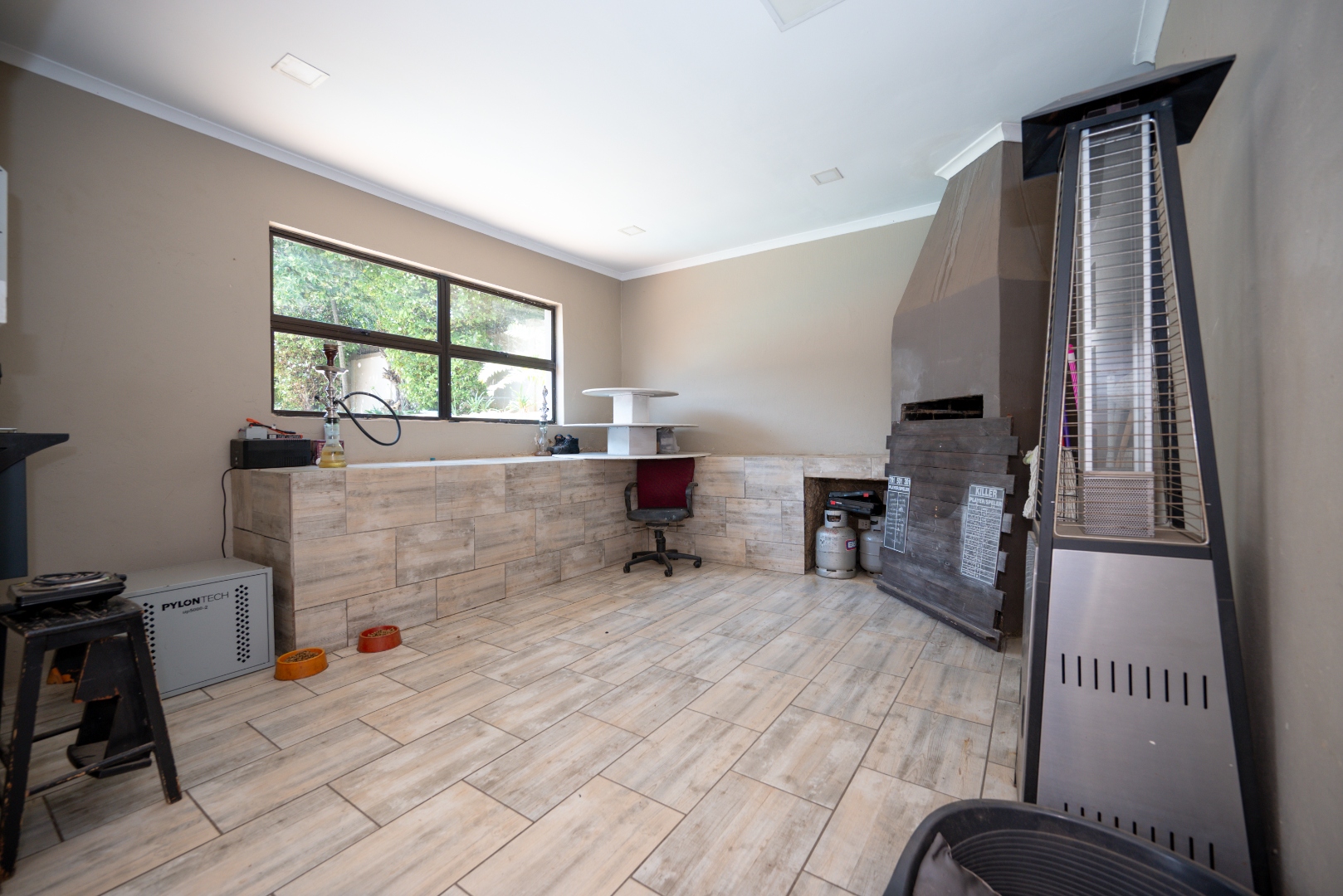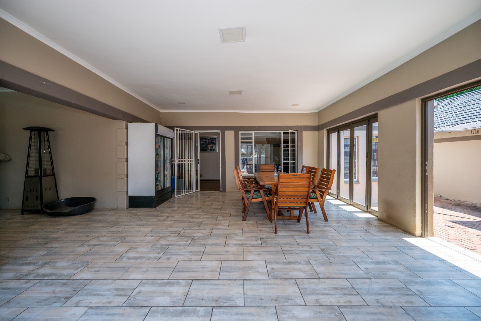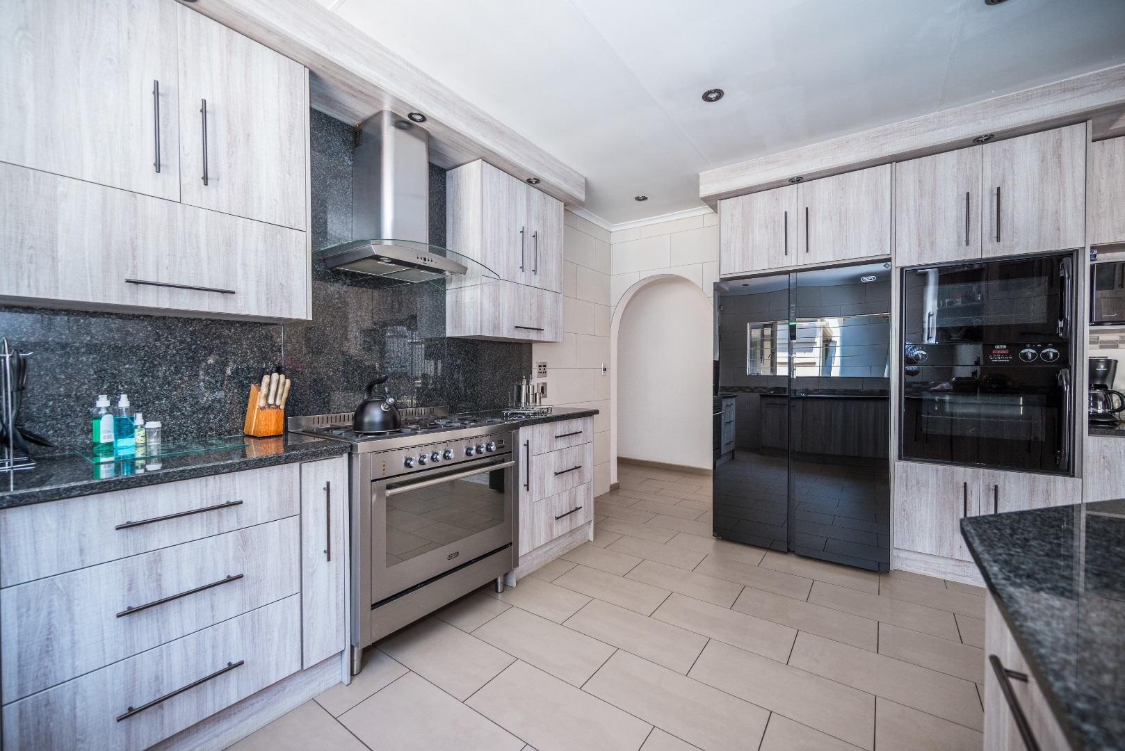 This is a stunning modern 4 bedroom/2bathroom family home with 170 m2 flat and sparkling pool. This family home offers 4 large sunny bedrooms with build-in-cupboards, The main bedroom comes with a full bathroom with bath and shower. There is a modern family bathroom. The kitchen is modern and well fitted and offers gas stove and double fitted ovens and granite tops and offers lots of countertops. The kitchen can fit double door fridge. The kitchen leads onto tiled dining room. There is a formal lounge and family room with large windows and sliding door to patio. There is a 170 sqm flat with 1 bedroom (previously a 3 bedroom), bathroom, kitchen, laundry and dining room with large living are with stacking doors. Full Domestic room with bathroom. There is a sparkling pool, Jacuzzi and Boma. Storeroom. There are a tandem garage and 4 carports. The garden is well maintained and there is a borehole and pop-up sprinkler system. Yoyo tank with water purifier system. The 5 KVA Invertor with Lithium batteries and 8 Solar panels. This property offers a lot of space and extra's. This is a must view property. Phone today to view!!!!!