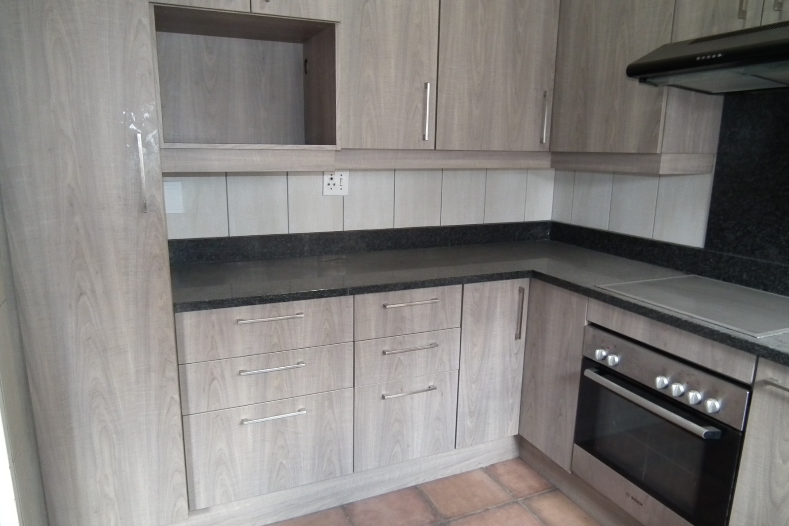 Step inside this inviting home, where an open-plan layout seamlessly connects the living spaces. The modern kitchen is a highlight, featuring sleek light wood-grain laminate cabinets, durable dark speckled granite countertops, and integrated stainless steel appliances including a Bosch oven/stove, hob, and extractor fan. A practical double sink and tiled backsplash complete this functional space. The property includes a comfortable lounge and an open plan dining room, providing ample space for relaxation and entertaining.