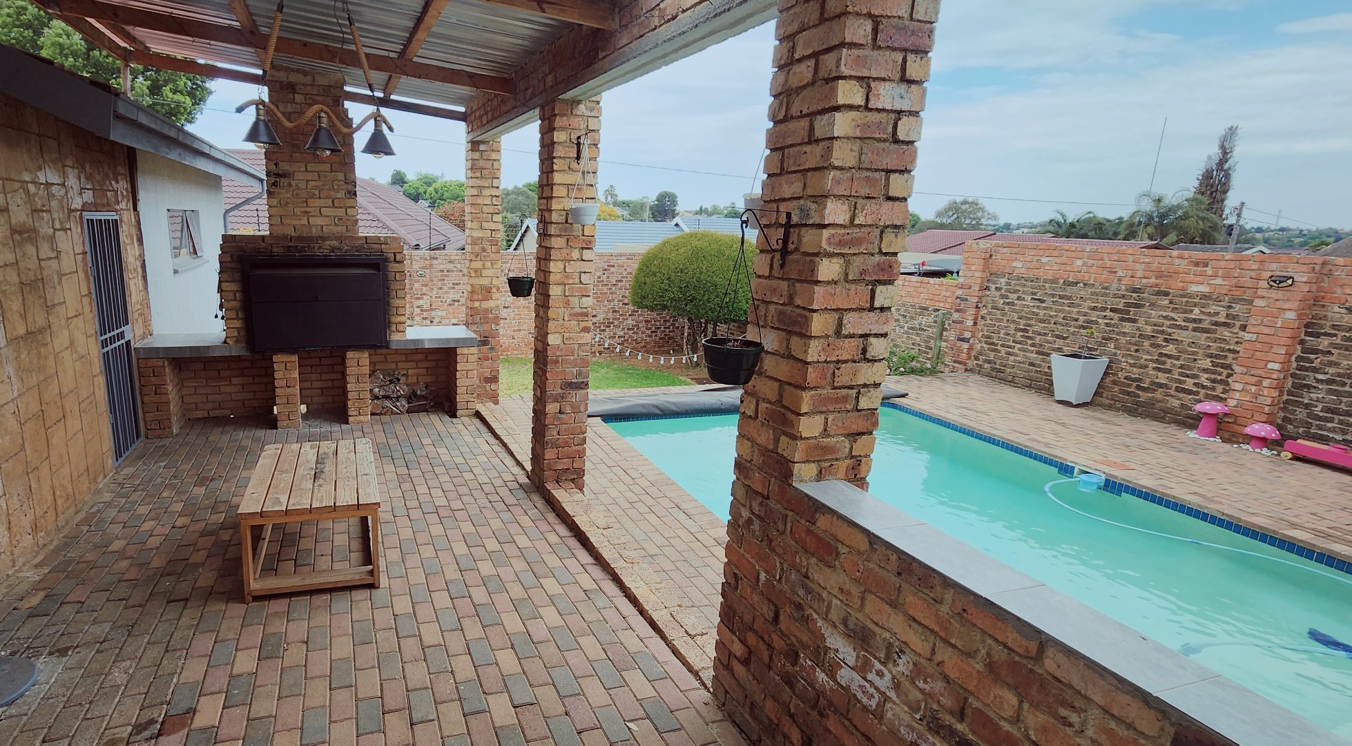 Step outside to a private outdoor oasis designed for leisure and social gatherings. A spacious covered patio features a built-in braai area, overlooking a refreshing swimming pool.