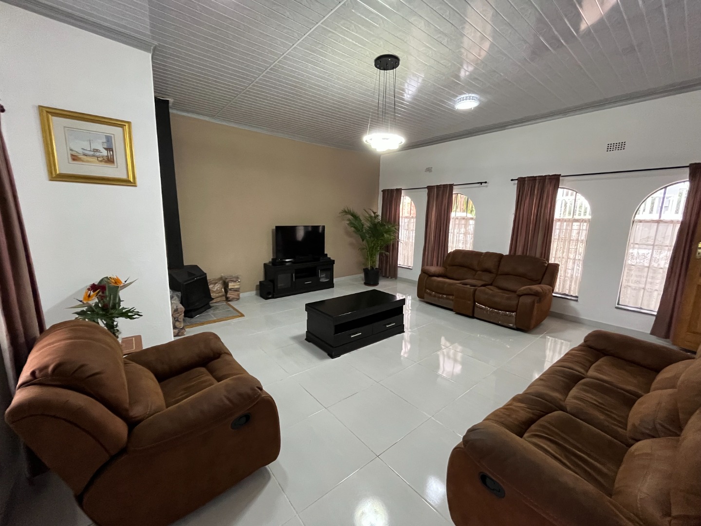 The interior features spacious living areas with durable tiled flooring, offering comfort and functionality. Enjoy the warmth of a wood-burning stove or functional fireplace, complemented by natural light from arched windows. The well-appointed kitchen provides extensive light wood cabinetry, dark laminate countertops, a built-in stove/oven, double sink, and a convenient pass-through window. A dedicated recreation room offers an ideal space for entertainment and relaxation.