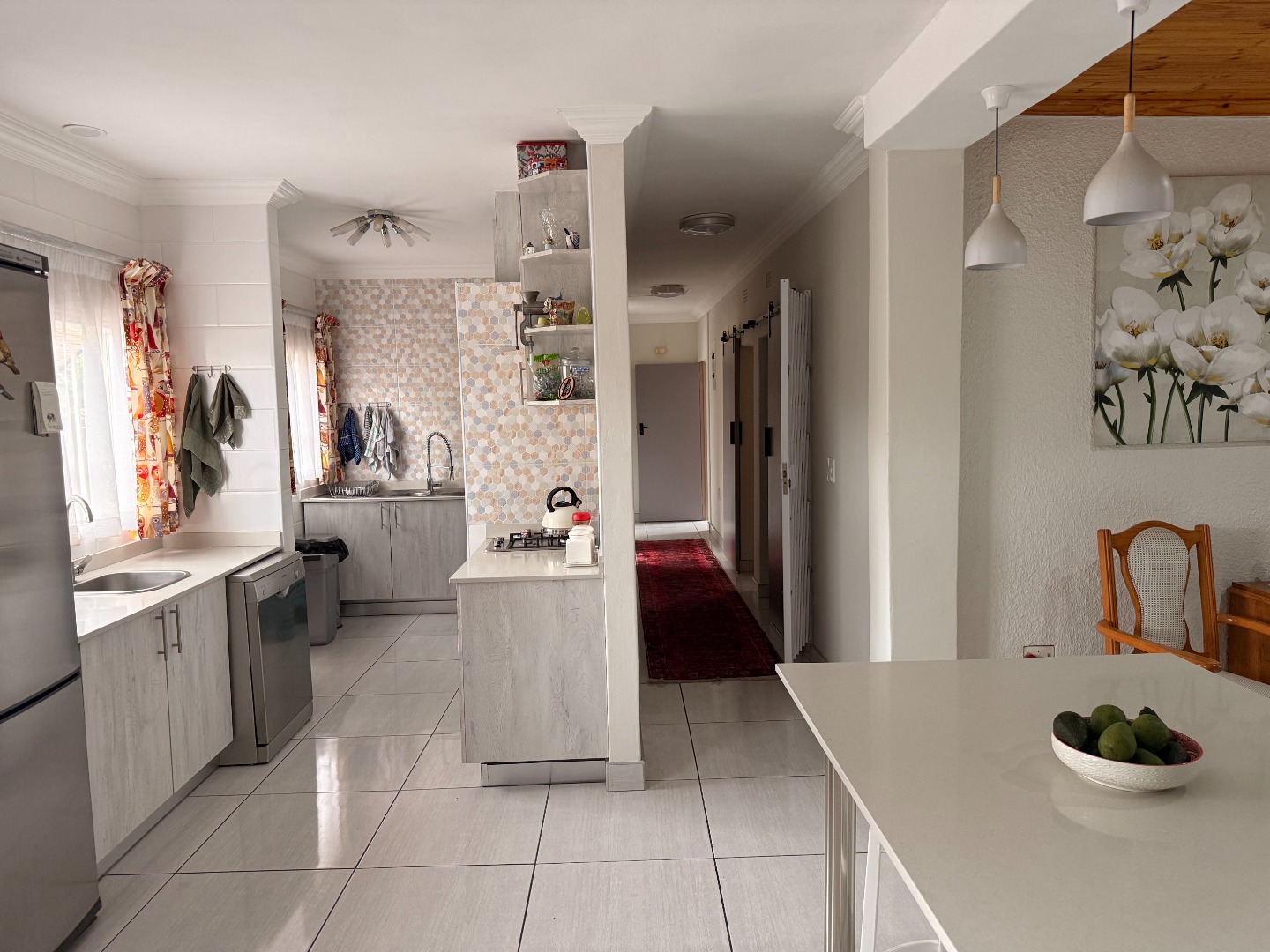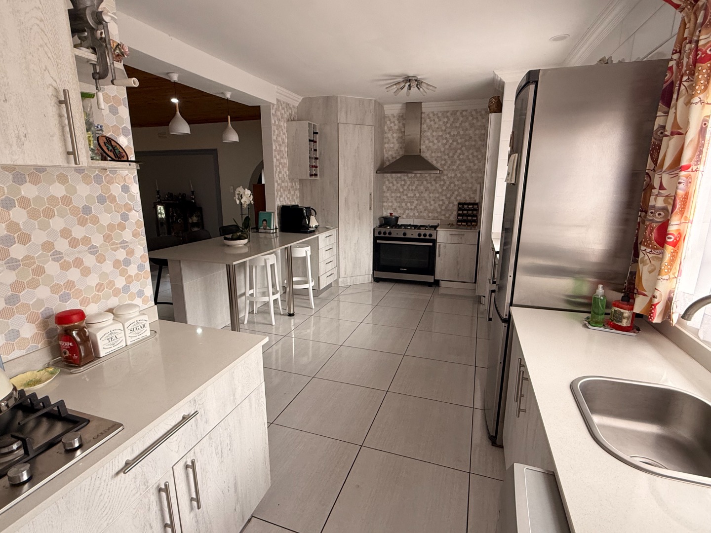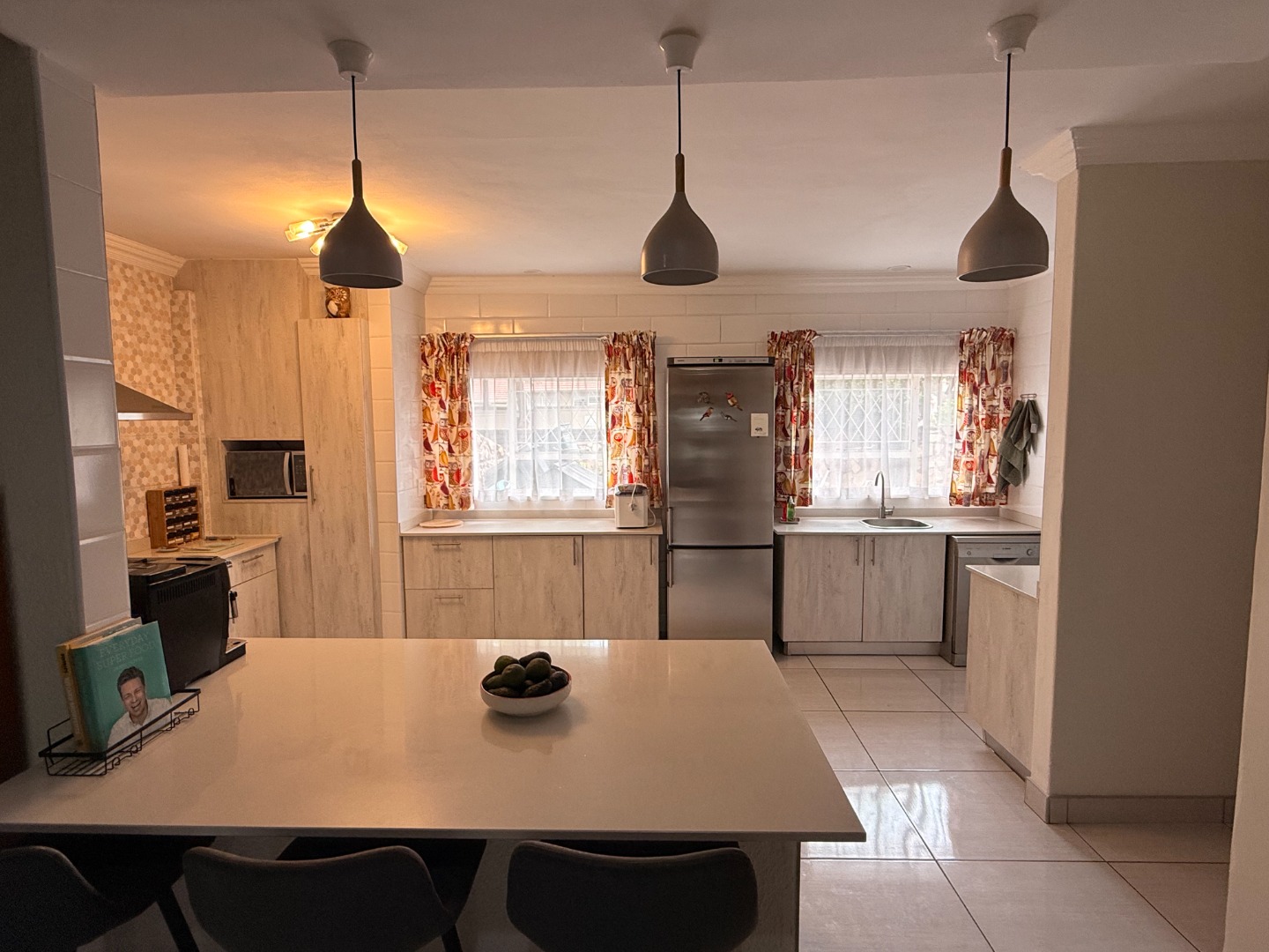 The open plan kitchen is a masterpiece! Caesar stone tops add an elegant touch, and there is more than enough cupboard and counter space. A gas hob and oven ensures cooking and baking are a pleasure. The adjoining scullery houses your appliances and other household needs.