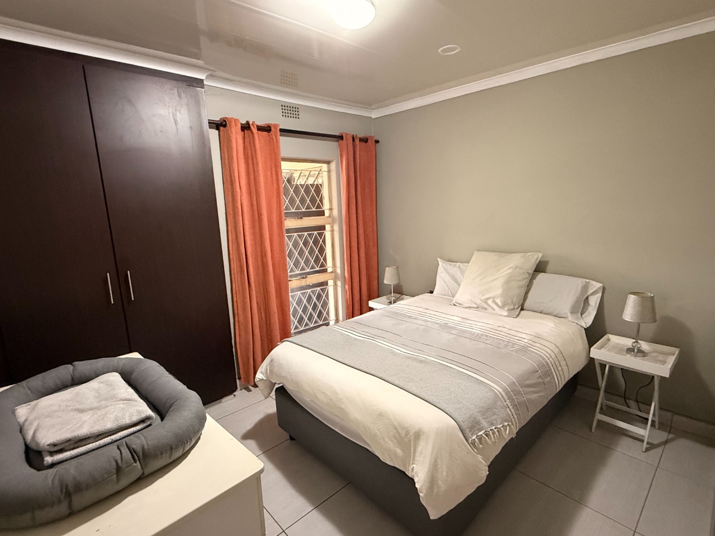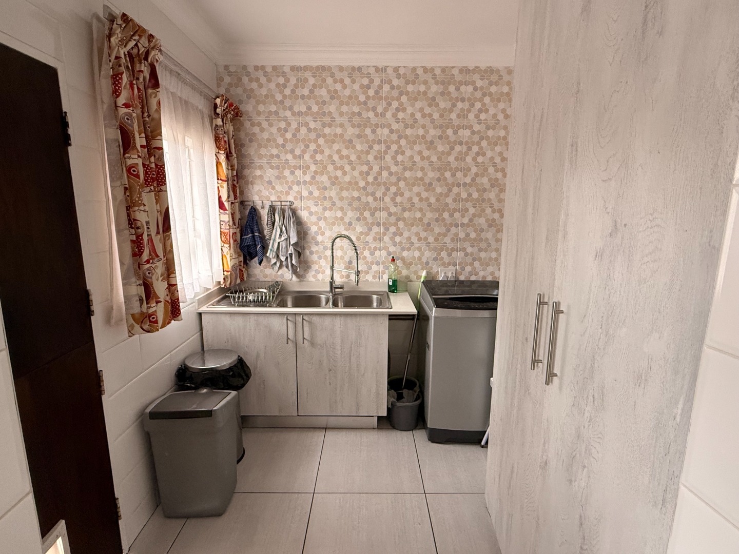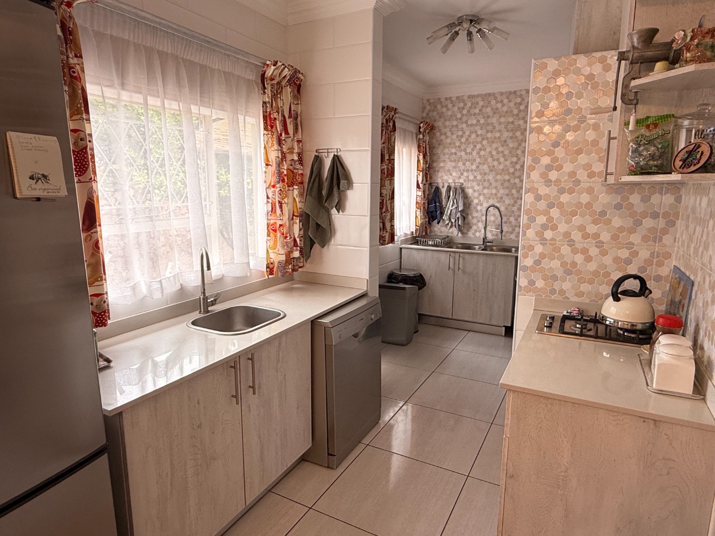 The open plan kitchen is a masterpiece! Caesar stone tops add an elegant touch, and there is more than enough cupboard and counter space. A gas hob and oven ensures cooking and baking are a pleasure. The adjoining scullery houses your appliances and other household needs.