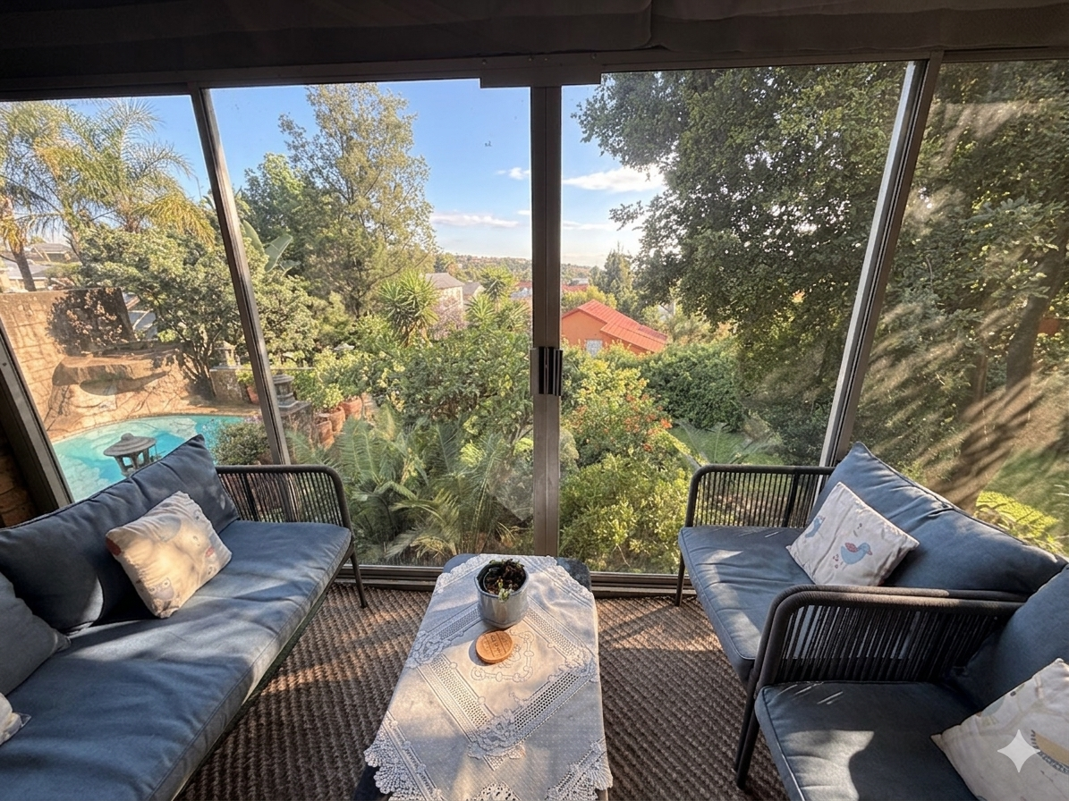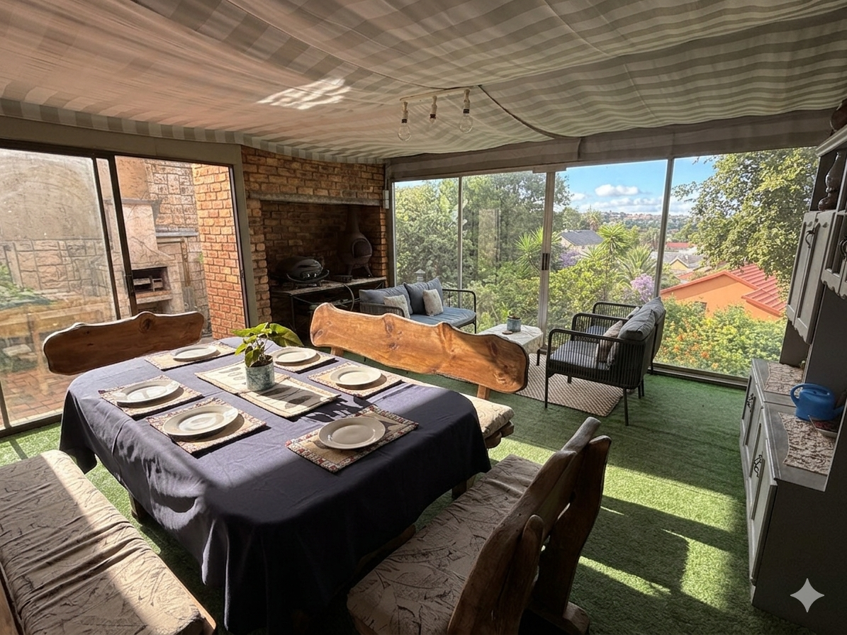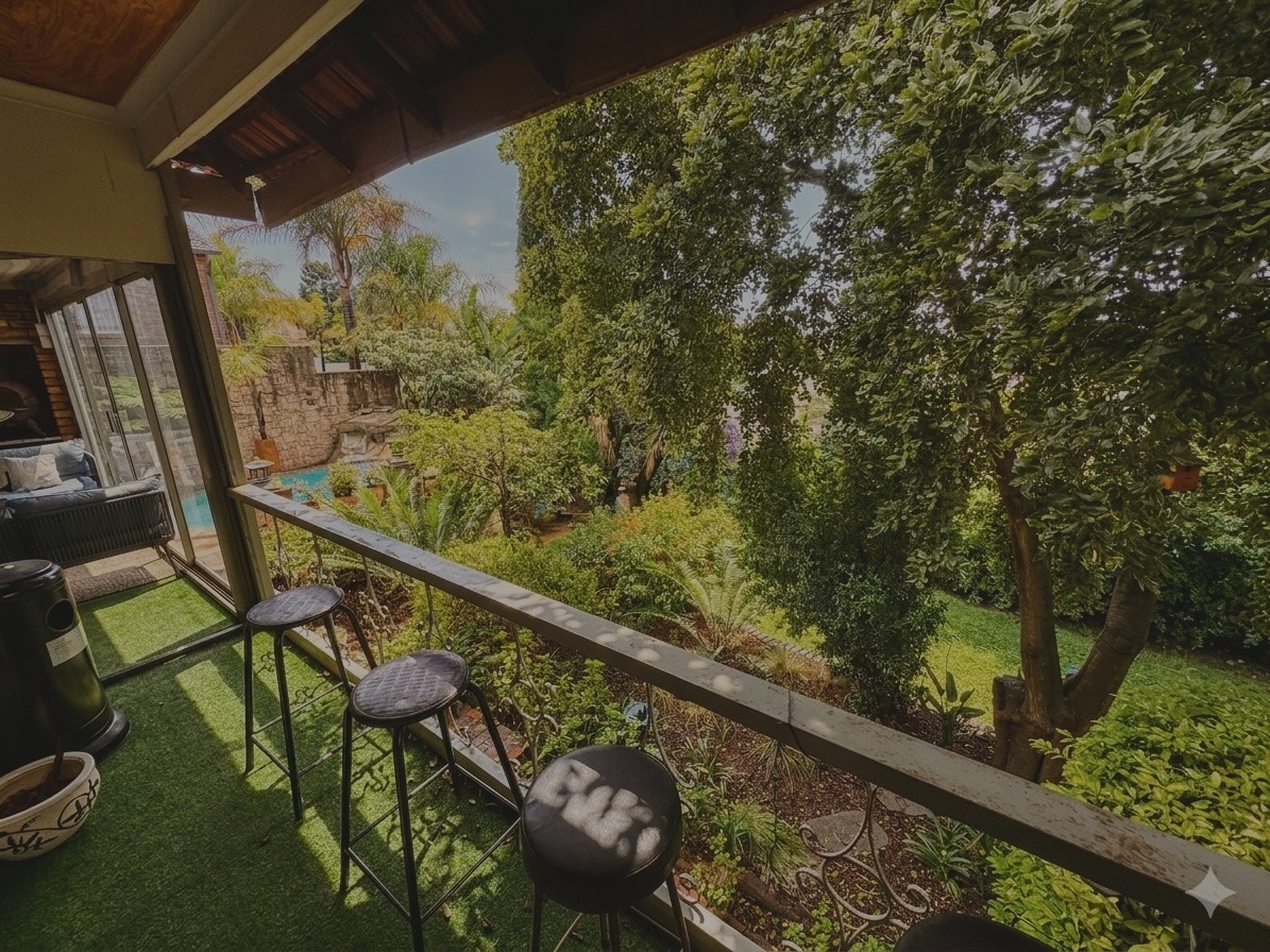 Step outside to a private oasis with a refreshing swimming pool, welcoming patio, and built-in braai, perfect for outdoor entertaining. The established garden offers a serene backdrop. Practical amenities include four garages, staff quarters, and a study. Modern comforts like air conditioning and solar panels ensure an efficient lifestyle. Security is well-addressed with burglar bars, a security gate, and a fully walled perimeter.