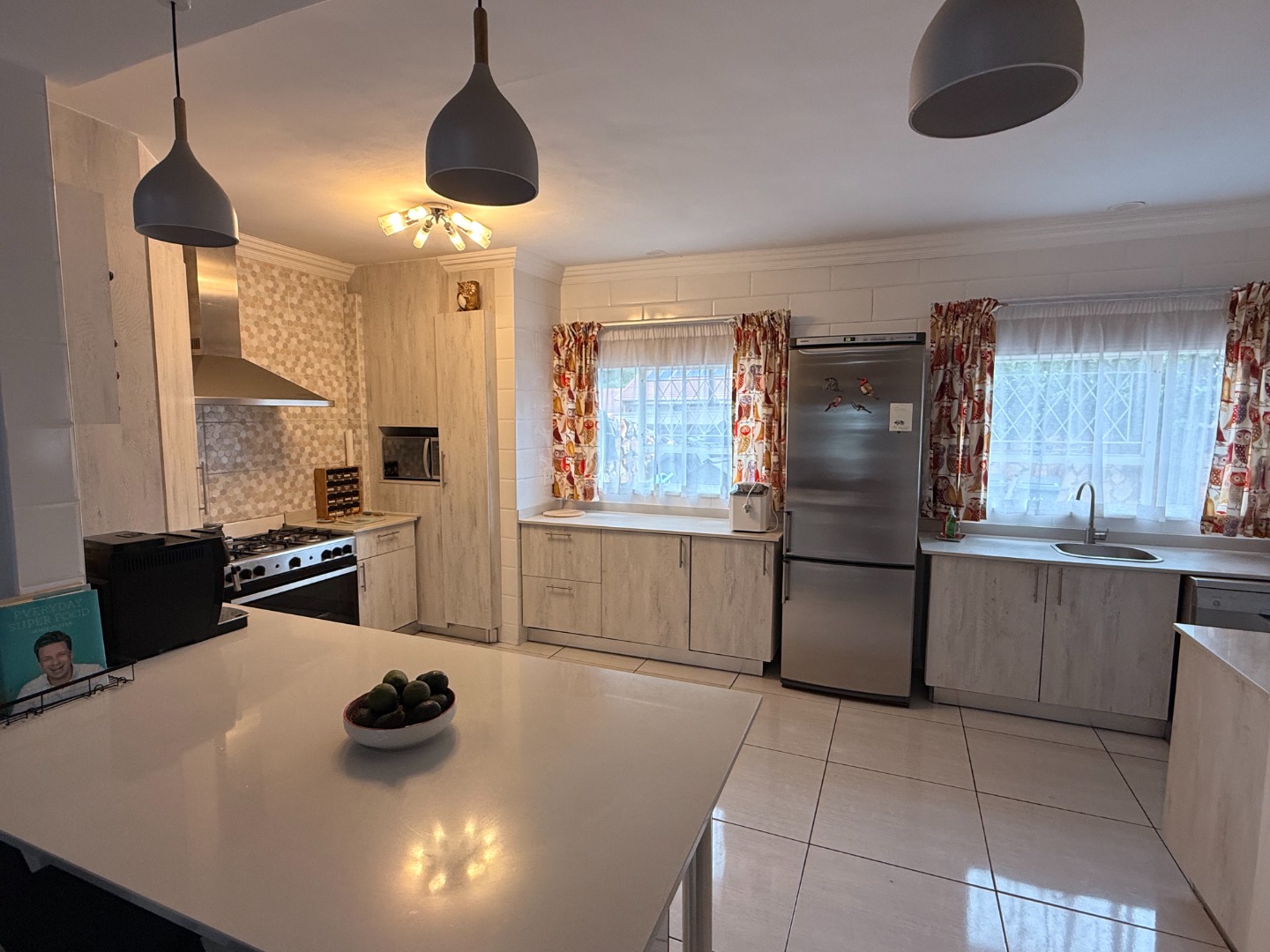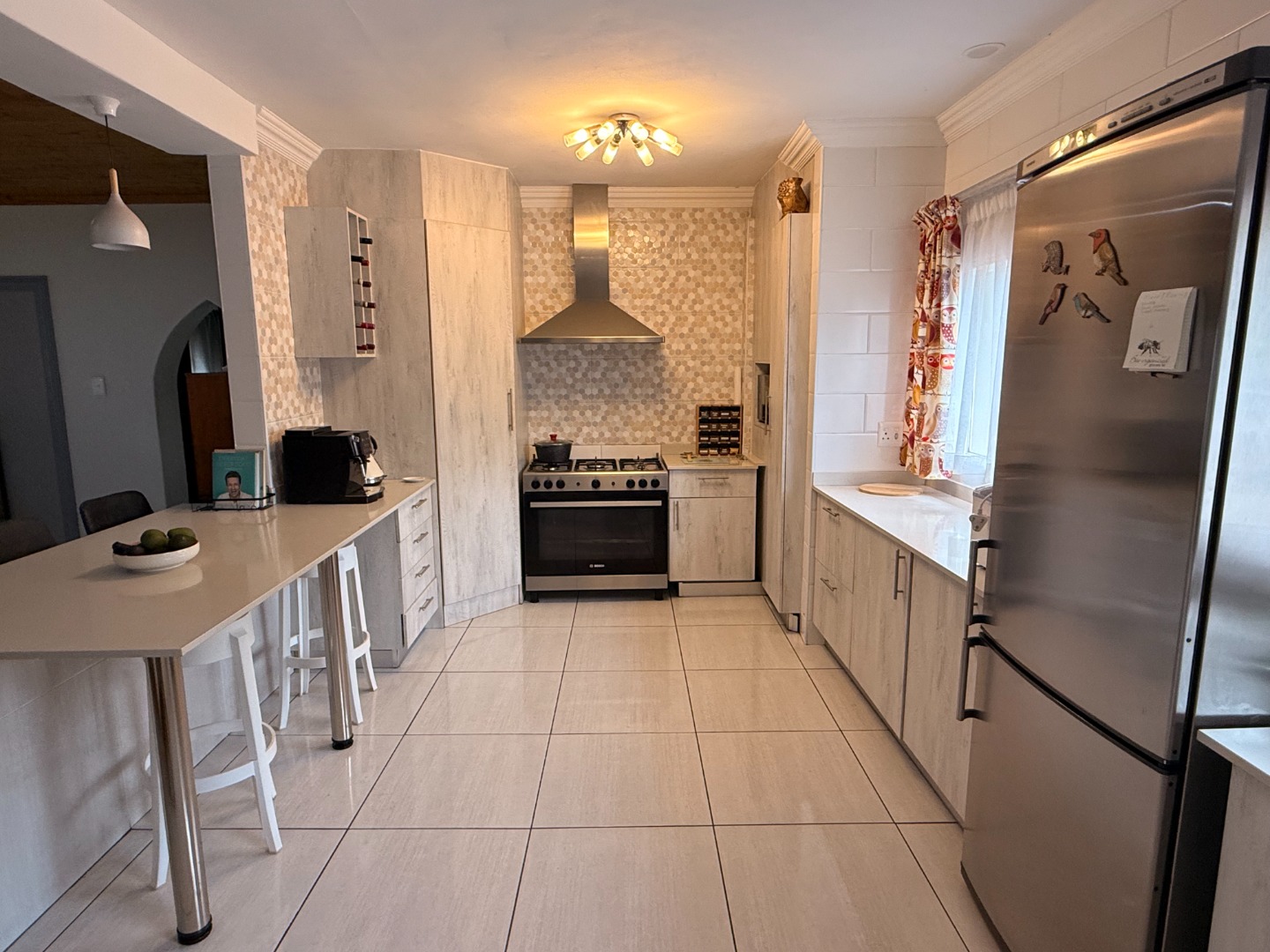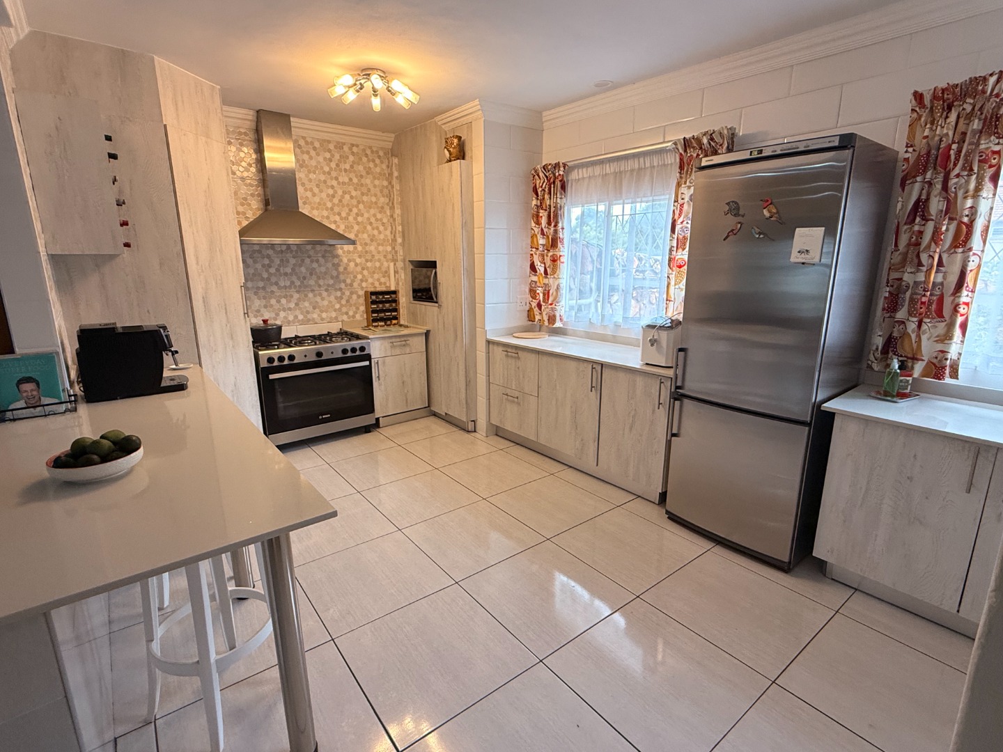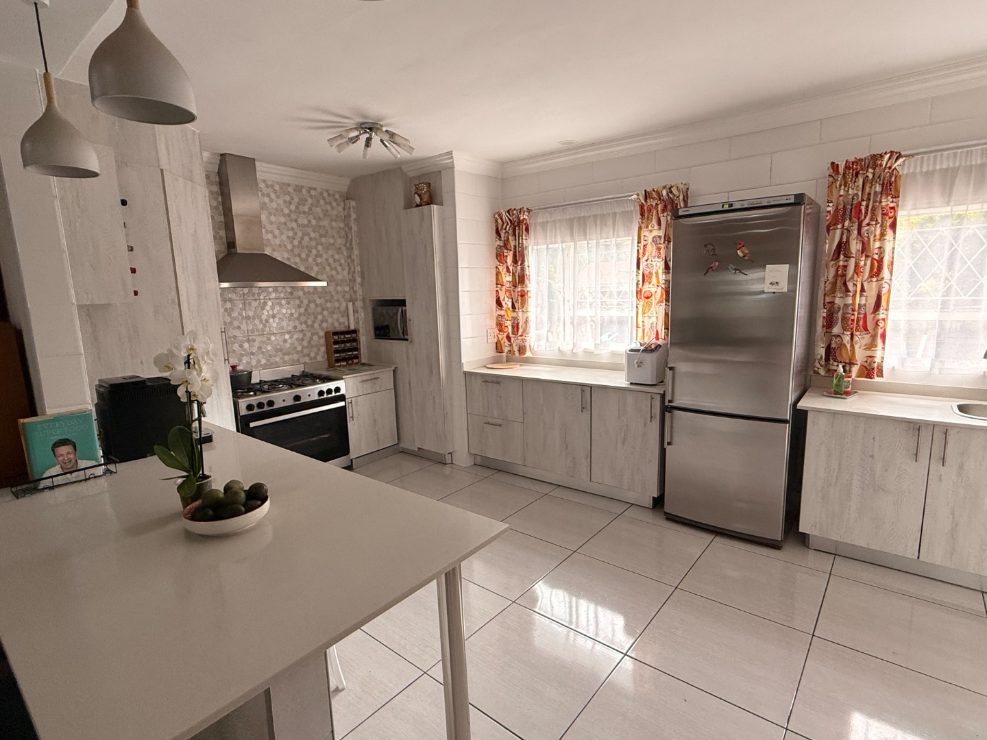 The open plan kitchen is a masterpiece! Caesar stone tops add an elegant touch, and there is more than enough cupboard and counter space. A gas hob and oven ensures cooking and baking are a pleasure. The adjoining scullery houses your appliances and other household needs.