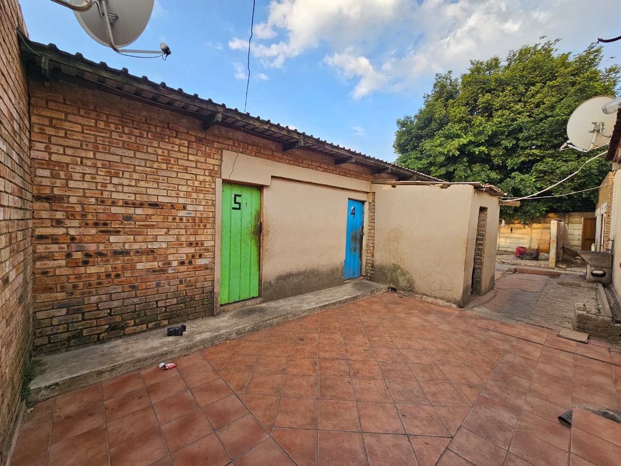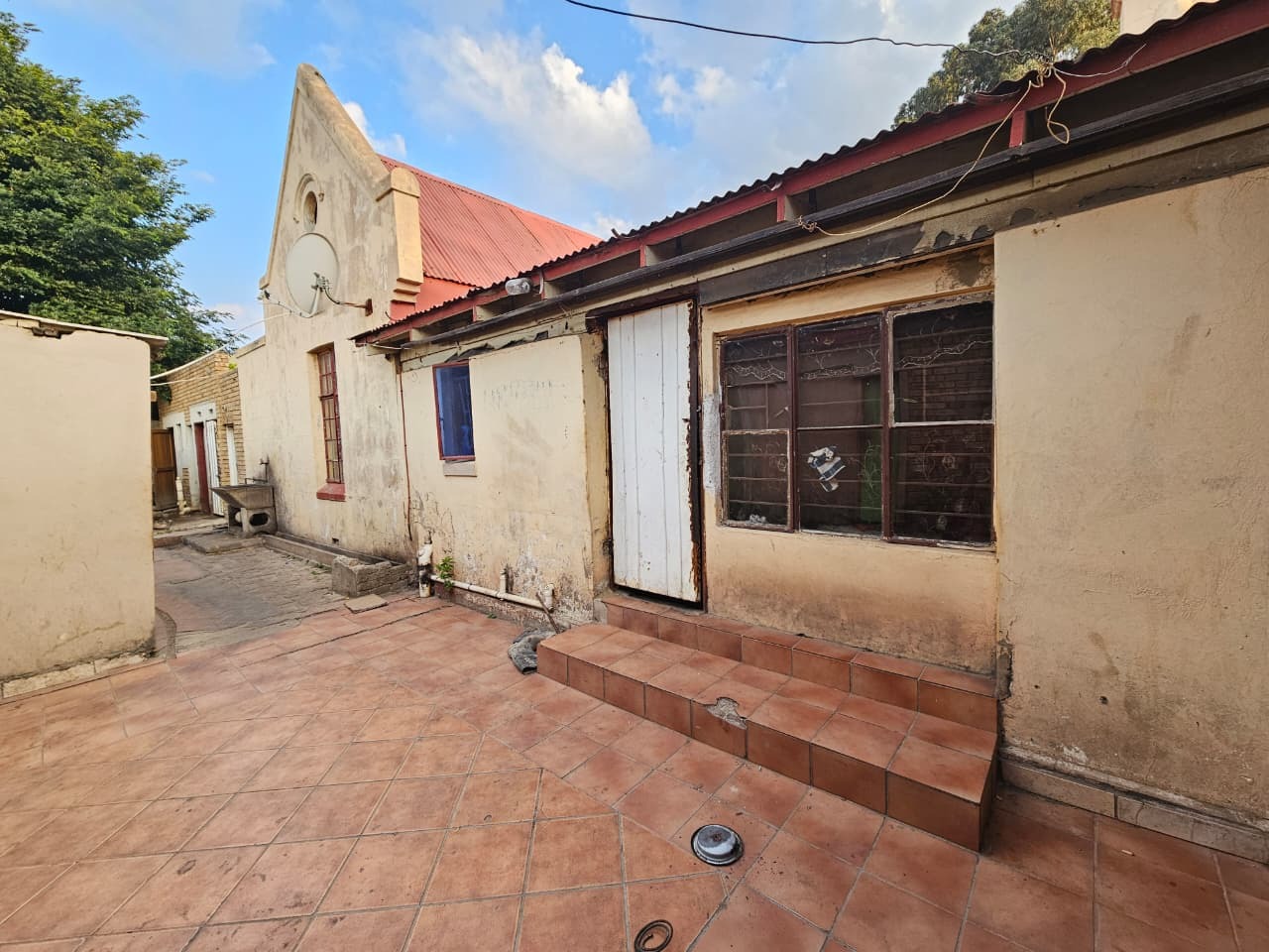 While currently requiring significant attention, the property includes paved outdoor areas and mature trees, offering a foundation for creating inviting exterior spaces. A dedicated parking space adds practical value. The current state of disrepair, visible in peeling paint, cracked walls, and unkempt grounds, underscores the need for comprehensive renovation, transforming it into a contemporary and desirable residence.