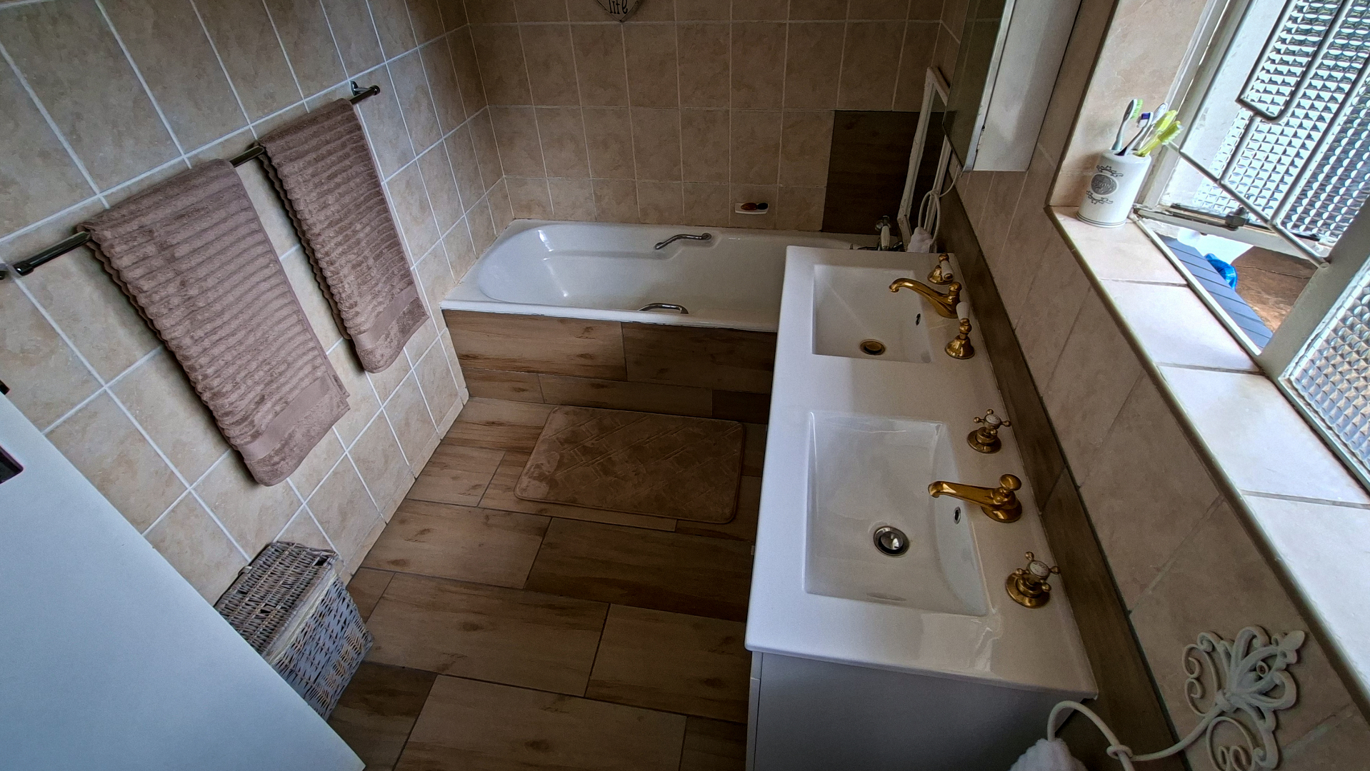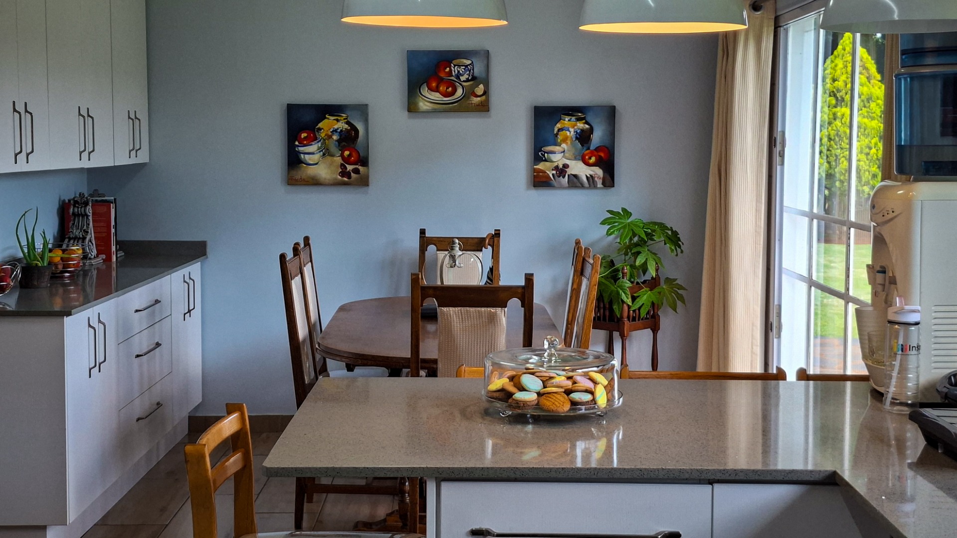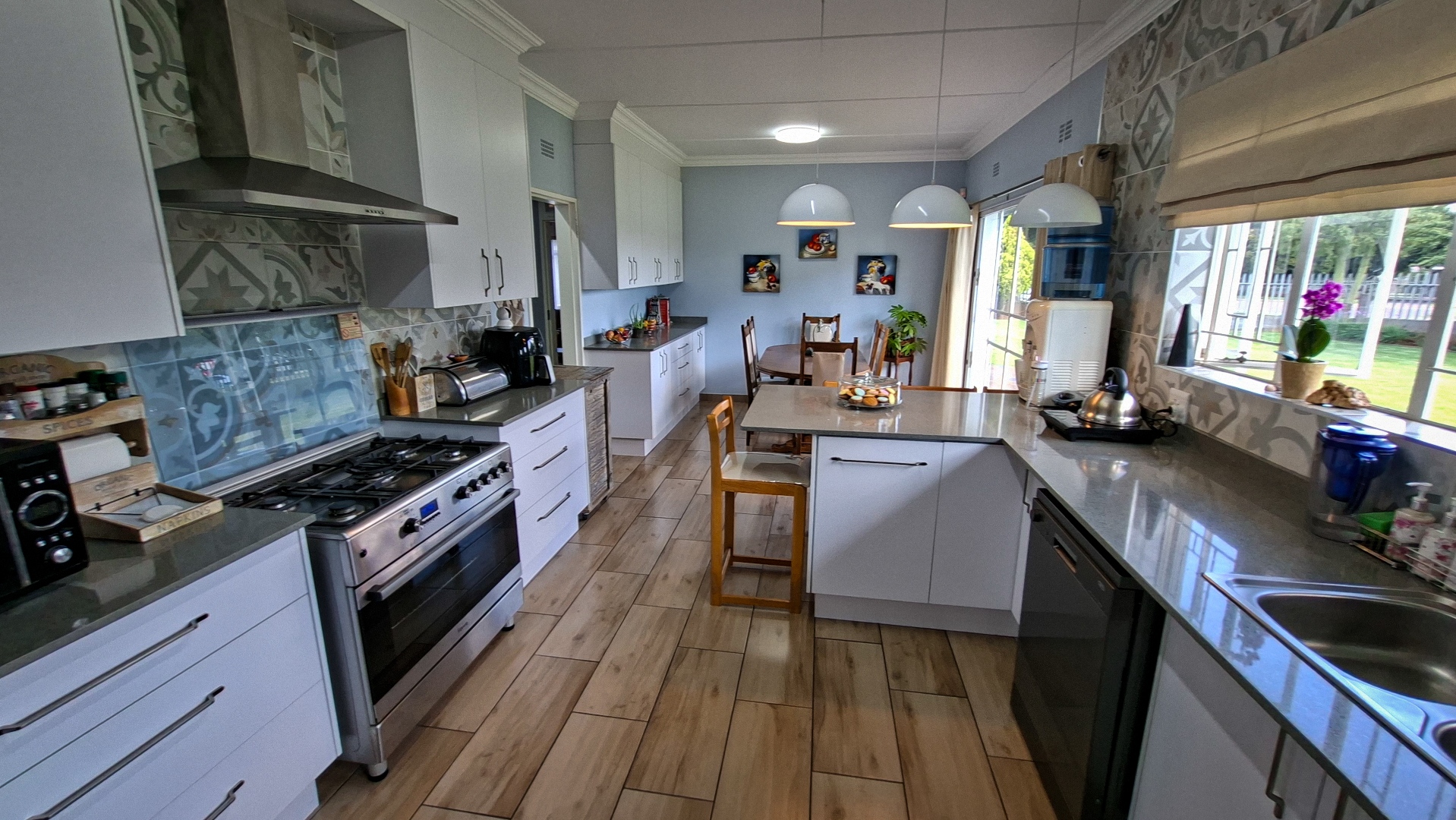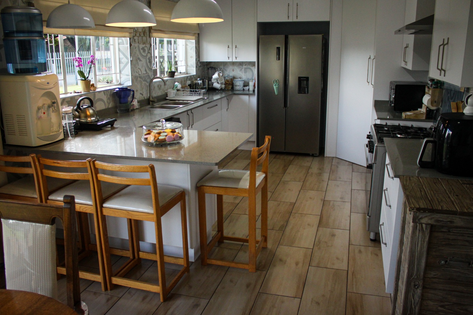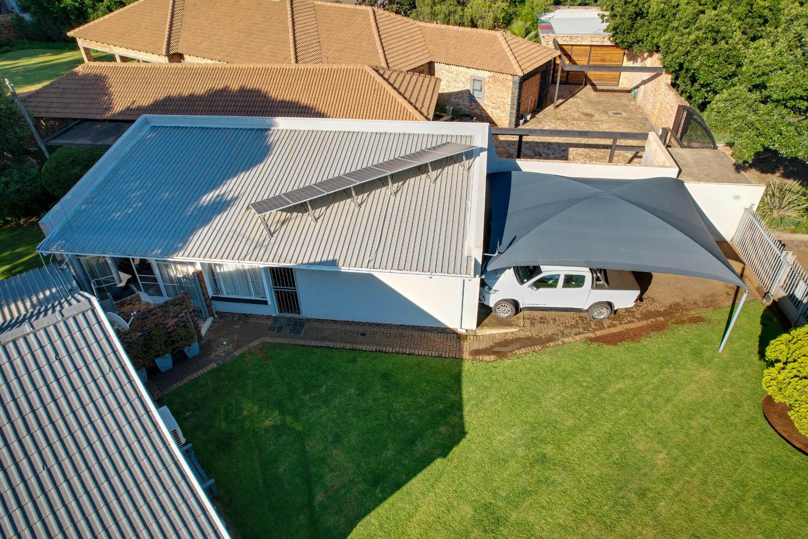 Emphasising modern living and sustainability, the residence is equipped with solar panels and a battery inverter, significantly enhancing energy efficiency and providing resilience against power interruptions. A borehole, irrigation system, and sprinkler system ensure the lush garden remains vibrant with minimal effort. Security is paramount, with an alarm system and a totally walled perimeter providing peace of mind. Fibre connectivity is also available, catering to contemporary digital demands.