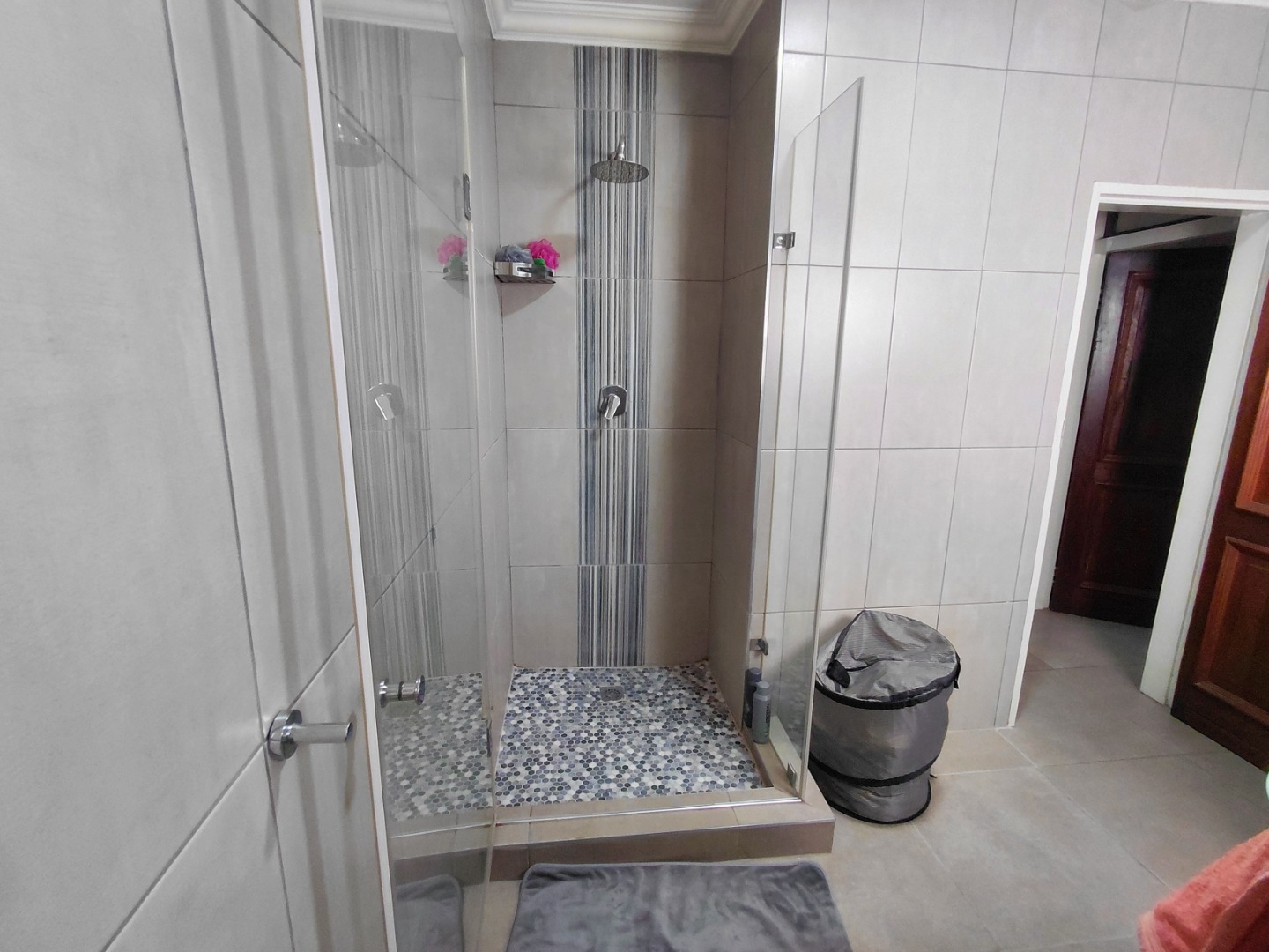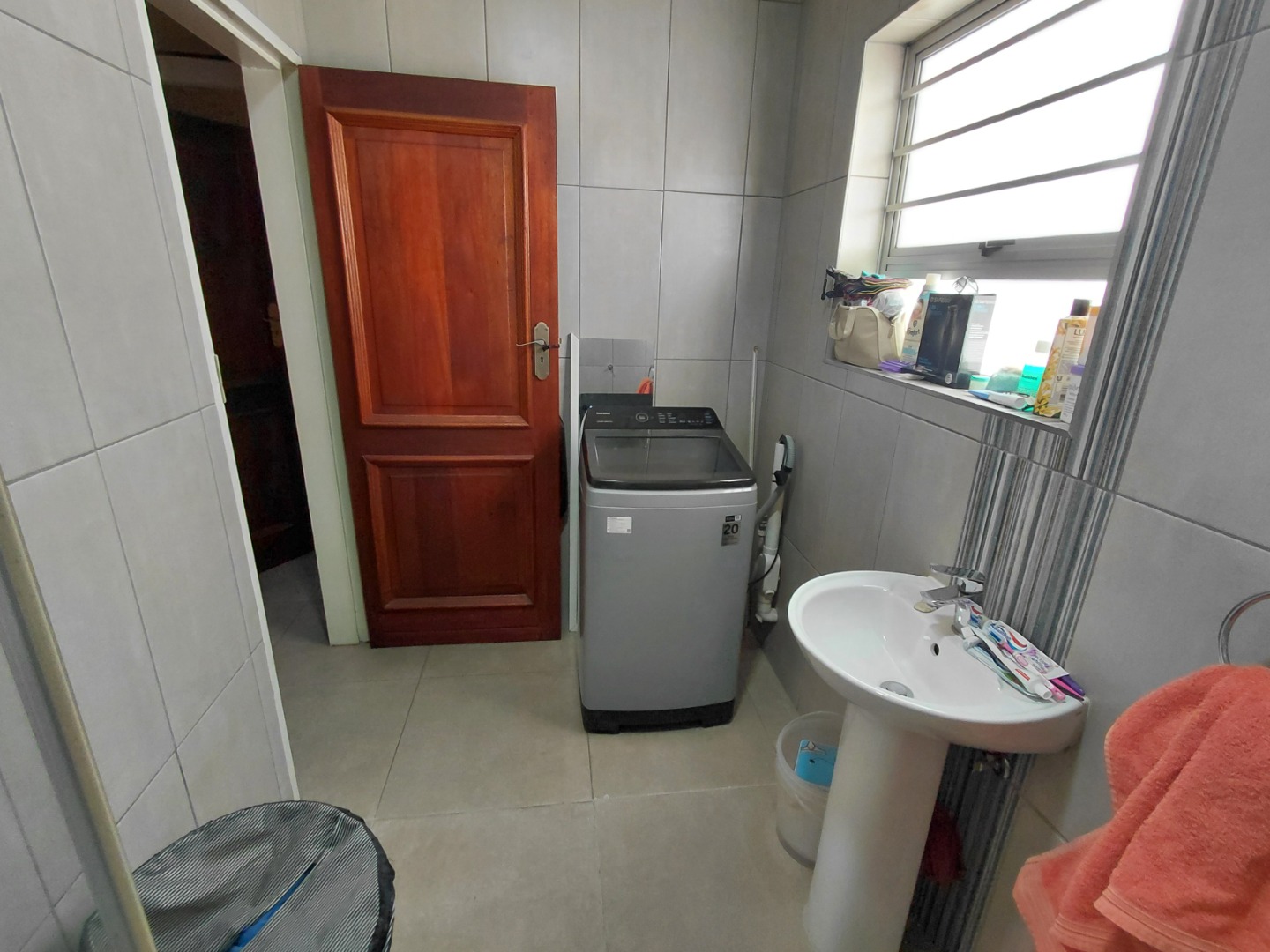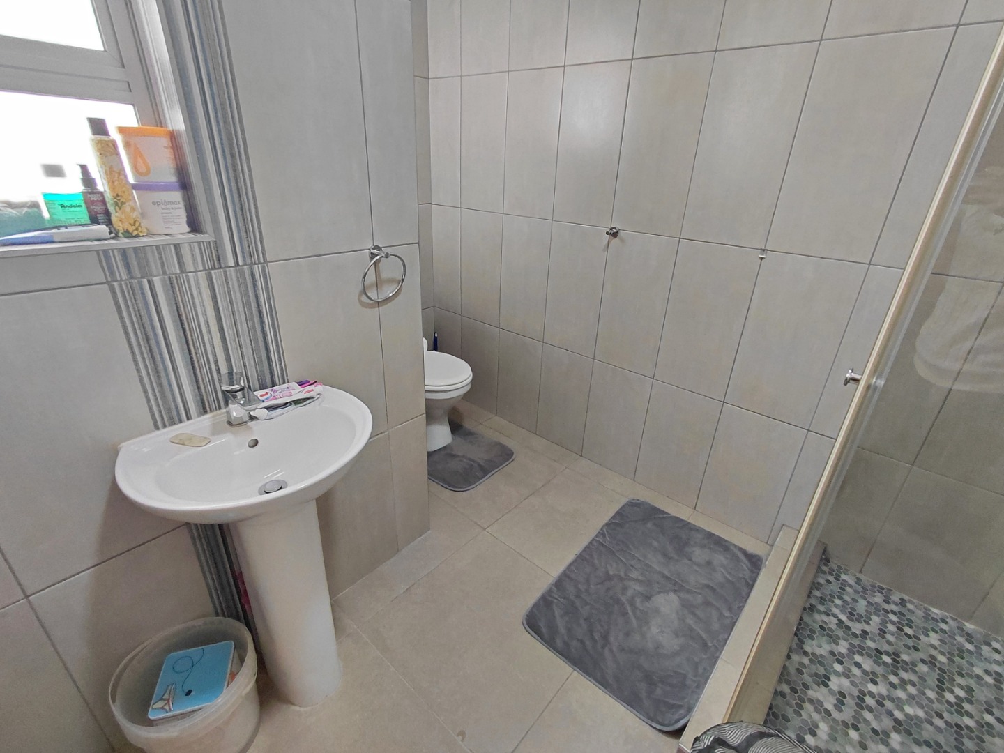 Modern Bathroom with shower, toilet and basin, plus washing connection for added convenience