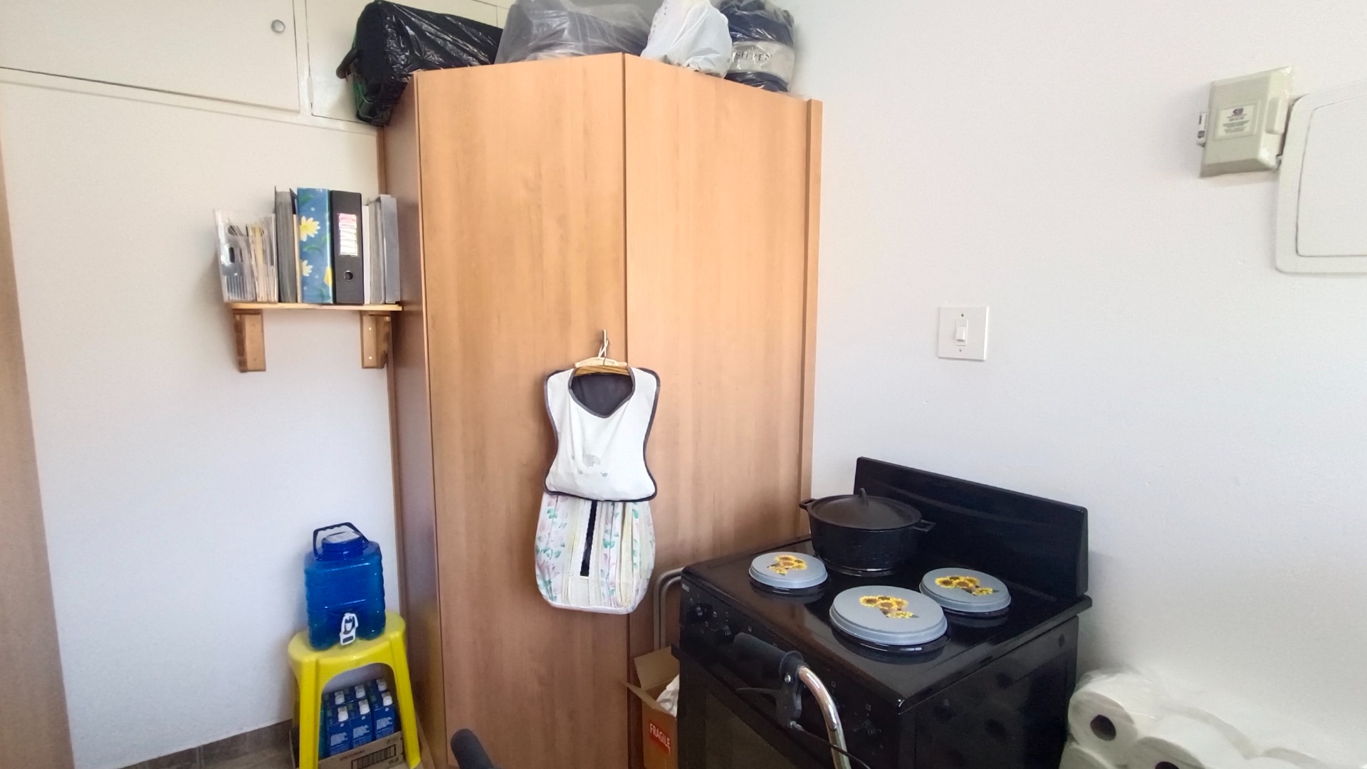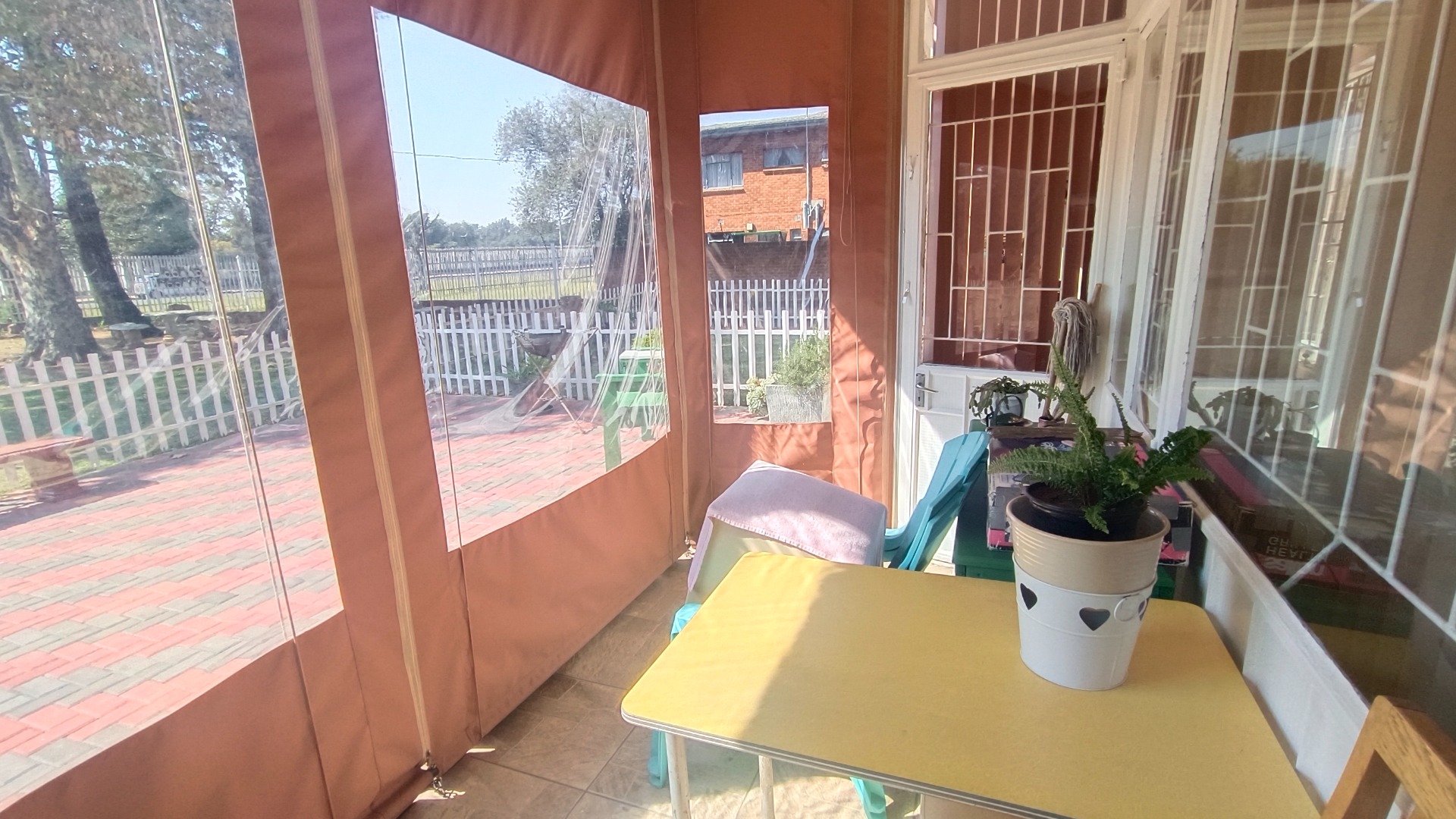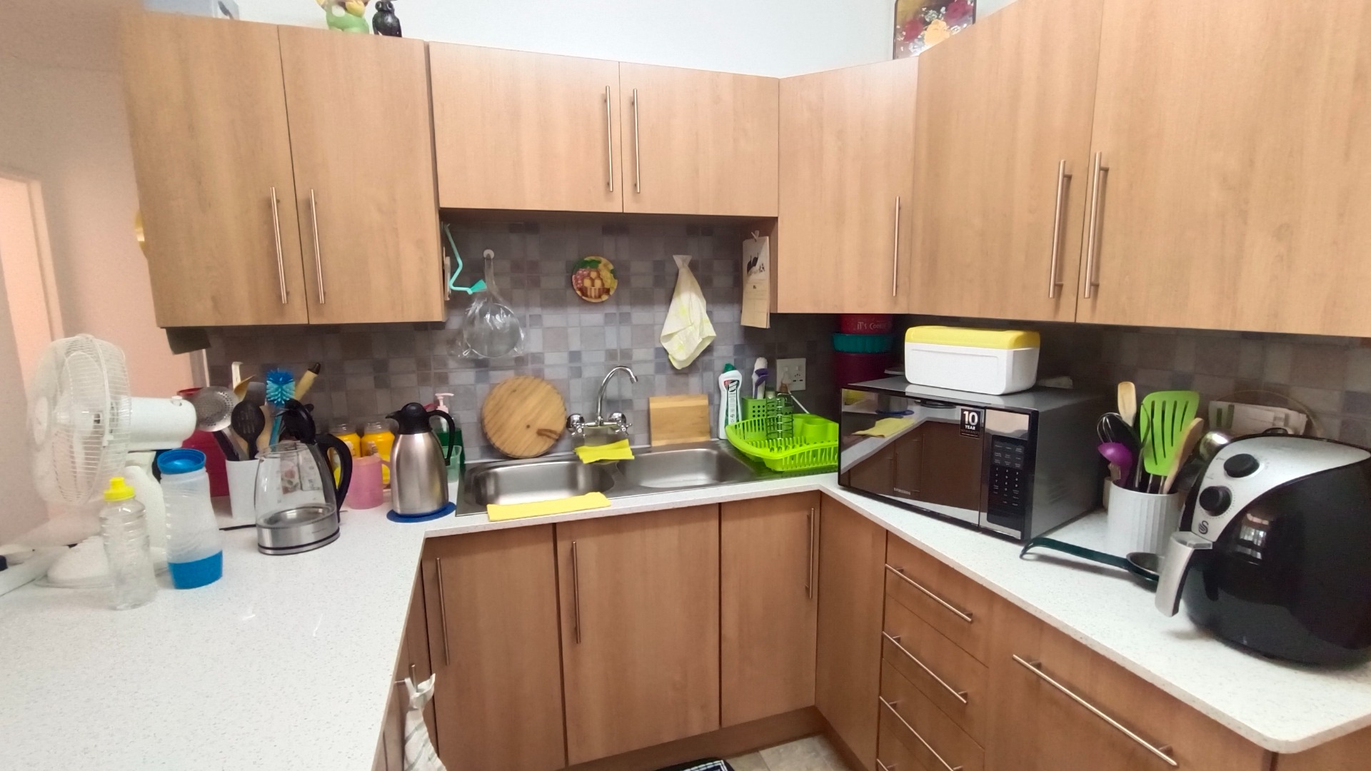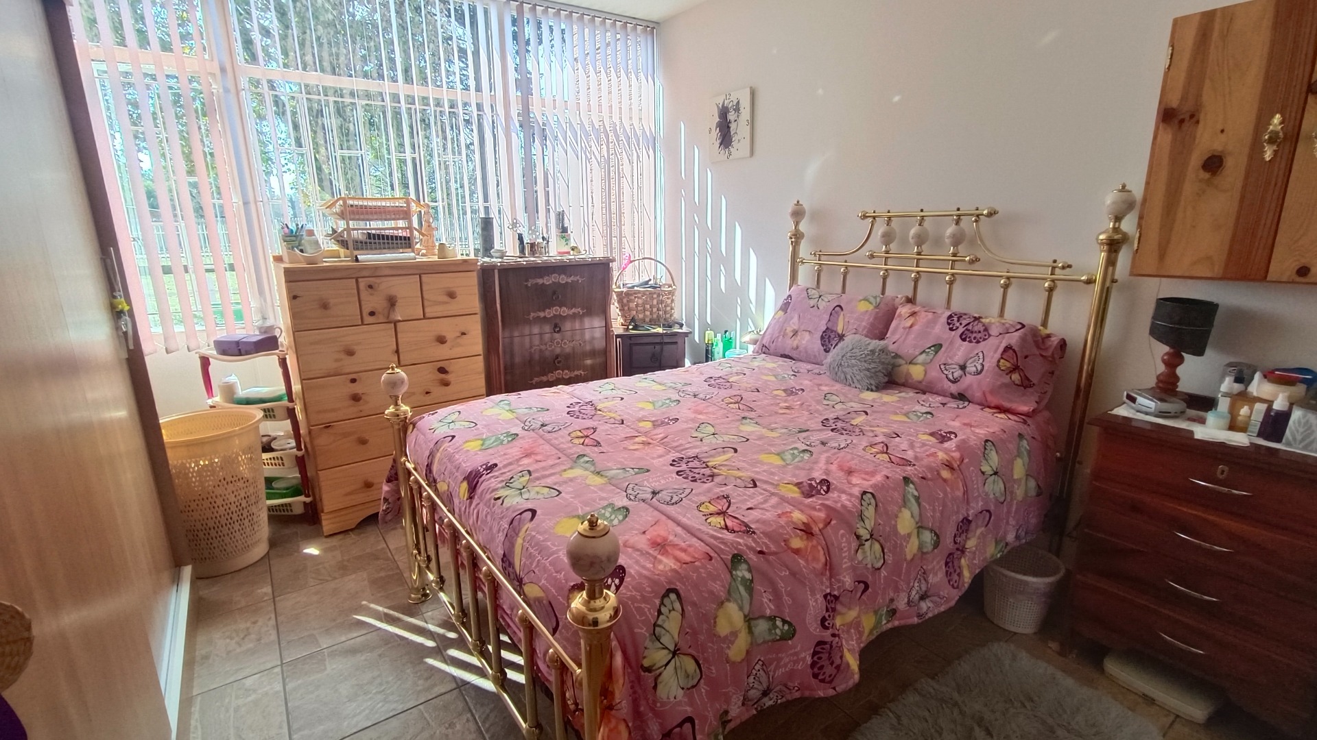 A separate laundry area provides the necessary connections and additional built-in cupboards. From the living room, a door leads to an enclosed stoep and a small private garden area that forms part of the well-maintained communal gardens.
