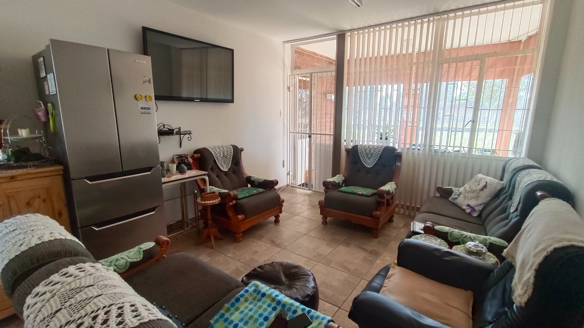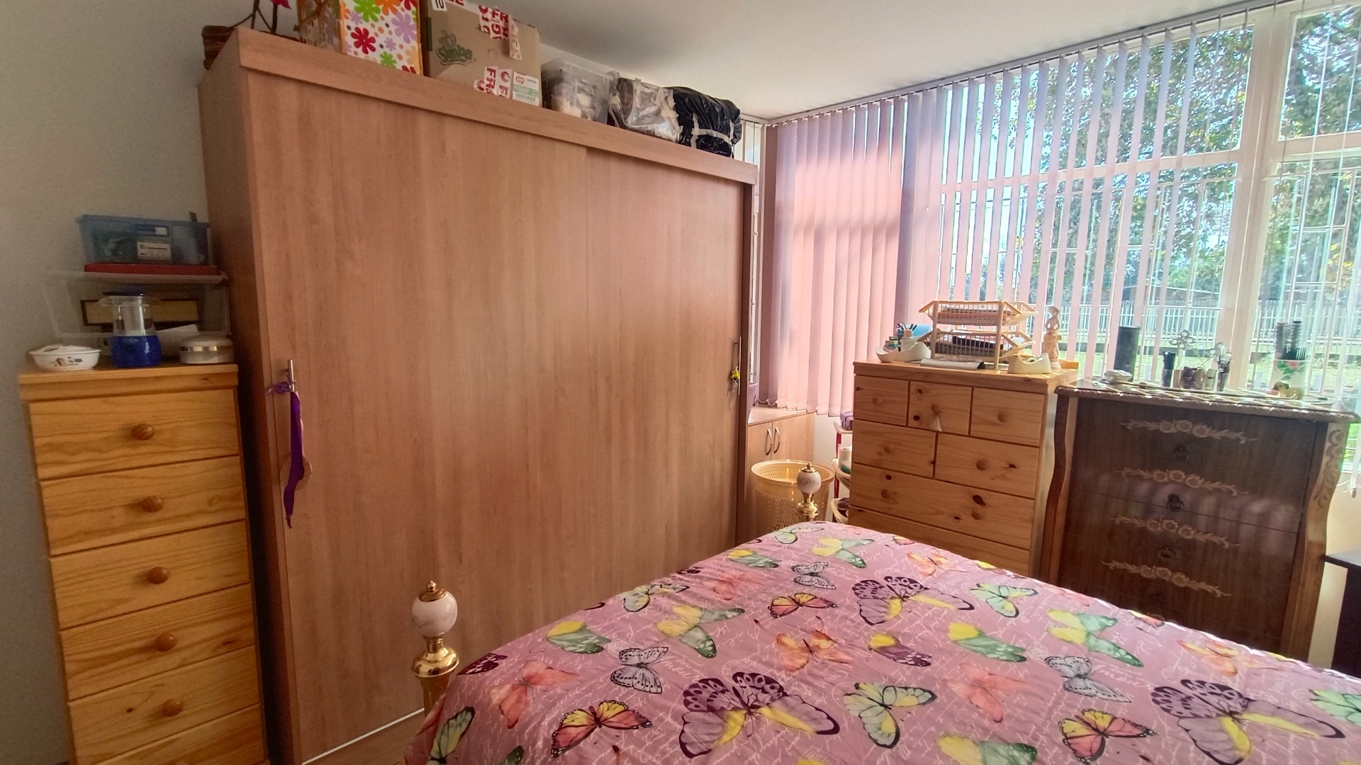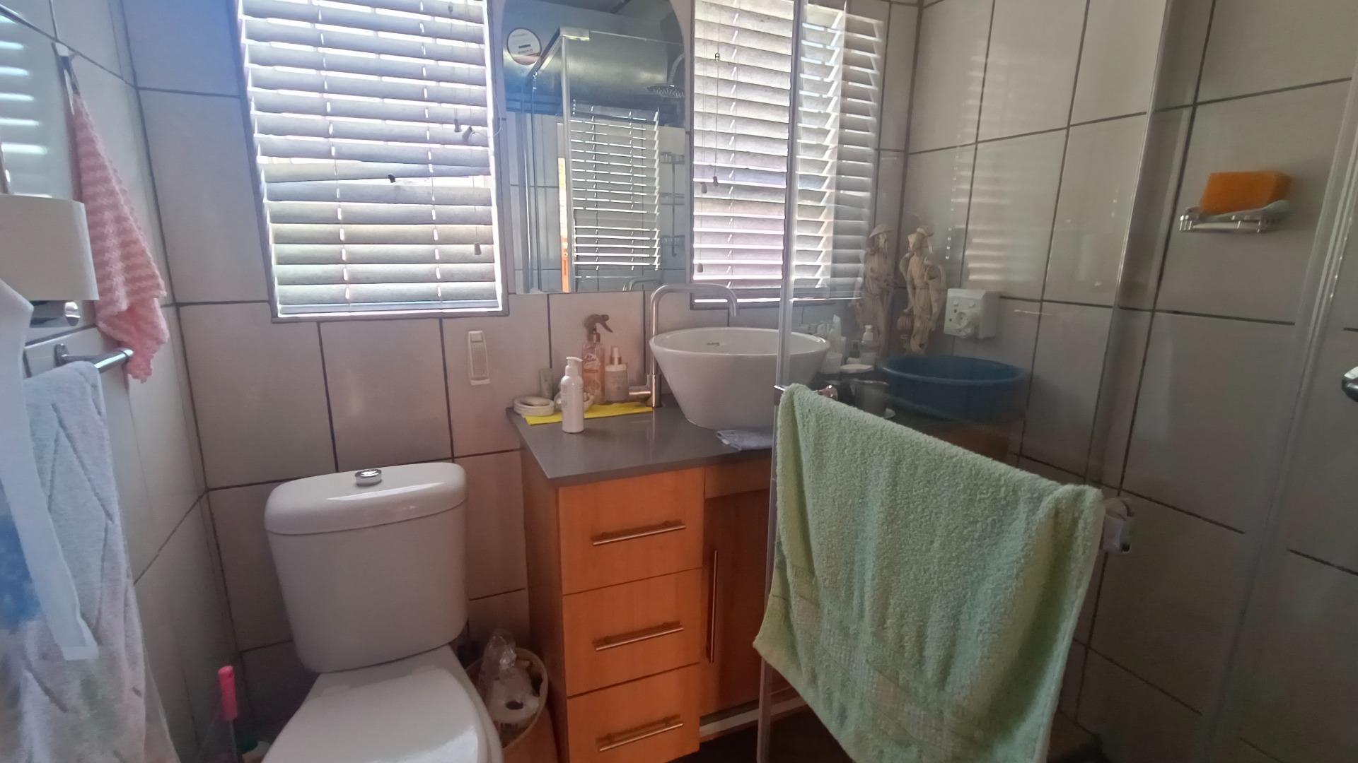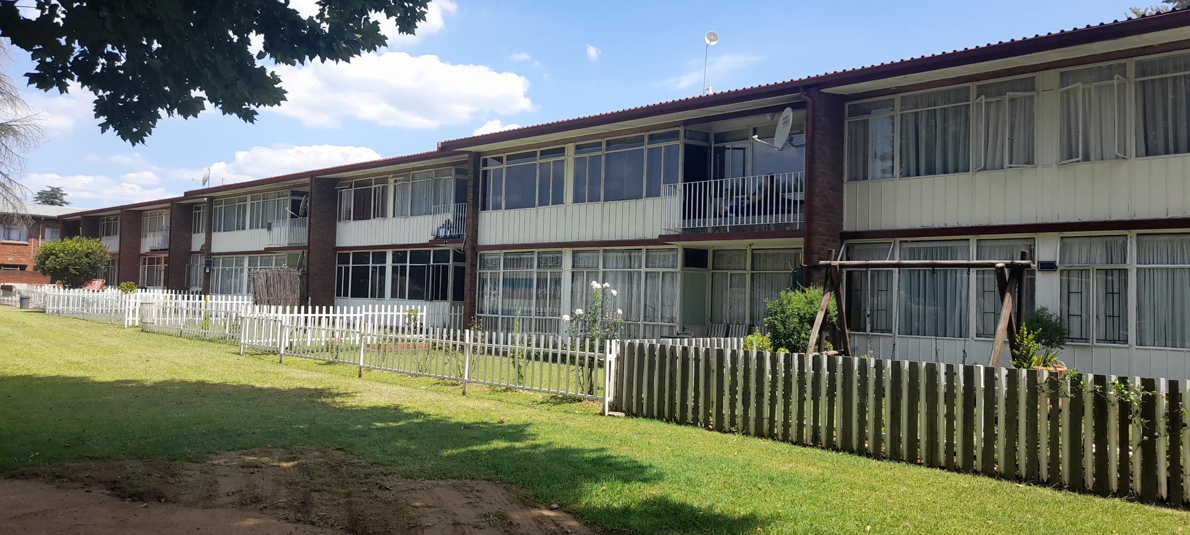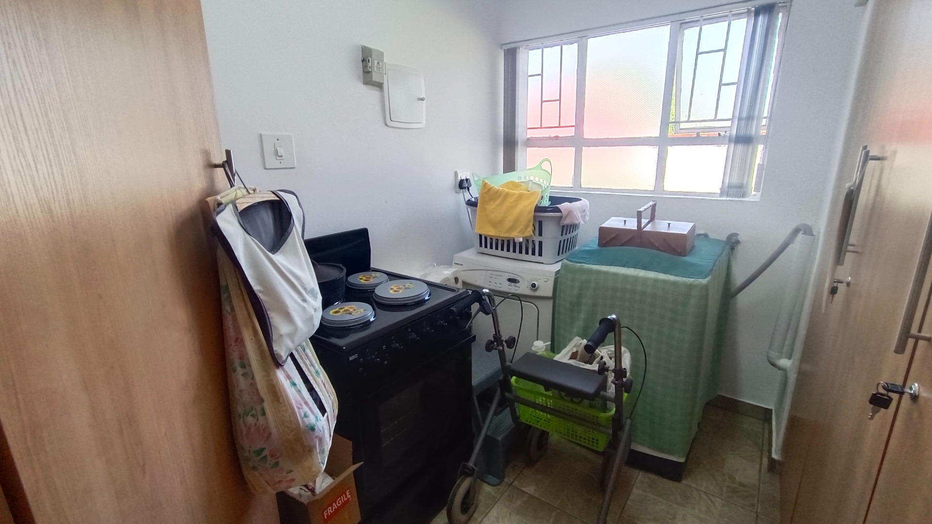 A separate laundry area provides the necessary connections and additional built-in cupboards. From the living room, a door leads to an enclosed stoep and a small private garden area that forms part of the well-maintained communal gardens.