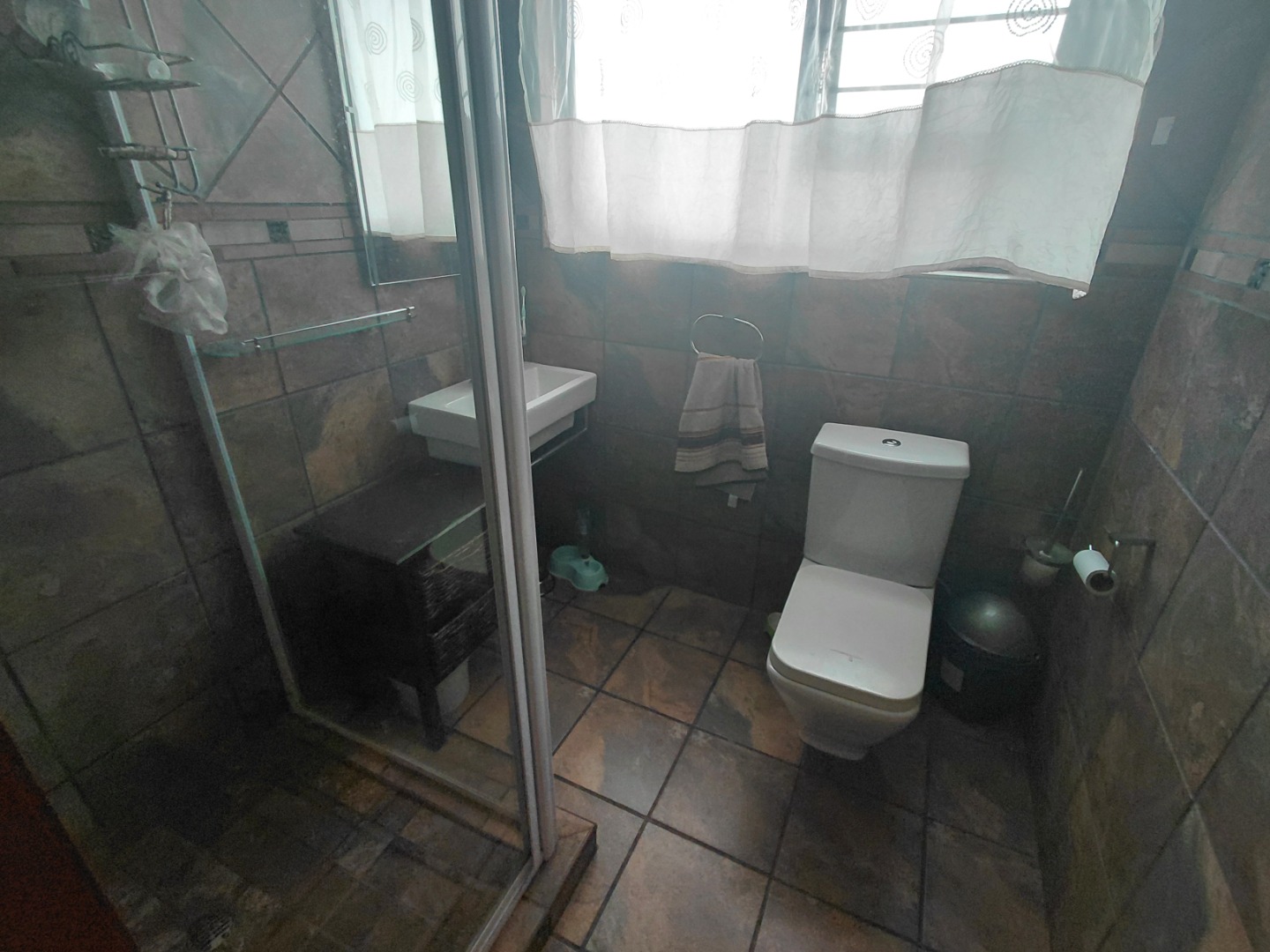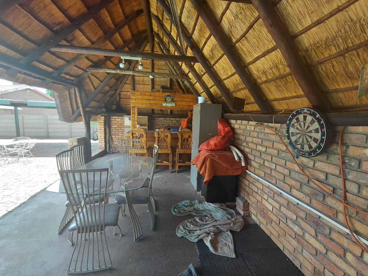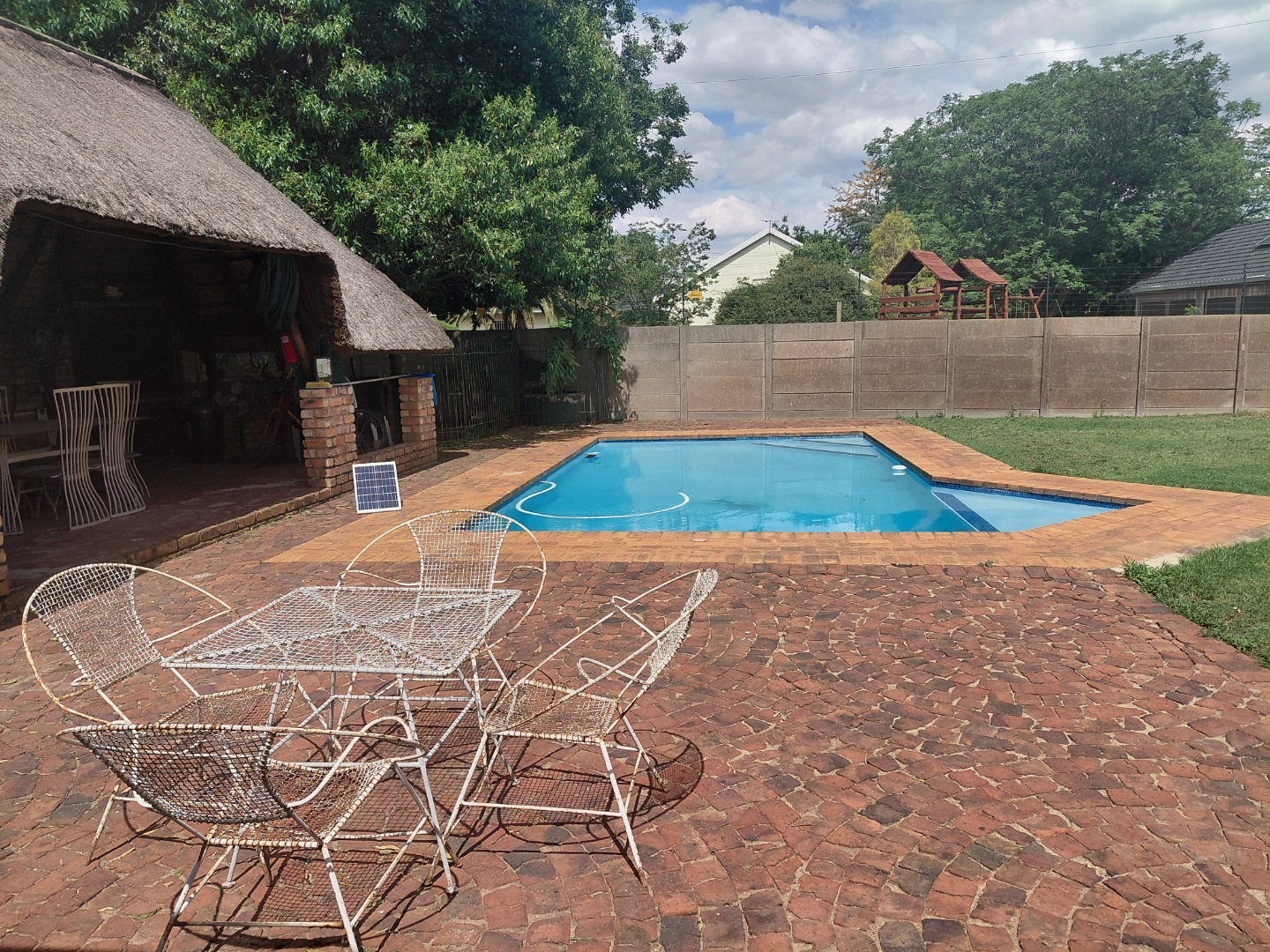 Outside, a private retreat awaits with a sparkling swimming pool, a lapa, and a built-in bar, perfect for entertaining. The expansive garden, complete with paving and a scenic view, offers ample space for relaxation. Two garages and two additional parking bays provide secure vehicle storage, complemented by outside toilets. Security is well-addressed with an access gate, CCTV, burglar bars, and a security gate, ensuring peace of mind.