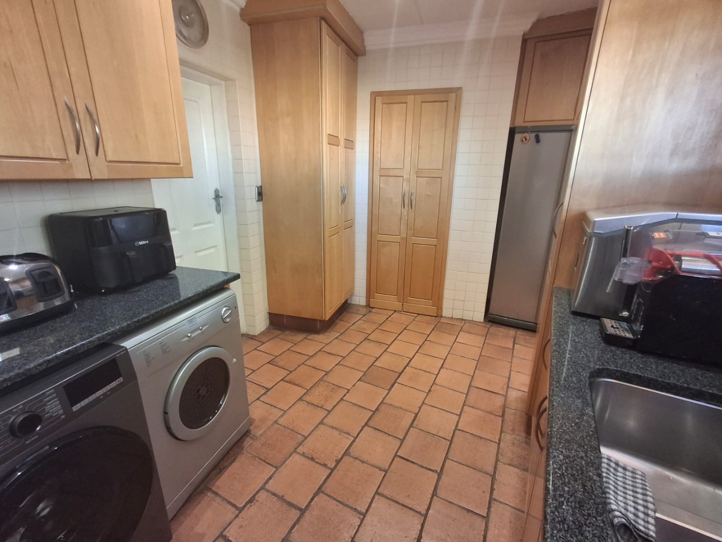 The modern kitchen is fitted with wooden built-in cupboards, granite countertops, an electric stove, eye-level oven, extractor fan, and a separate scullery with additional cupboards, a double sink, and connections for all appliances.