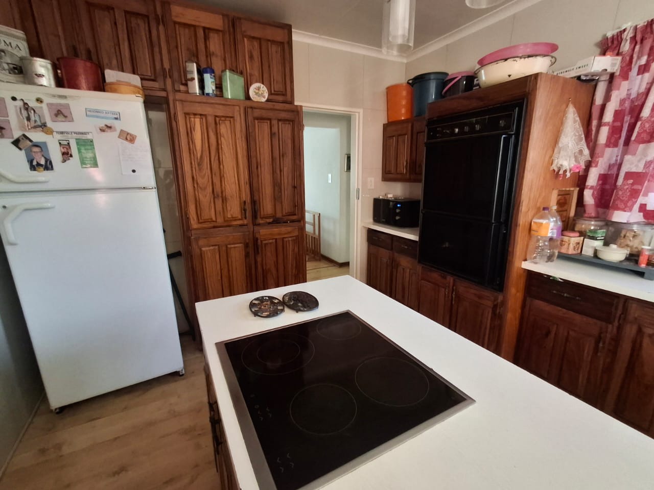 The home welcomes you through a charming front patio into a sunny living room, with a door opening to the private backyard - perfect for entertaining. A separate dining room is conveniently located opposite the kitchen. The spacious kitchen is fitted with ample built-in cupboards, a central island, an electric stove, and a double eye-level oven. A scullery/laundry area provides additional practicality.