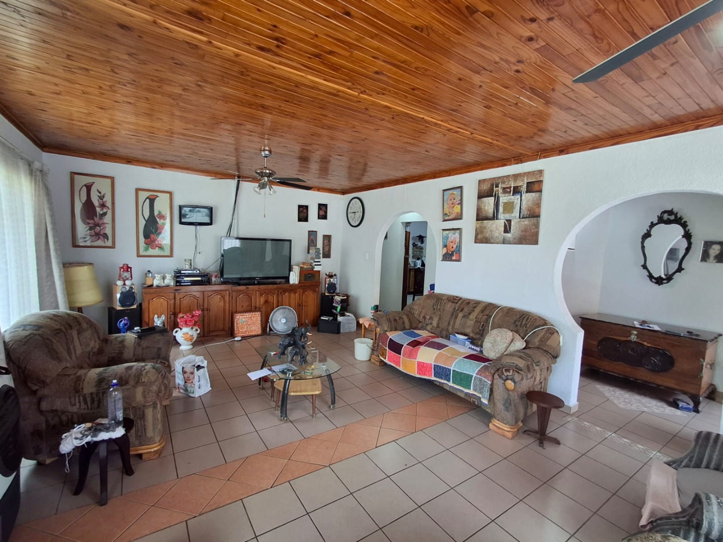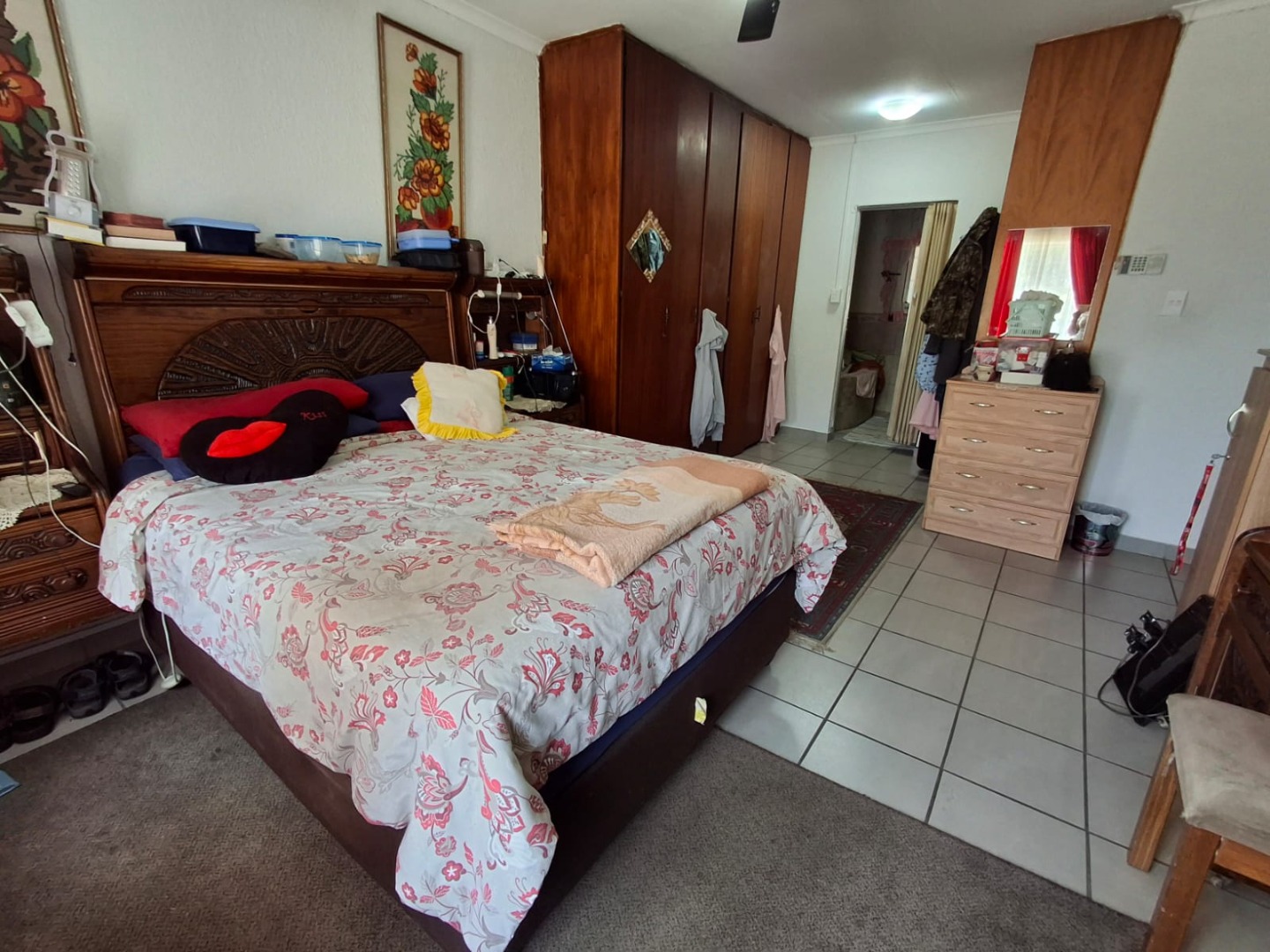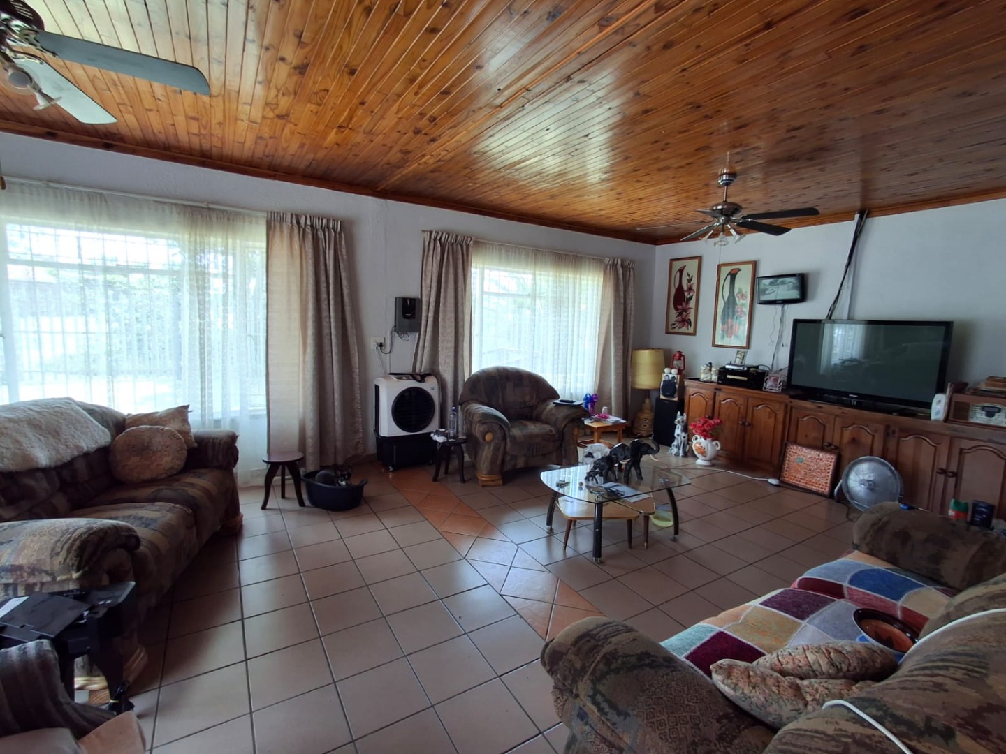 The home offers four well-sized bedrooms, all fitted with built-in cupboards and ceiling fans, as well as two full bathrooms, one of which is en suite to the main bedroom. The house is tiled throughout, ensuring easy maintenance.