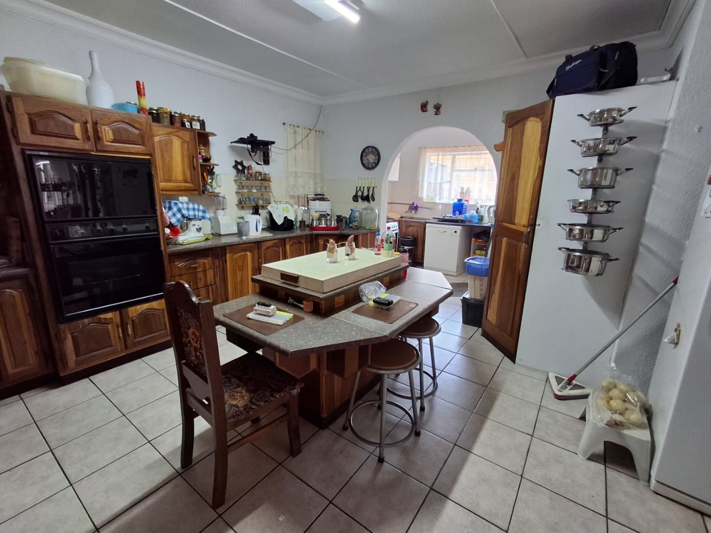 The lovely kitchen features wooden cupboards, a central island, gas stove, eye-level oven, walk-in pantry, and space for a double fridge, complemented by a separate scullery for added convenience.