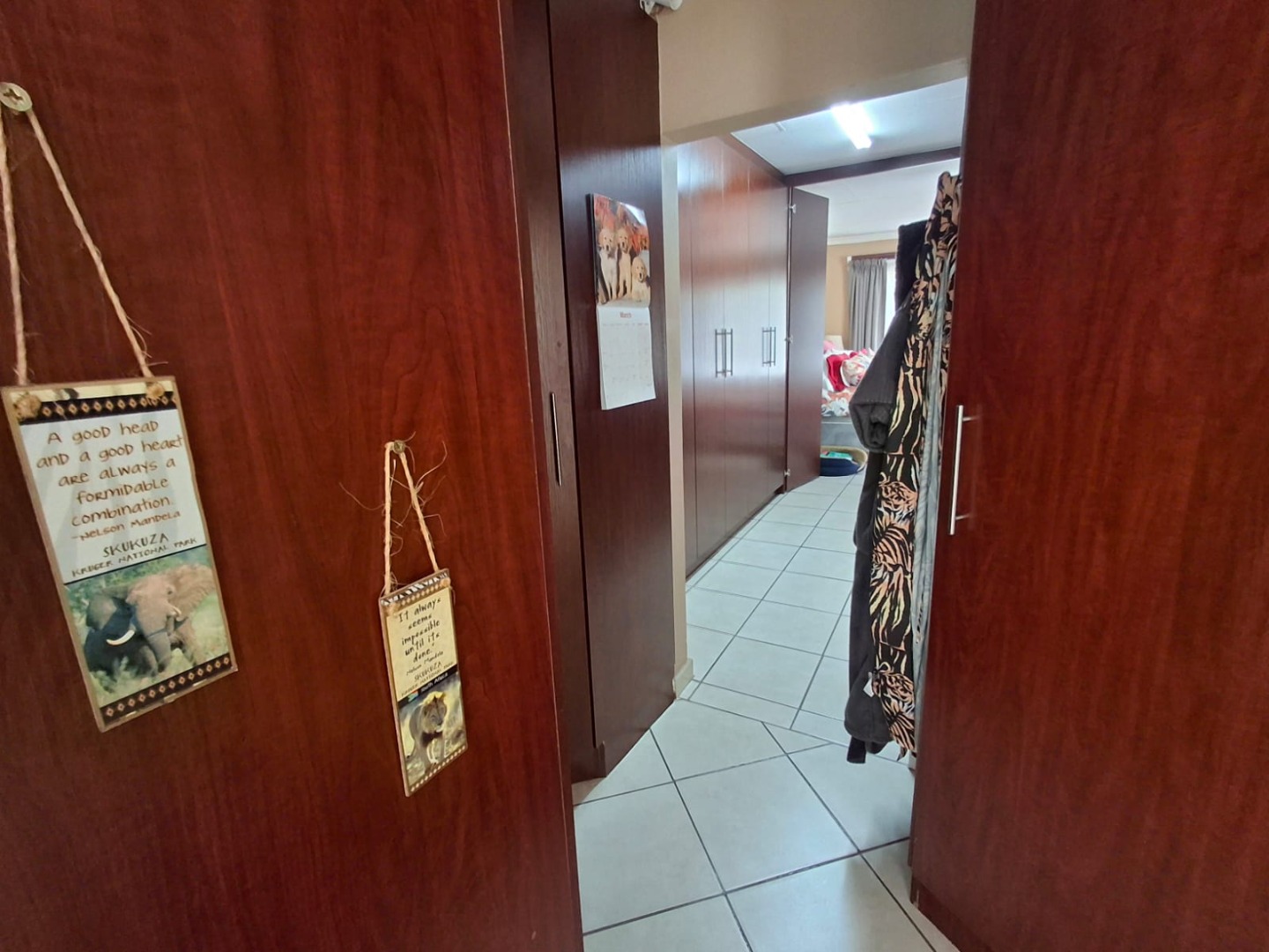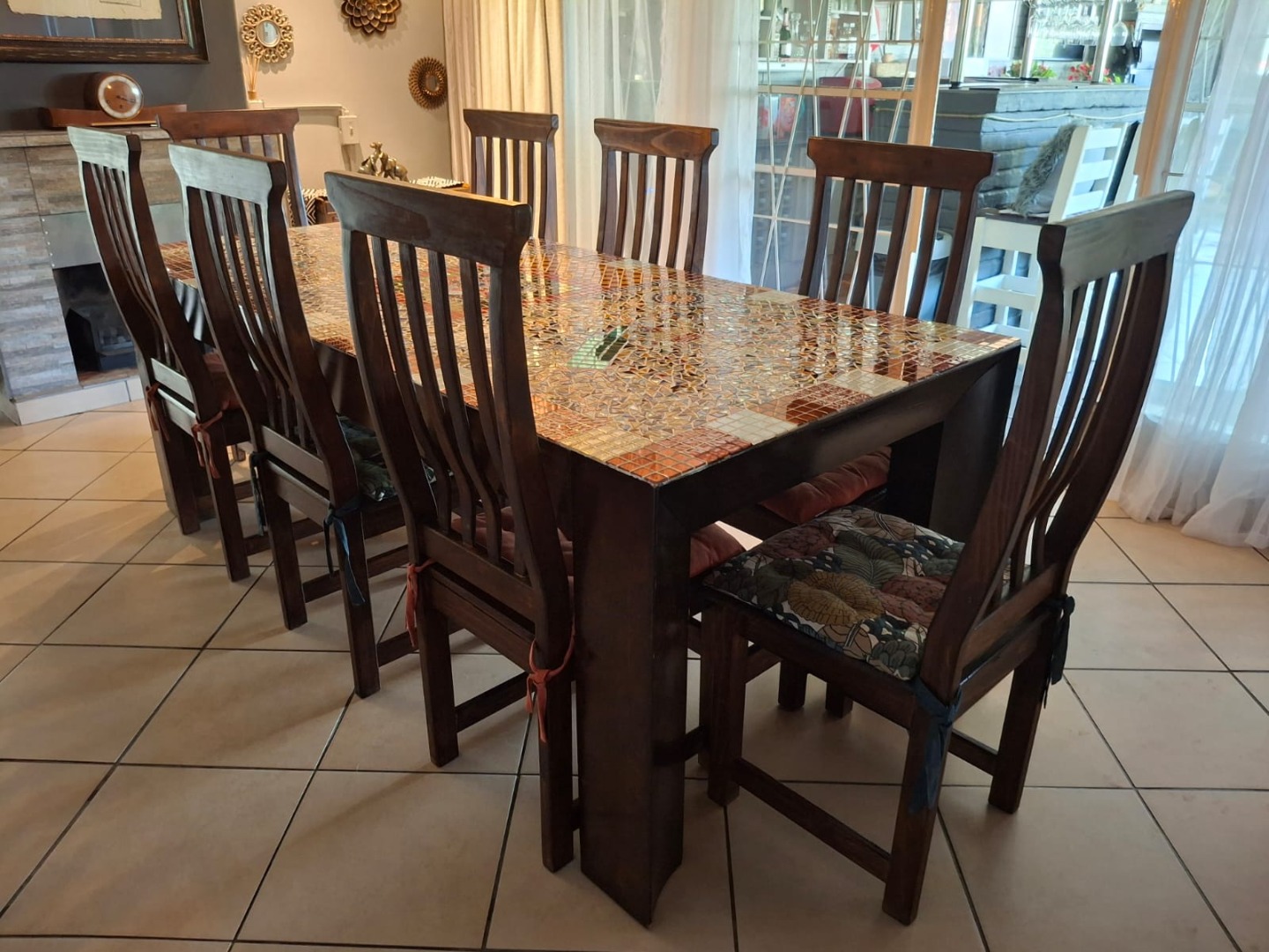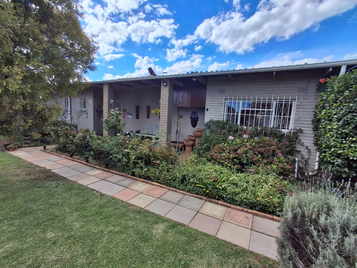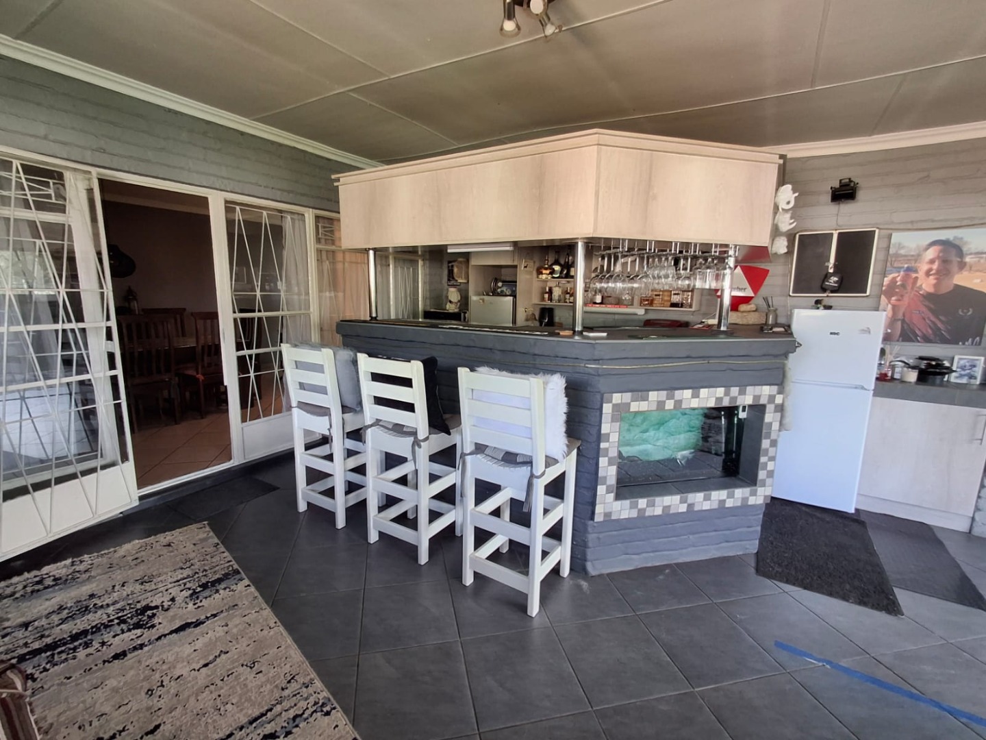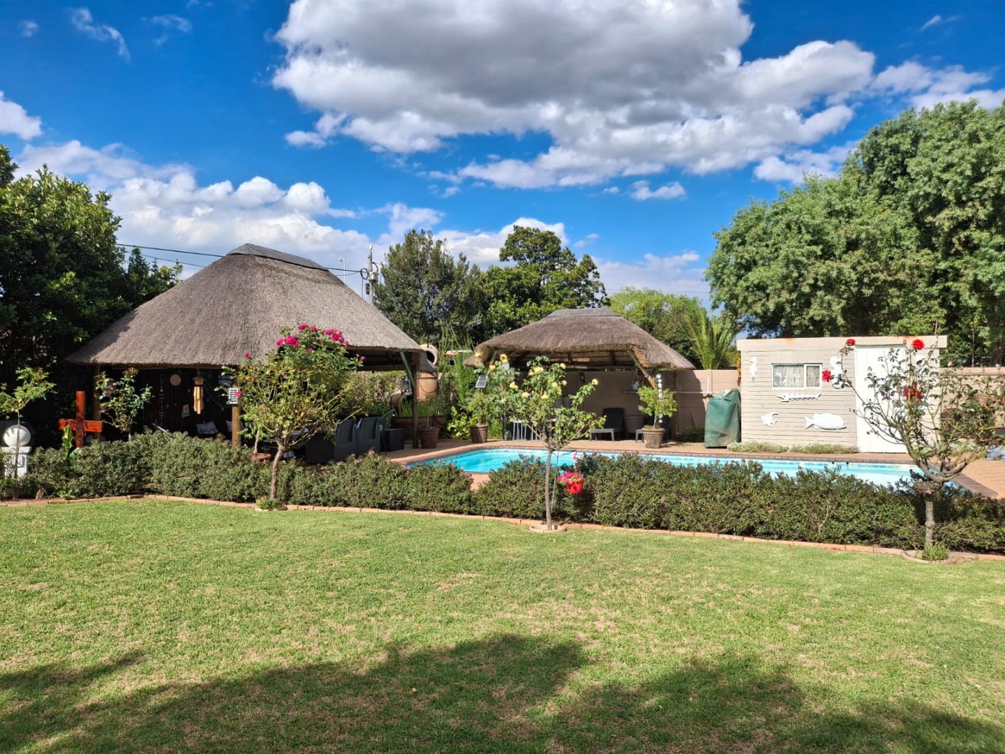 The home features an open-plan dining and entertainment area fitted with a fireplace and air conditioning, creating a warm and inviting atmosphere. For the entertainer, there is a covered entertainment room with a built-in braai and bar, overlooking the sparkling swimming pool and beautiful garden. Two lapas next to the pool provide additional space for relaxing or hosting guests.