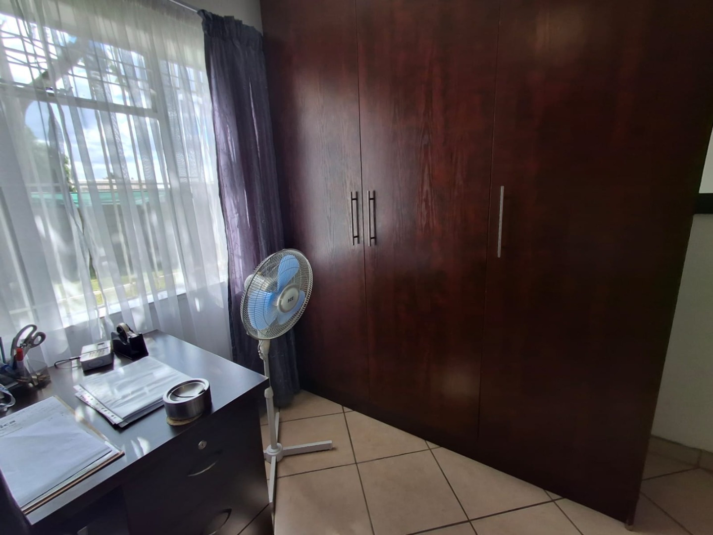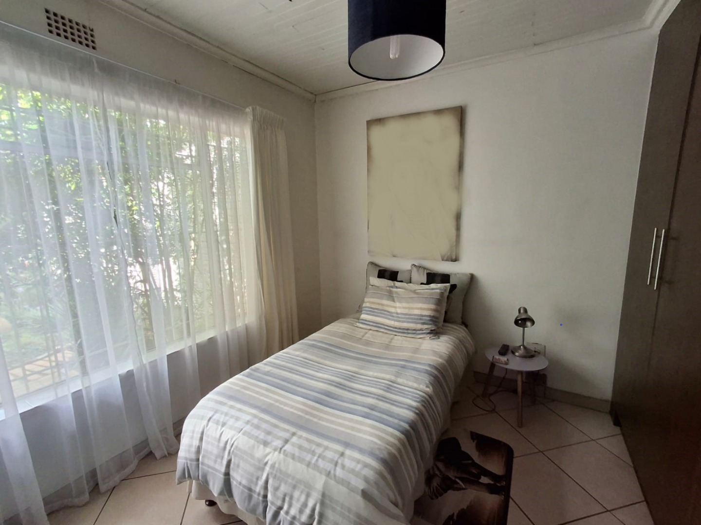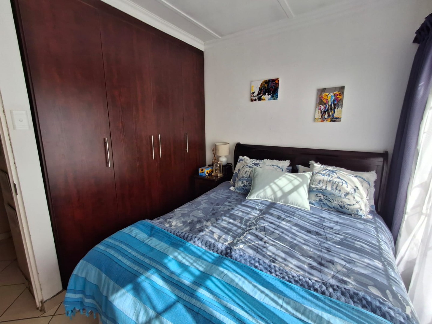 The property offers four well-sized bedrooms and two bathrooms, of which one is en-suite to the main bedroom. The main bedroom is fitted with air conditioning and features a walk-through closet leading to a full en-suite bathroom with a corner bath, shower, basin, and toilet. The home is neatly tiled throughout.