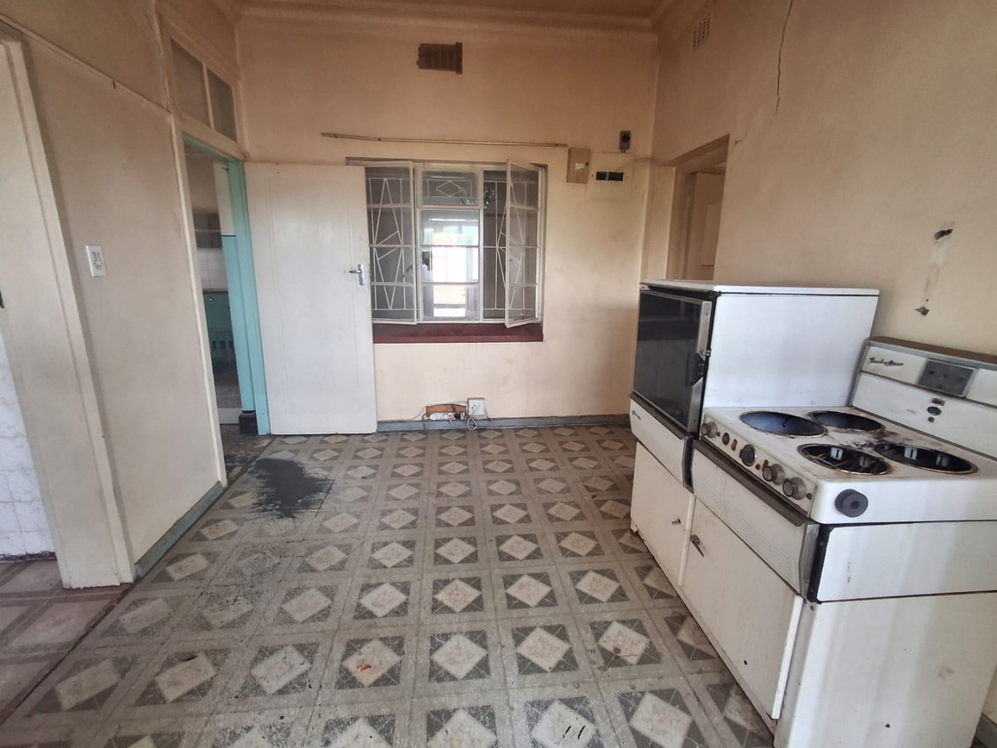 The kitchen is fitted with built-in cupboards, a central island, and a double sink, offering a solid foundation for future upgrades.