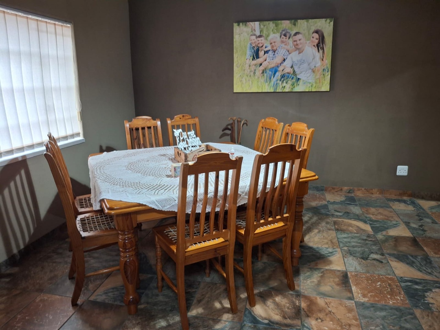 The modern kitchen boasts a central island, granite tops, ample cupboards, an electric stove with extractor fan, space for a double fridge, and a dishwasher connection. A separate laundry provides additional convenience. The dining room is open plan to the kitchen, creating a warm and inviting flow.