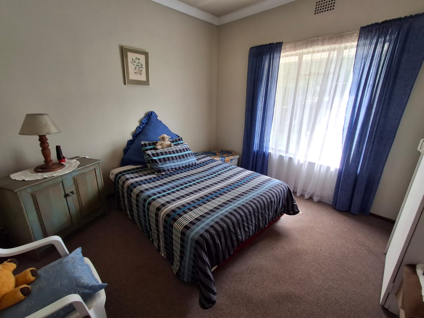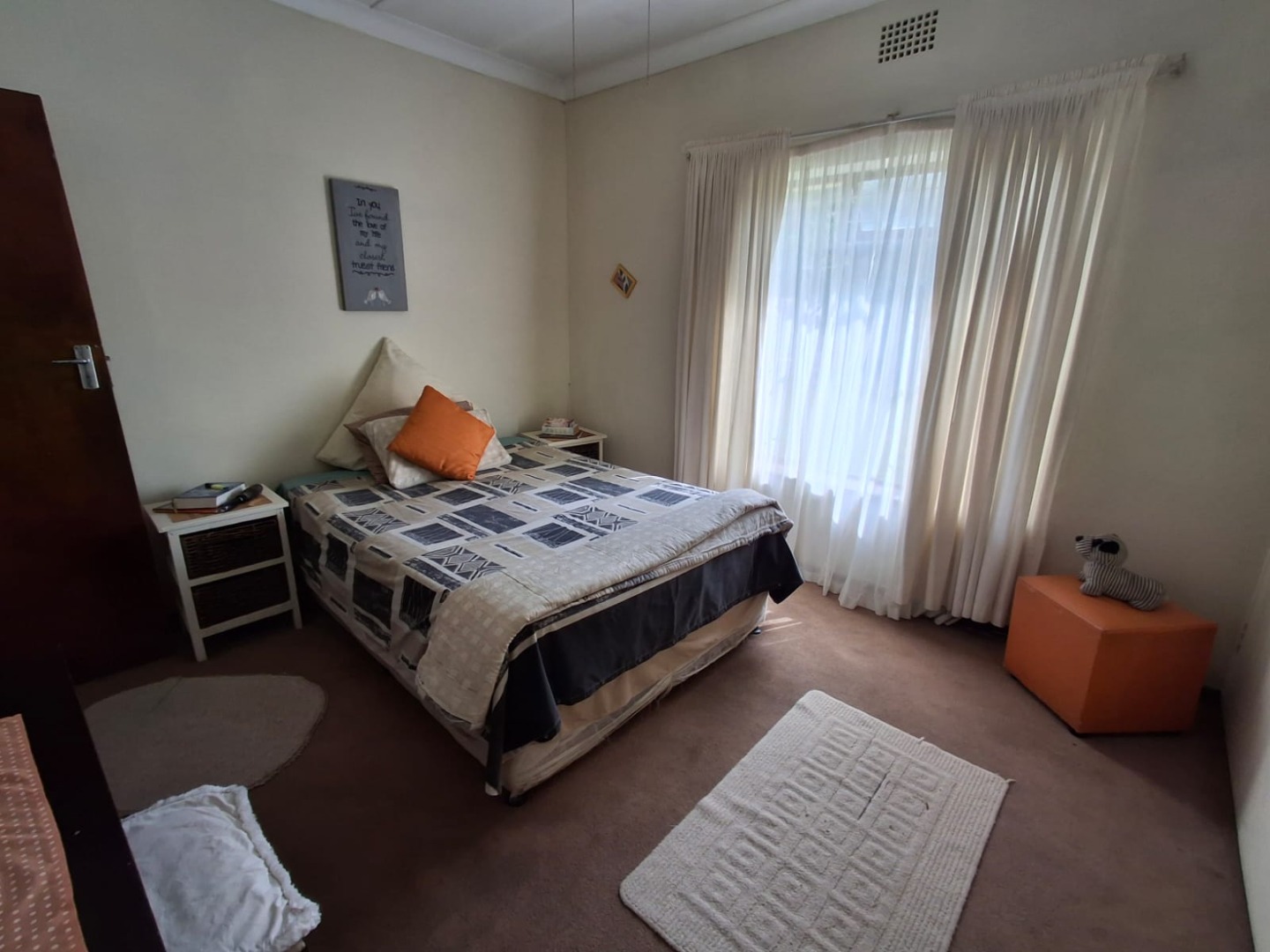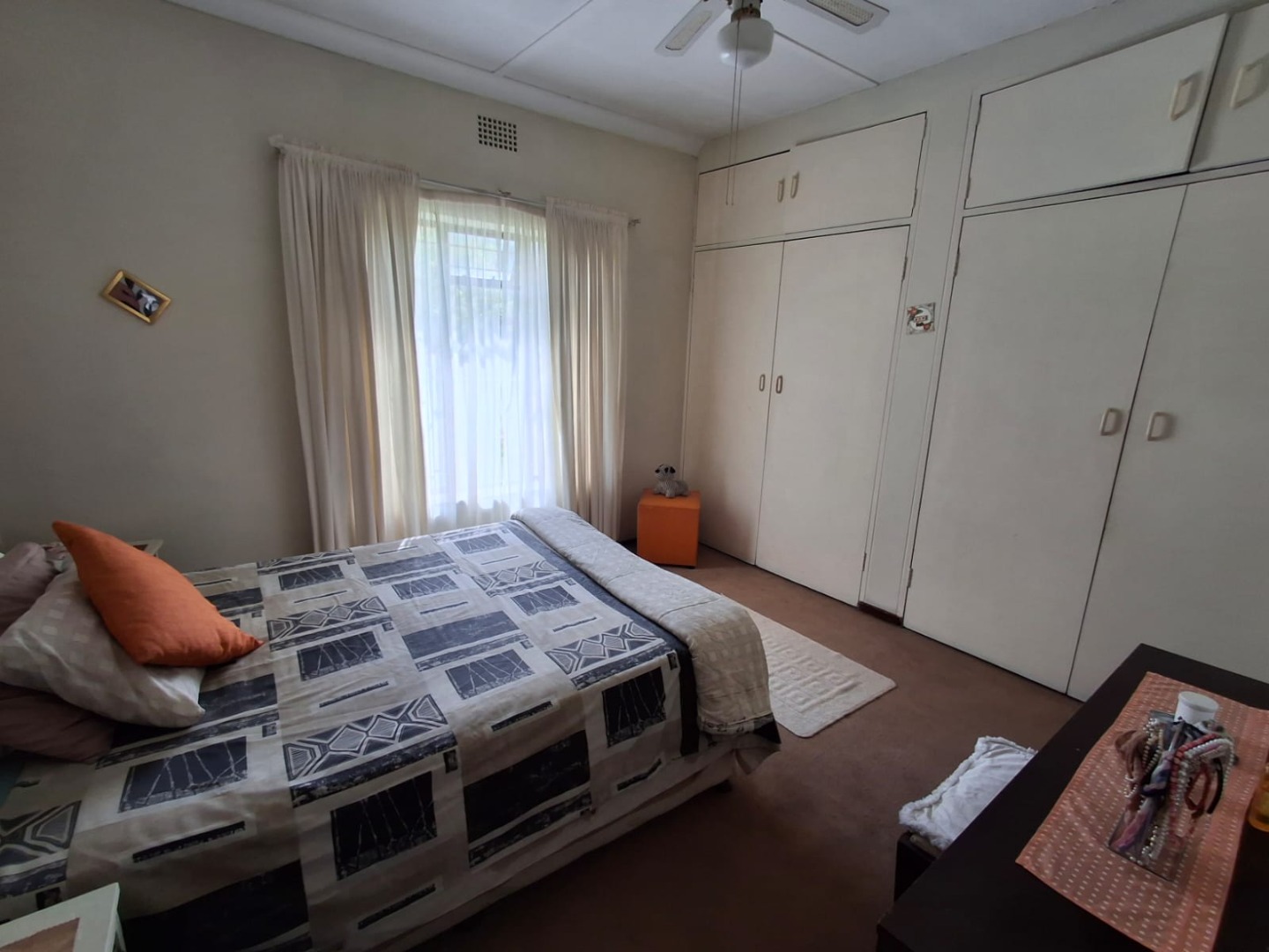 The home offers three well-sized, carpeted bedrooms, all with built-in cupboards. The carpets are in very good condition. A full bathroom services the home, featuring a bath with shower overhead.