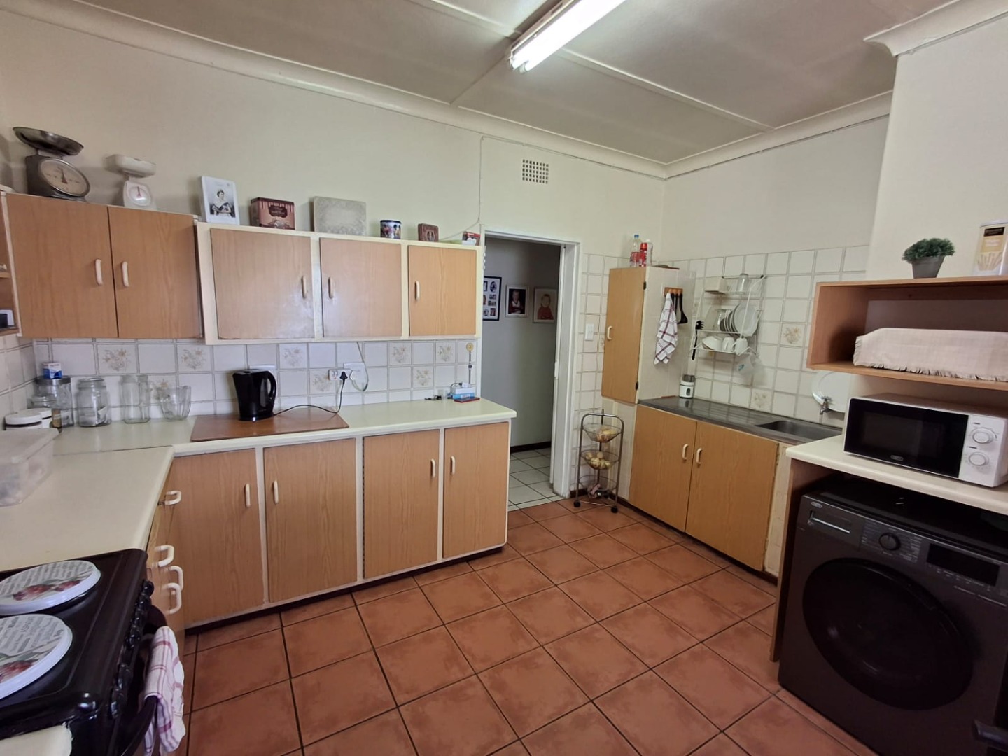 The kitchen is fitted with built-in cupboards, a breakfast nook, an electric stove, and plumbing for a washing machine. Adjacent to the kitchen is a versatile study that can also be used as a dining room or an additional bedroom.