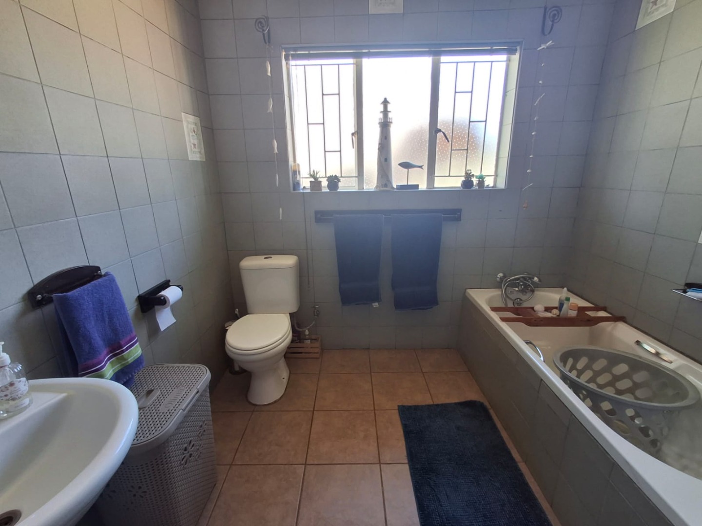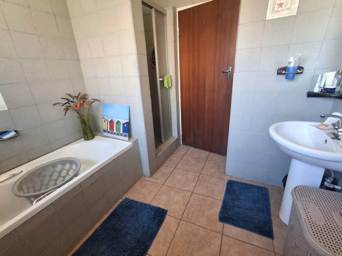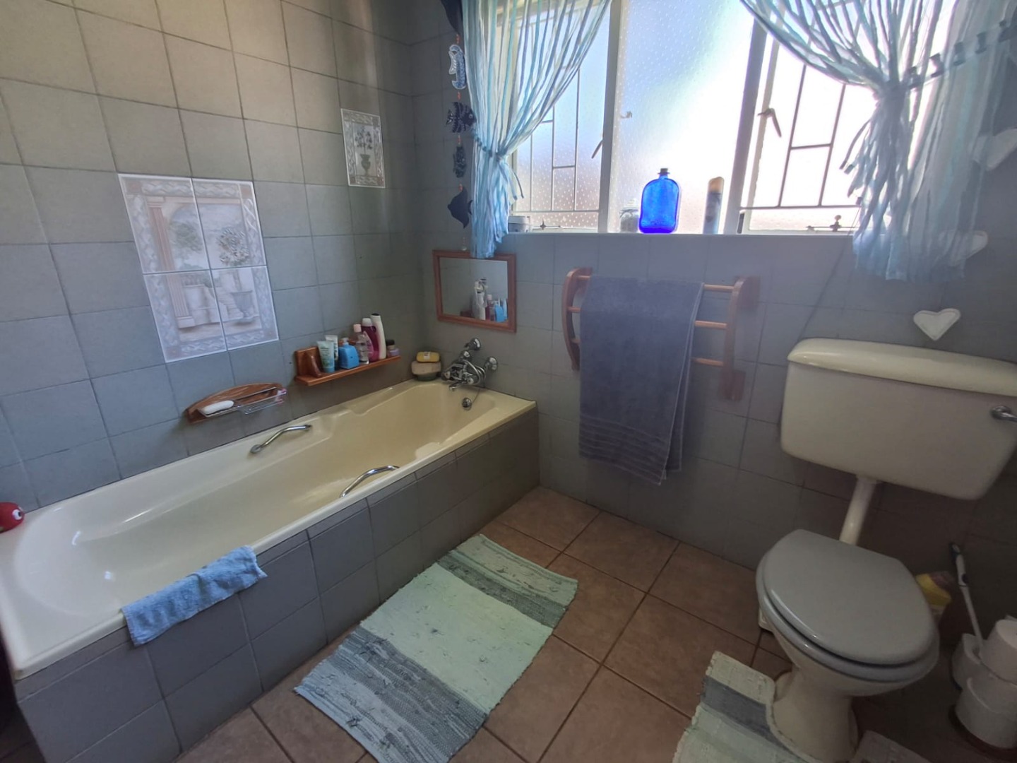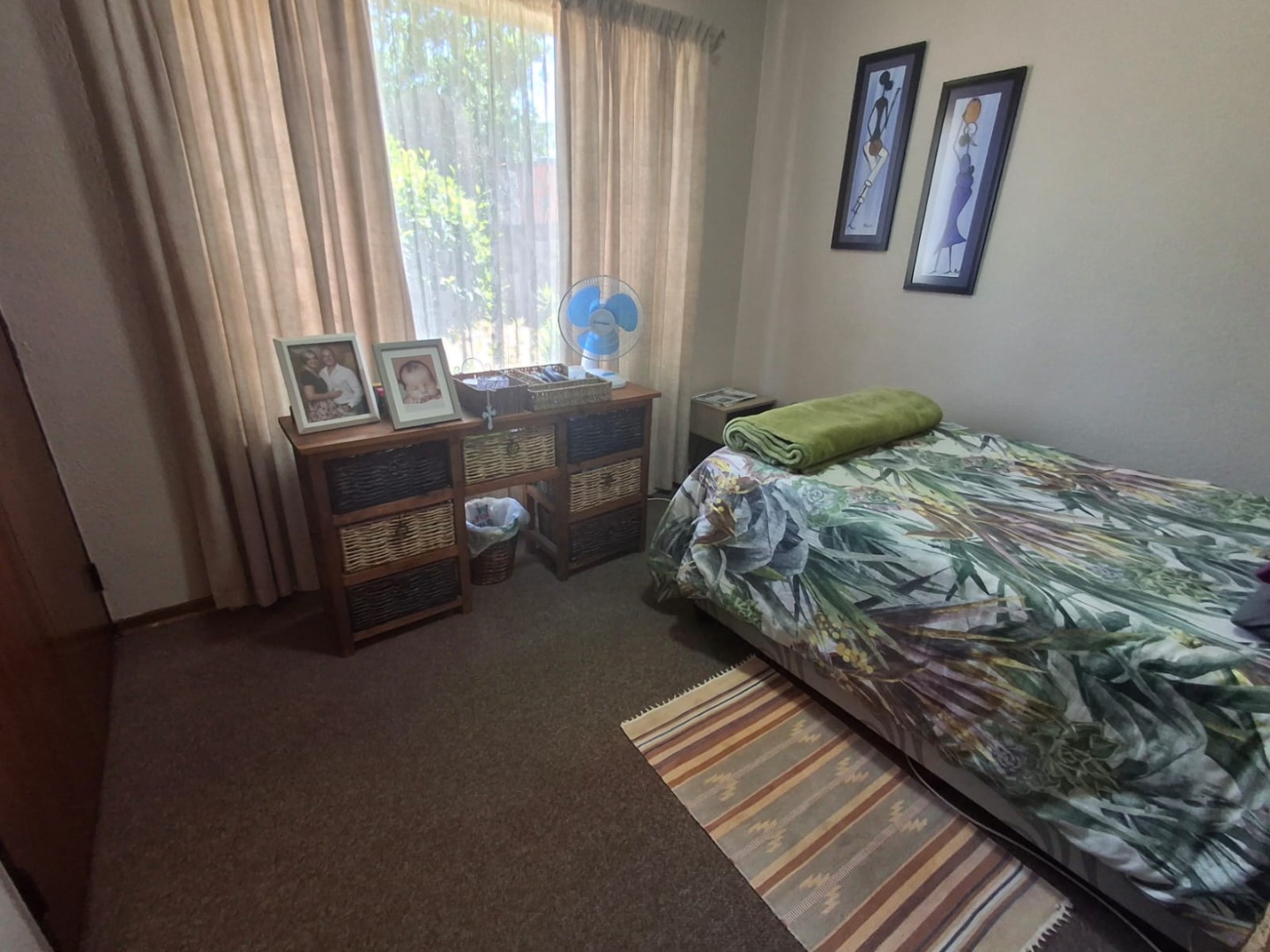 There are three well-sized bedrooms with built-in cupboards and two bathrooms, one of which is en suite to the main bedroom. The guest bathroom is a full bathroom. The home is tiled throughout, with well-maintained carpets in the bedrooms adding a touch of comfort.