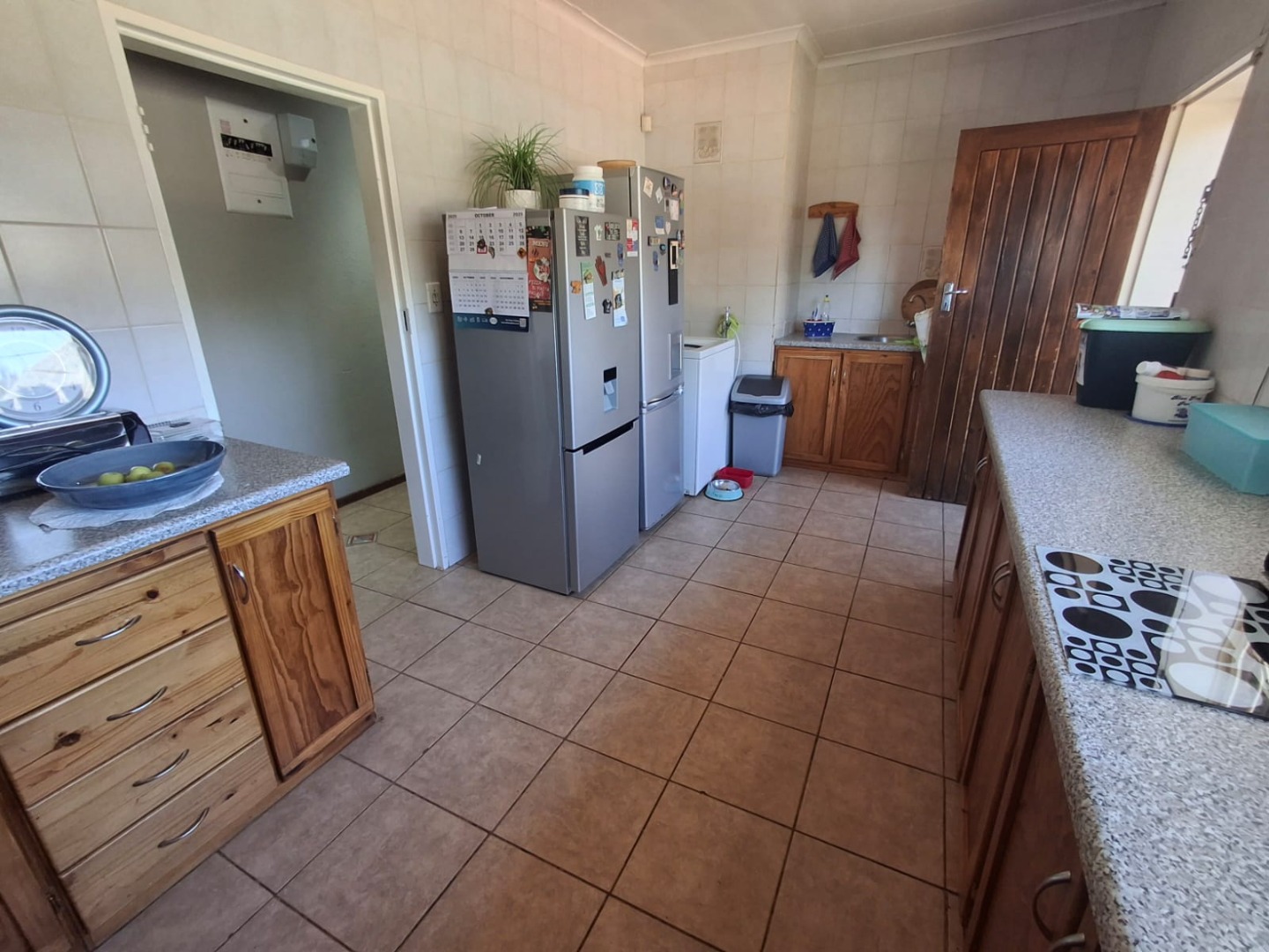 Inside, the home offers a welcoming open-plan living and dining area, leading to a spacious kitchen fitted with wooden cupboards, an electric stove, double sink, space for a double-door fridge, and connections for appliances.