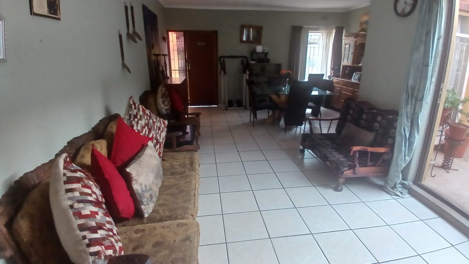 front door. The living/dining room is modernly tiled and open plan with a stacker door leading out onto a covered