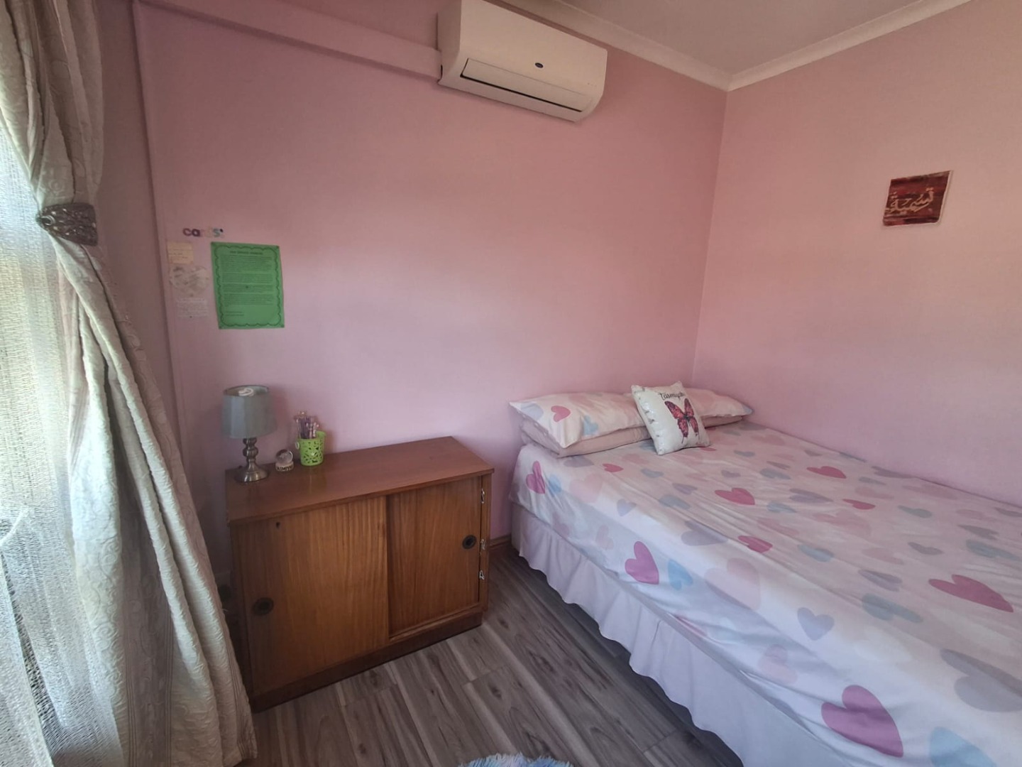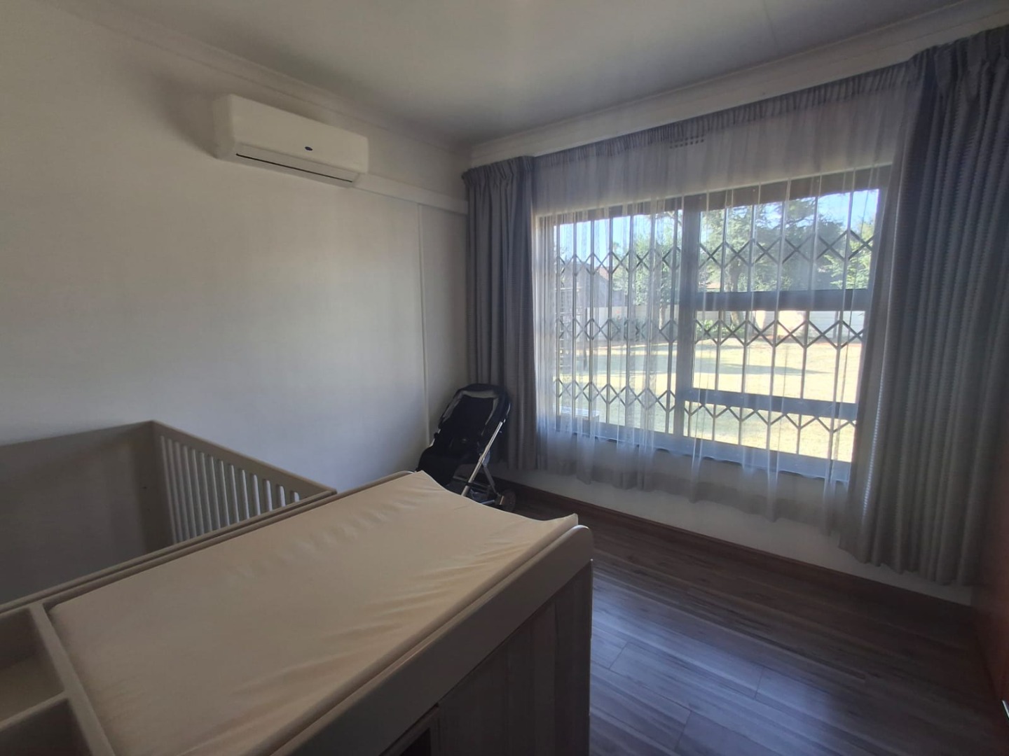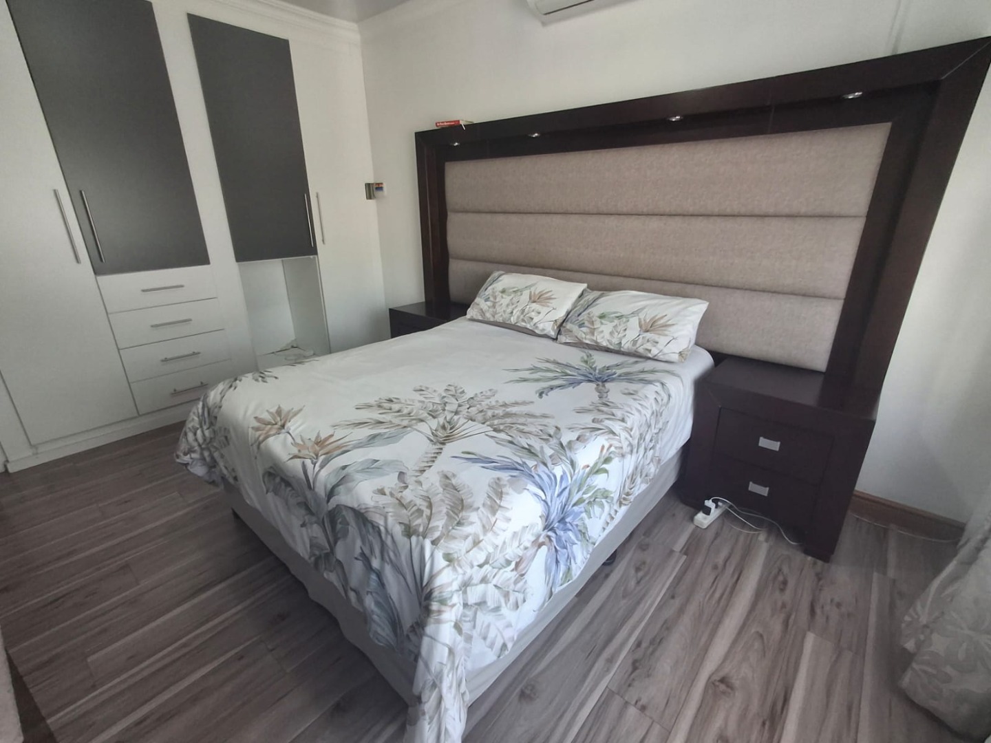 There are three well-sized bedrooms, all fitted with air conditioning, built-in cupboards, and laminated flooring.