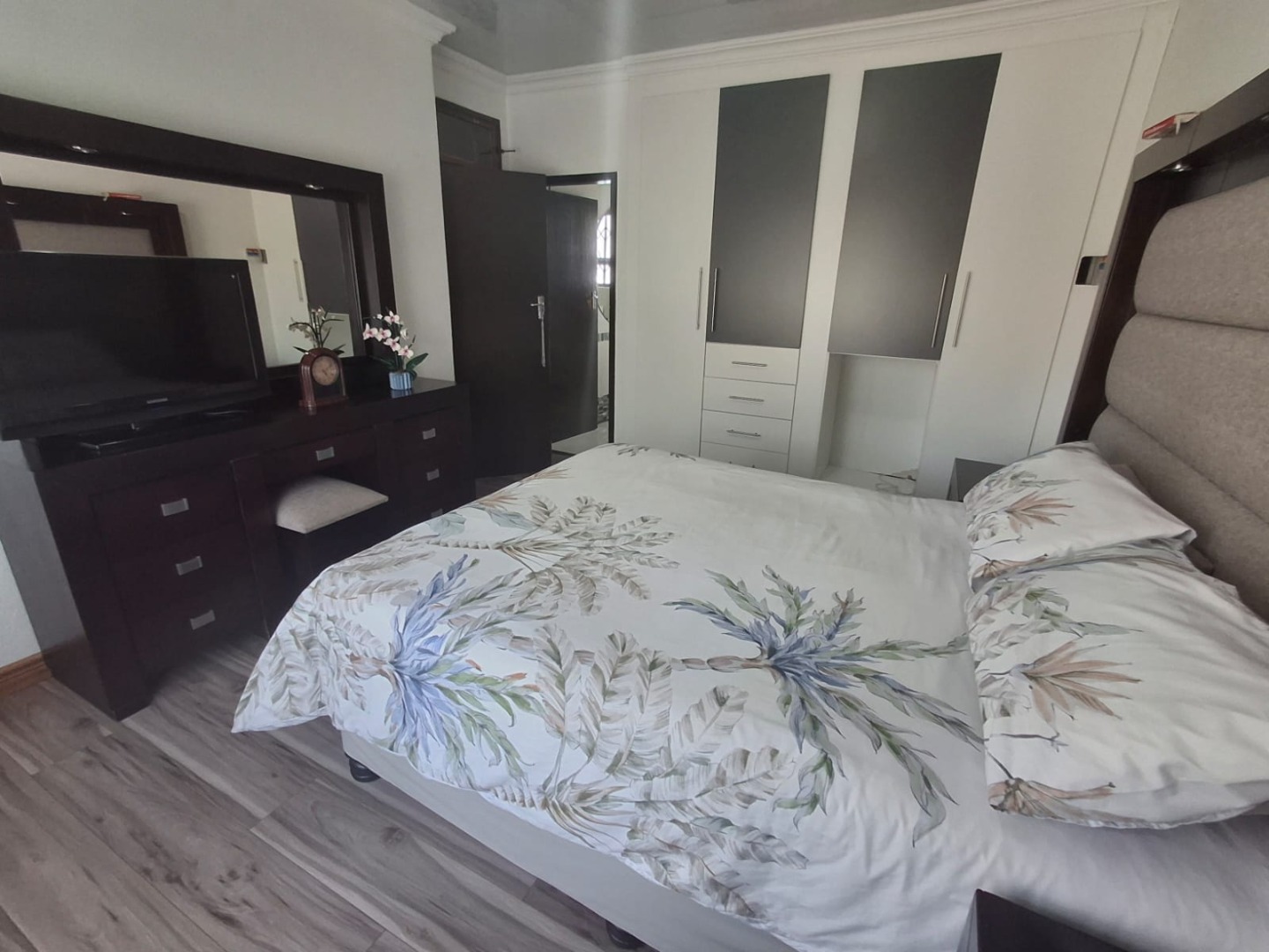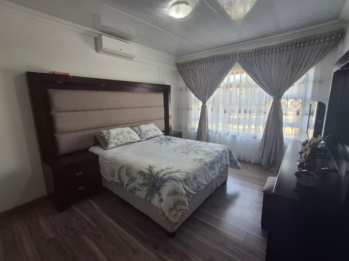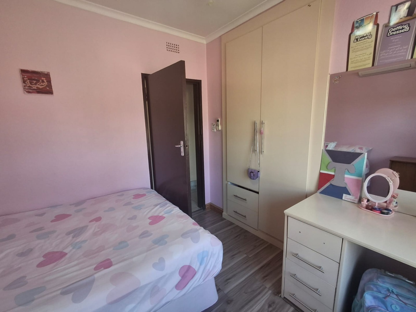 There are three well-sized bedrooms, all fitted with air conditioning, built-in cupboards, and laminated flooring.