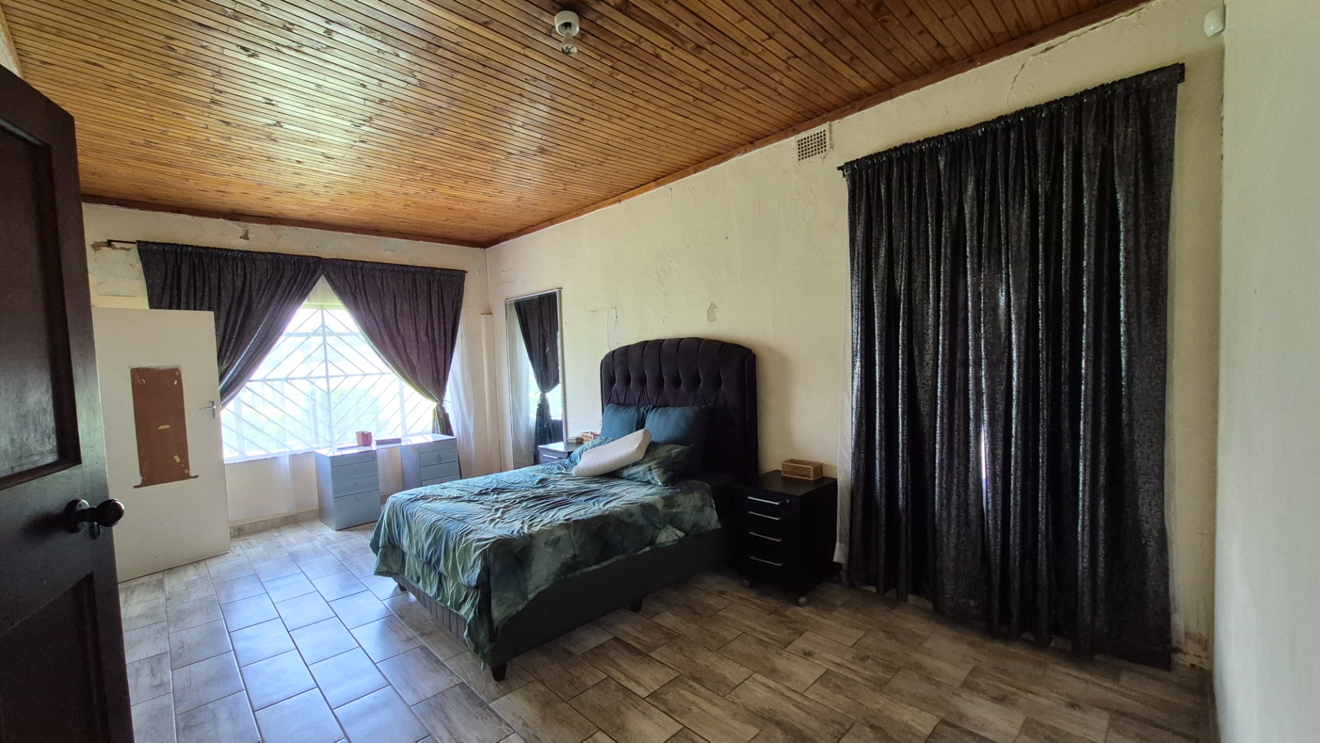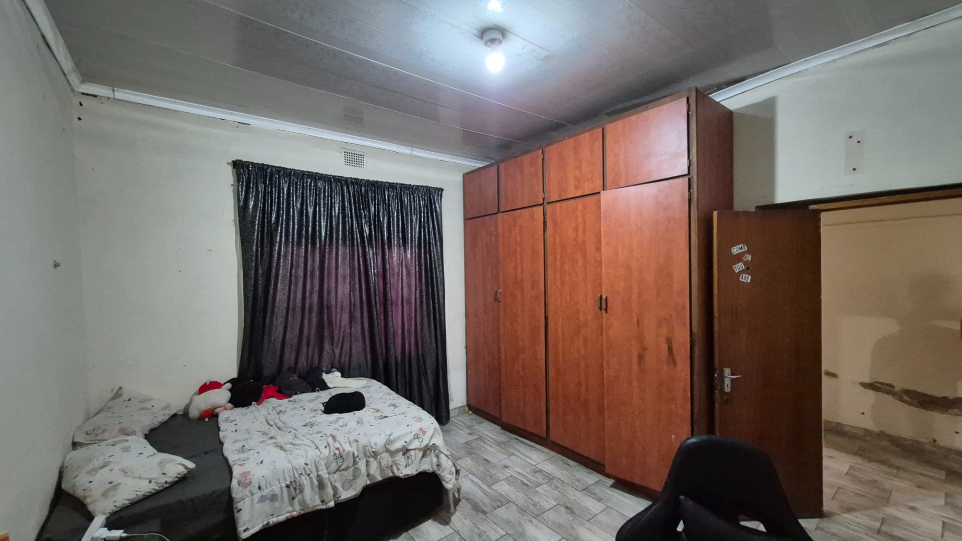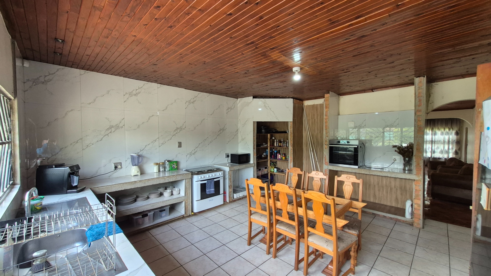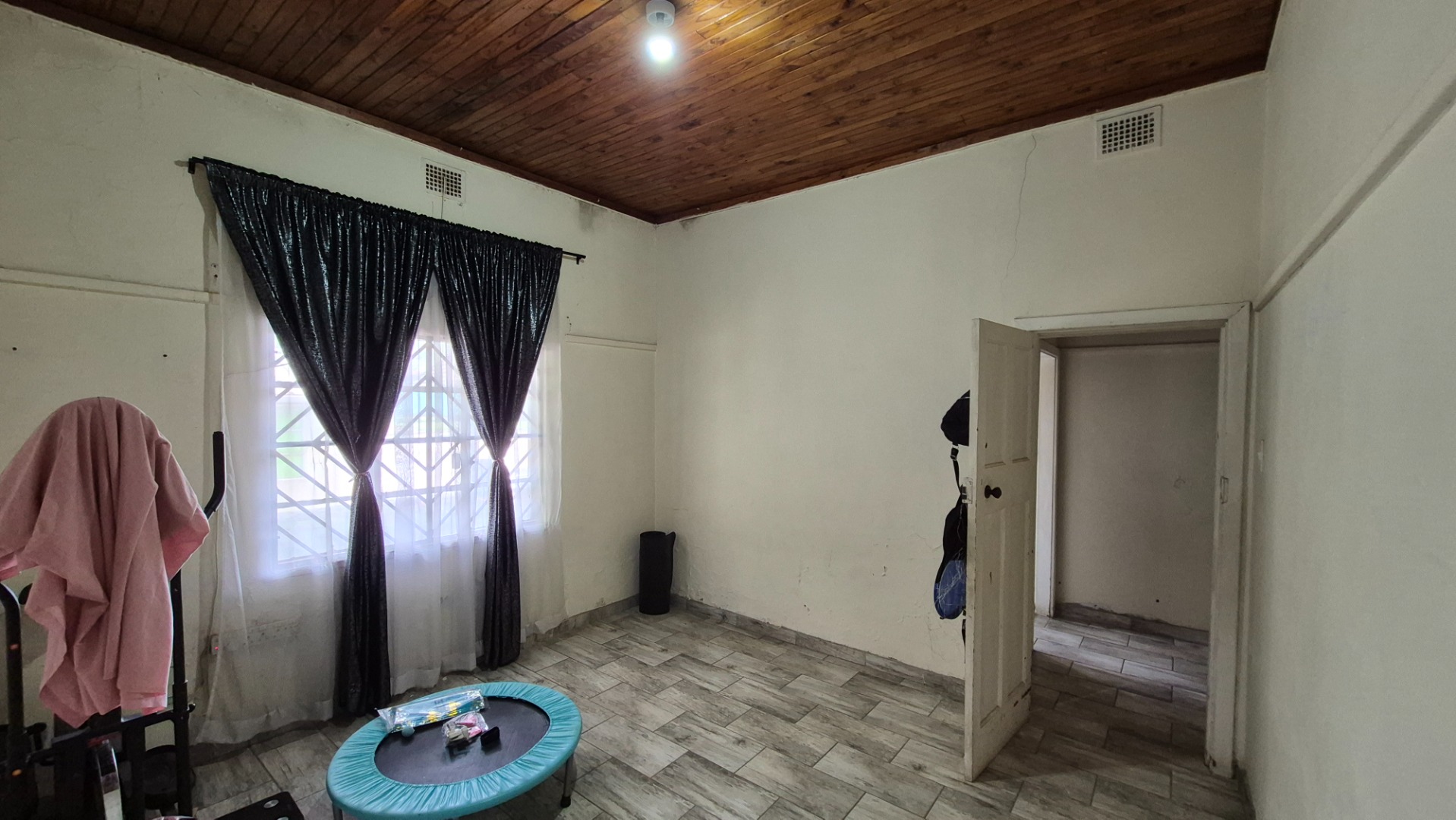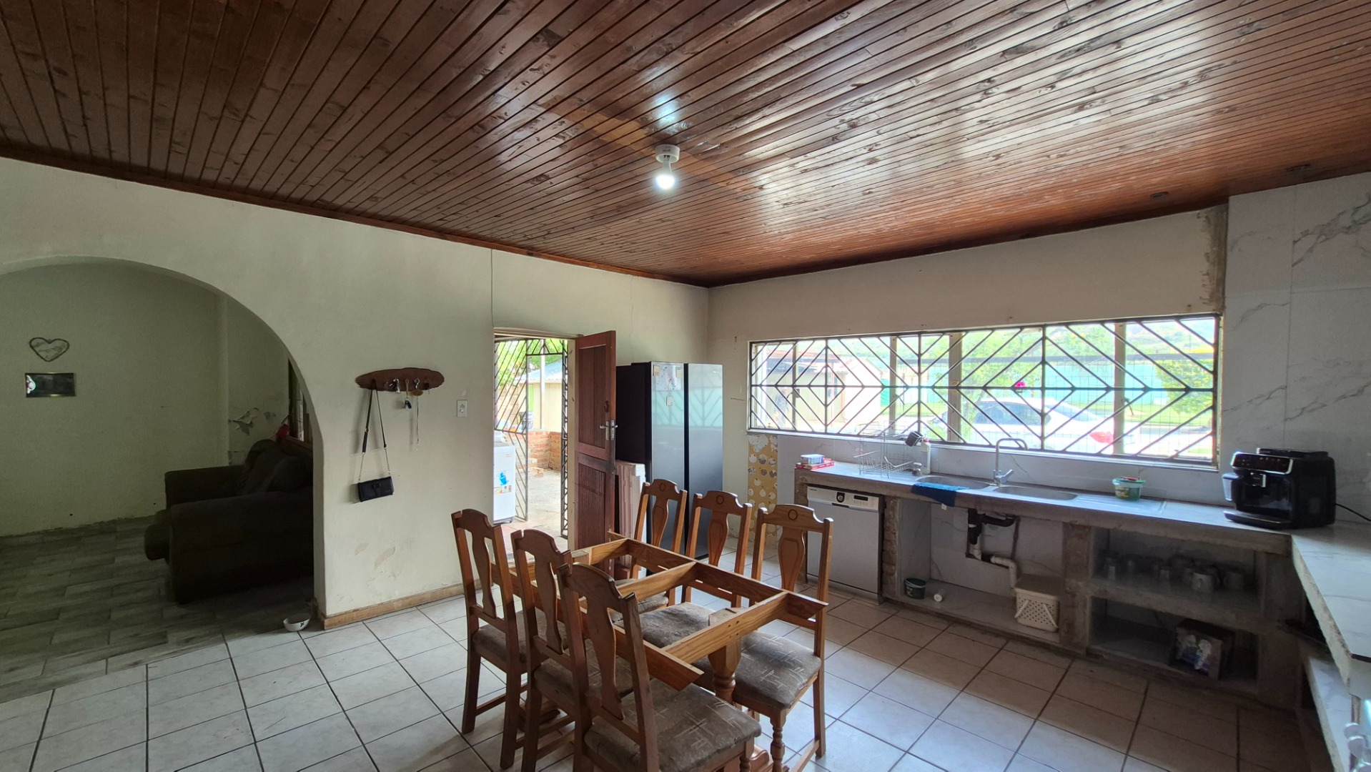 Step inside and you’ll find a spacious open-concept kitchen and dining area, perfect for family meals and entertaining. It features a lovely wooden slatted ceiling and durable tiled flooring, giving it a unique, rustic feel. The concrete countertops and open shelving offer a practical setup, ready for you to modernise and create your dream kitchen. The home offers three comfy bedrooms and a single bathroom, providing a solid foundation for comfortable living.